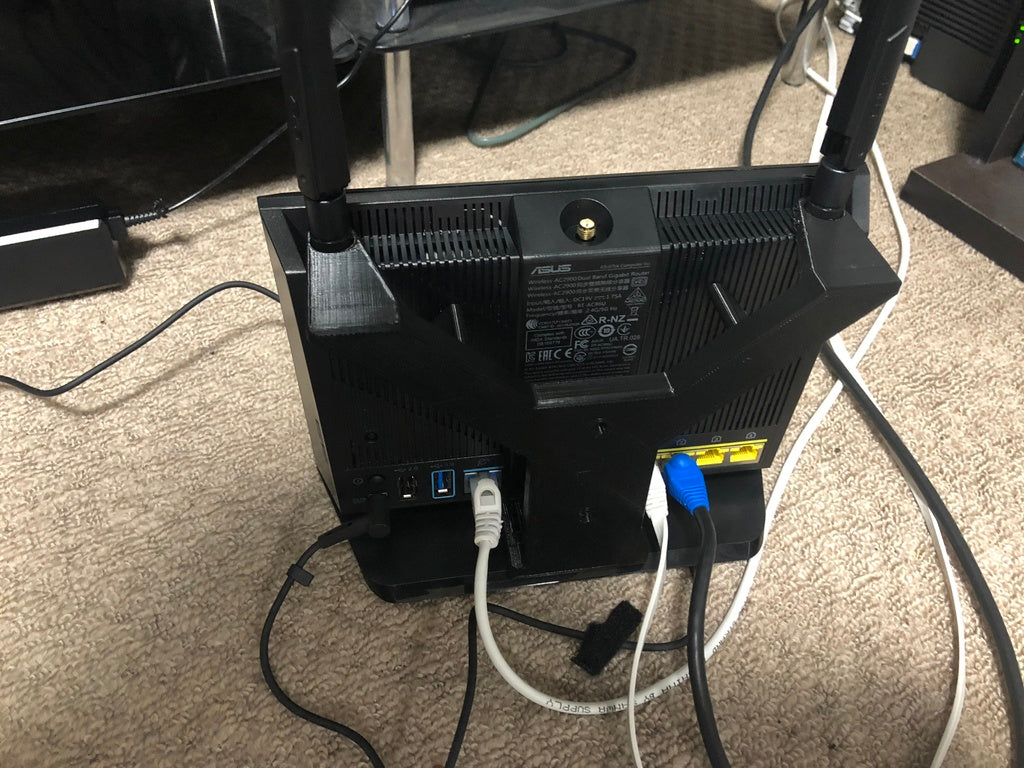 Simpelt vægbeslag/ophæng til en ASUS RT-AC86U router. Selve routeren sættes fast til ophænget via antennerne.
