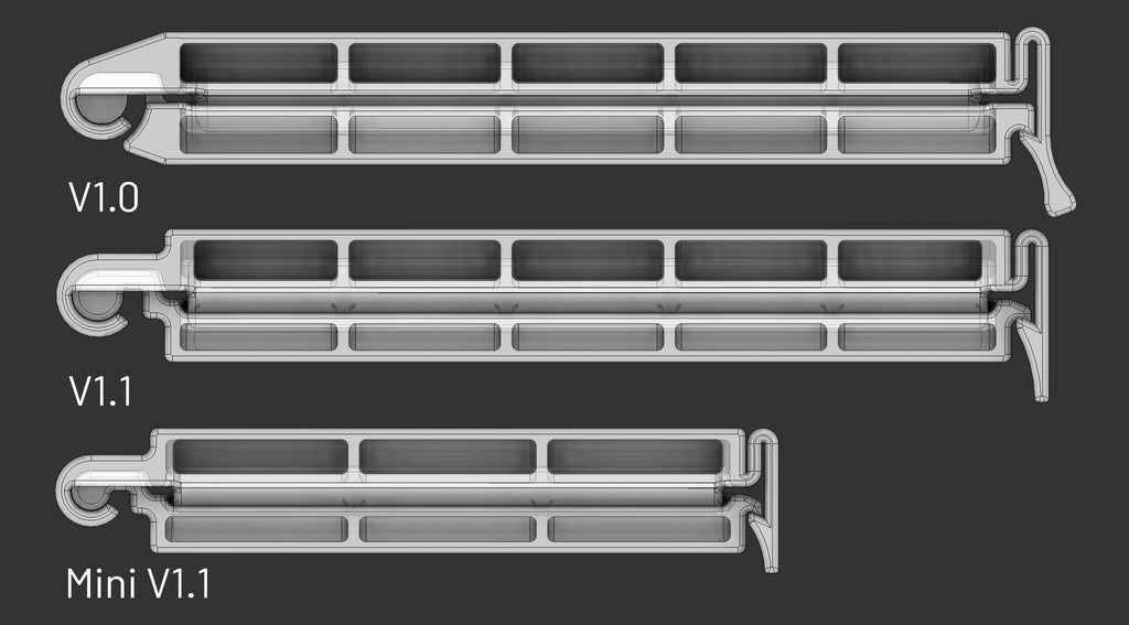 i 2021 blev en mini version tilføjet, som har en 68mm bred klampeområde, bruger cirka 50% mindre materiale end V1.1, og klemmer strammere (0.25mm hulrum vs 0.5mm) for at forsegle små og tynde poser mere effektivt.