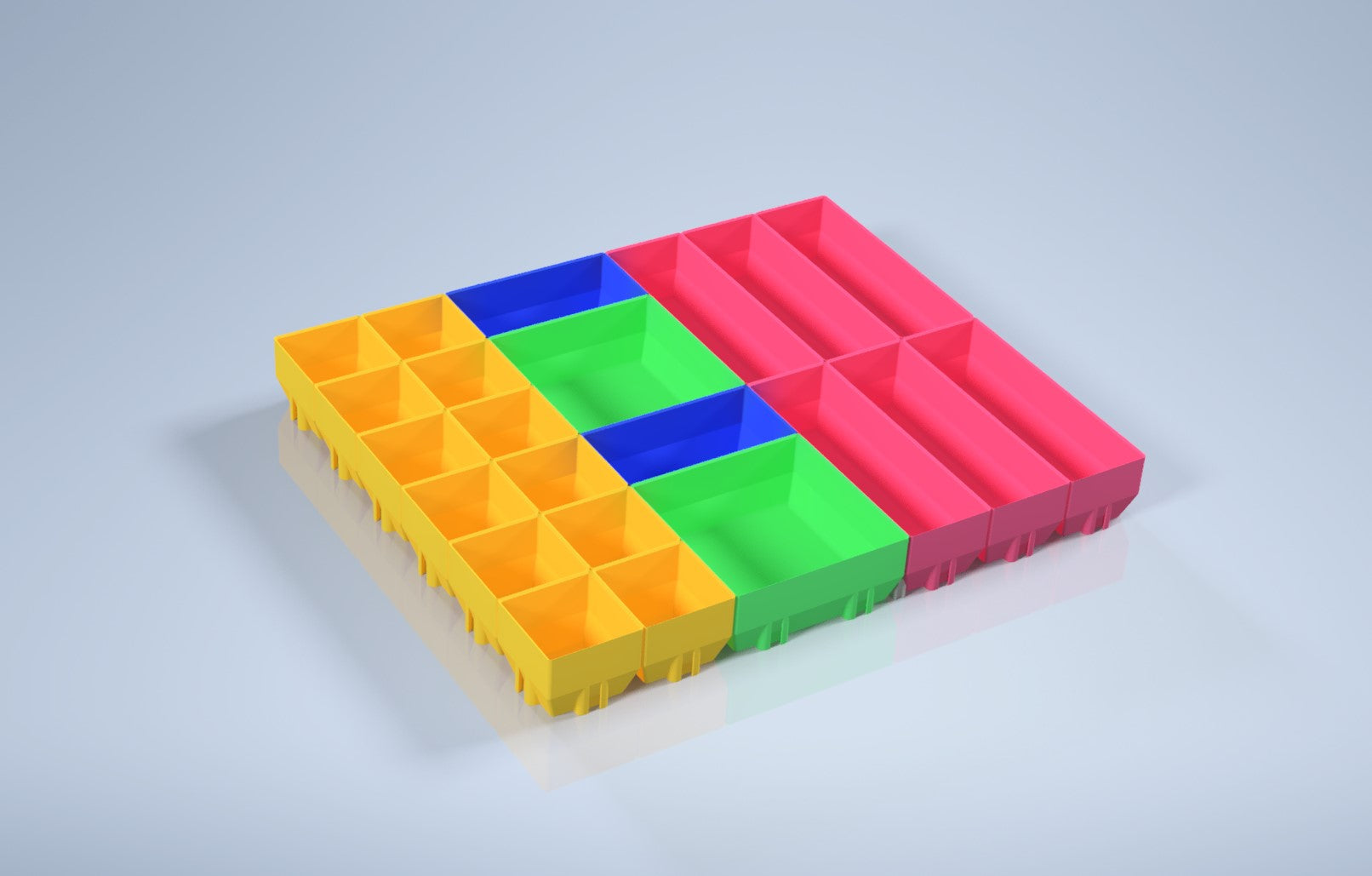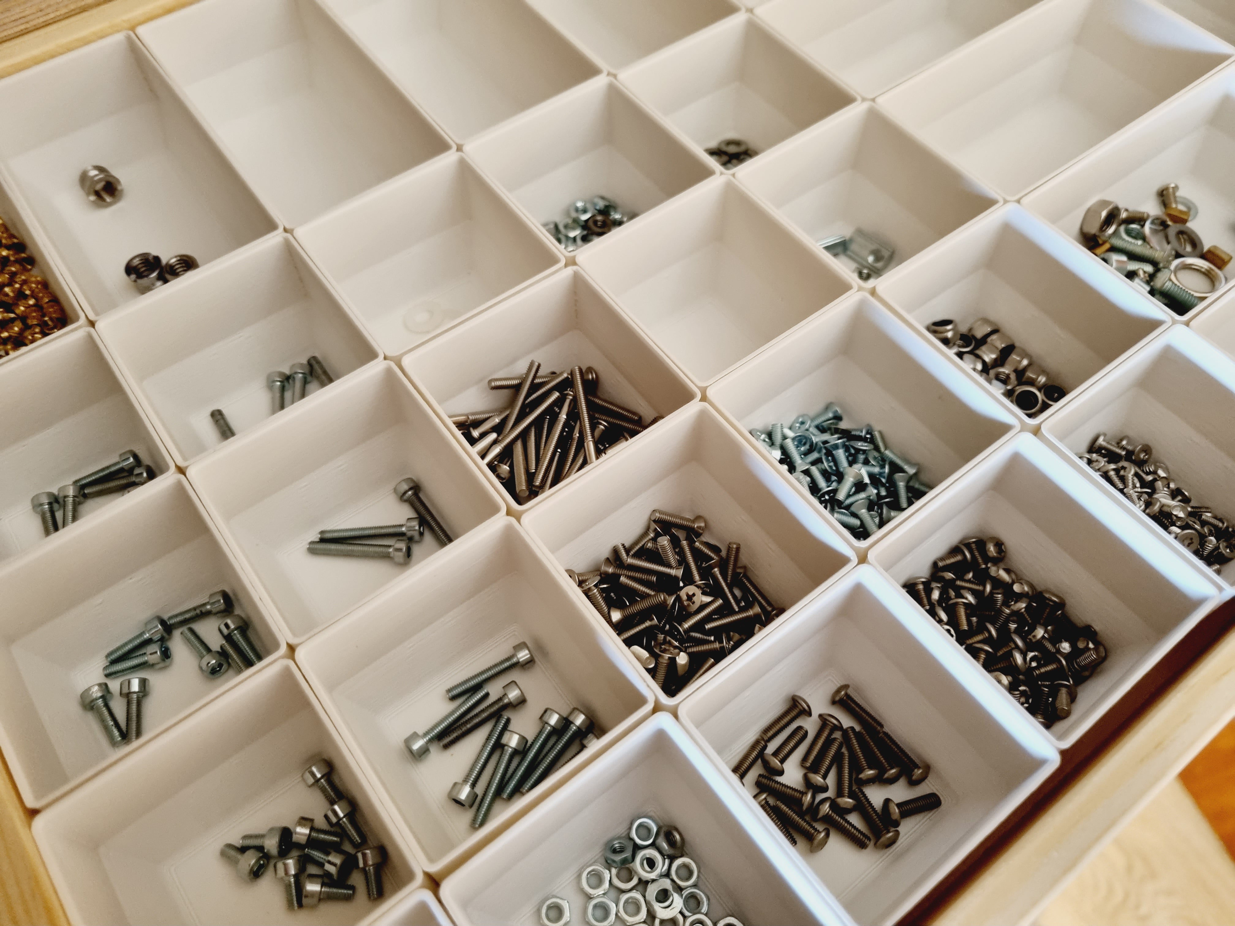 Denne lille delebeholder / skuffeorganisator er designet til at organisere din skrue- og møtrikskuffe. Den mindste er 45mm x 45mm, og de andre følger multiplerne af det: 2x1, 2x2 og 3x1. De kan forbindes med et lille stikstykke.