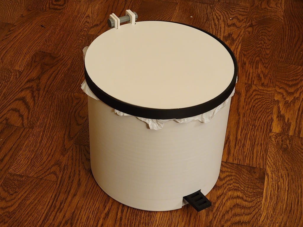 Dette er en printbar pedalbetjent skraldespand. Kapaciteten er cirka 7,5 liter / 2 gallon.
