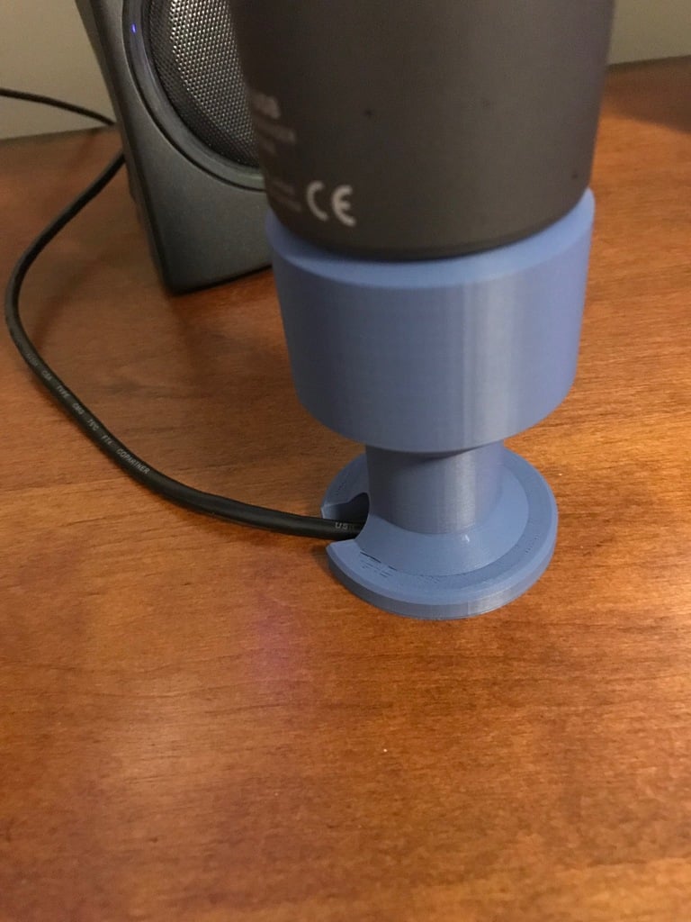Enkel AT2020 mikrofonstander. Passer pænt på skrivebordet og kan eks. placeres ude af syne for skærmene. Har en 30° vinkeltip, så den ikke vælter alt for nemt.