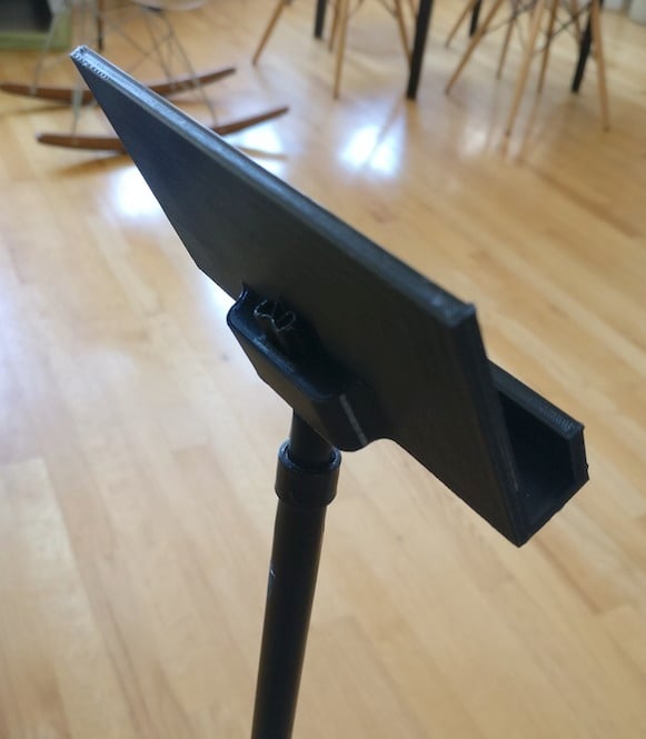 En minimalistisk iPad/tablet montering til "Hamilton"-stil wire musikstandere. Der er en port i bunden til opladning af tabletten, og en hak til at få adgang til hjemmeknappen. Denne montering er kompatibel med en iPad Air i et Apple læder etui, men andre tablets skulle også passe fint.