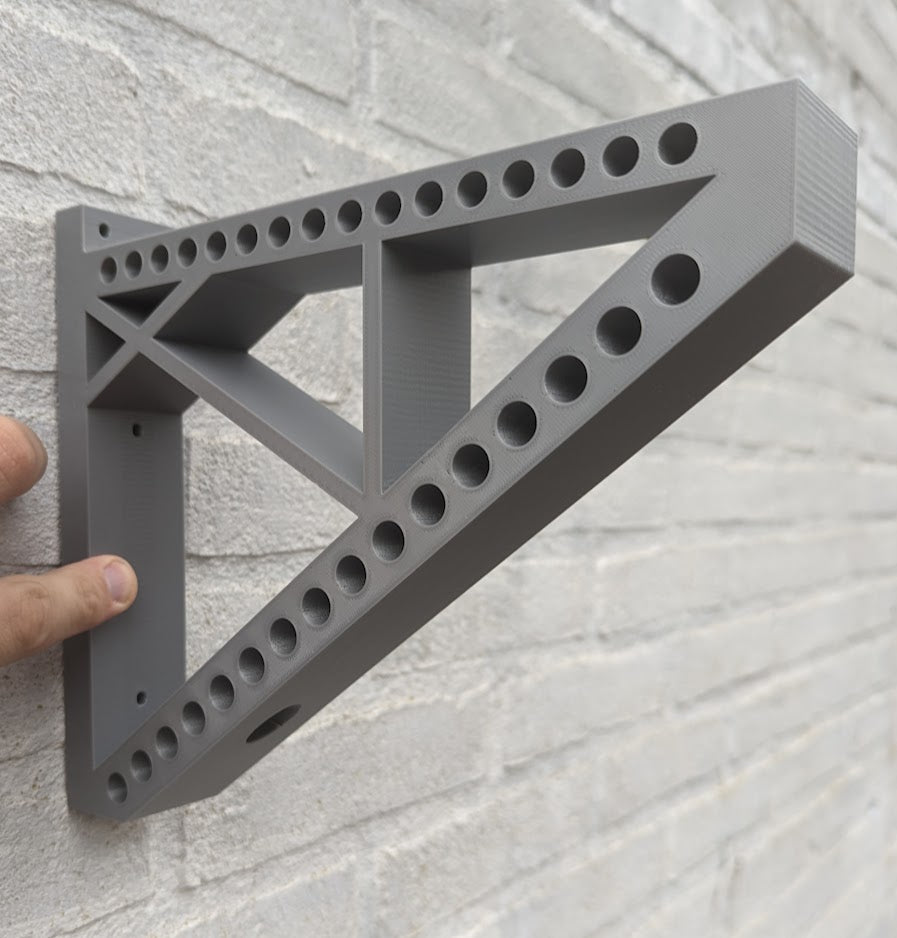 Du har også mulighed for at tilføje printede hyldebeslag, som giver en stabil understøttelse af dine hylder. Dette væganker er ideelt til at skabe organiseret plads i ethvert rum, fra stuen til værkstedet, og kan bære alt fra bøger og opbevaringskasser til dine favorit pyntgenstande og dekorationer. Den multifunktionelle konstruktion med ekstra huller giver desuden mulighed for fremtidige tilpasninger, eksempelvis fastgørelse af reb fra loftet til sikring af længere genstande som stænger eller planker.