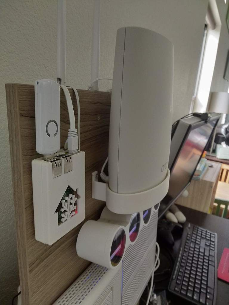 Simpelt vægbeslag til Netgear Orbi RBR50 og RBS50. Har et åbent gitter i bunden for at optimere ventilationen til routeren.