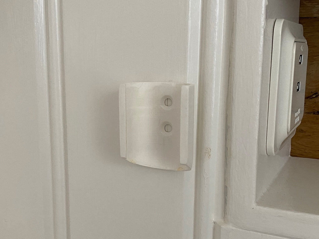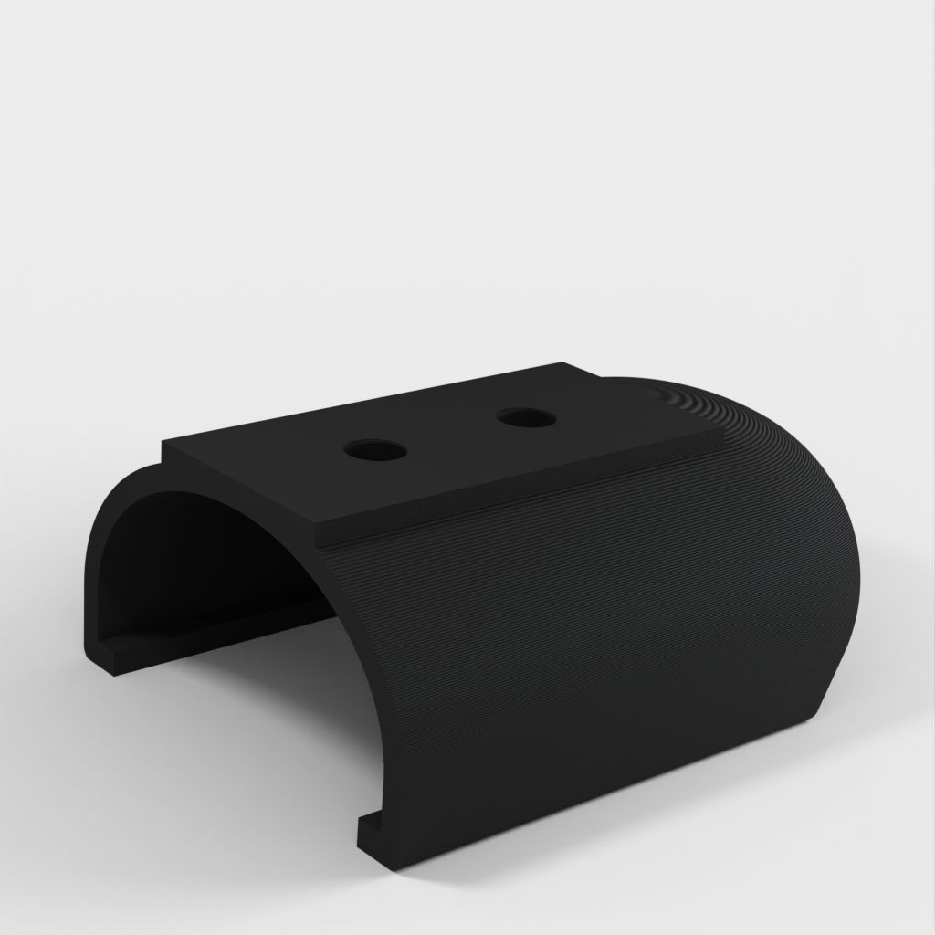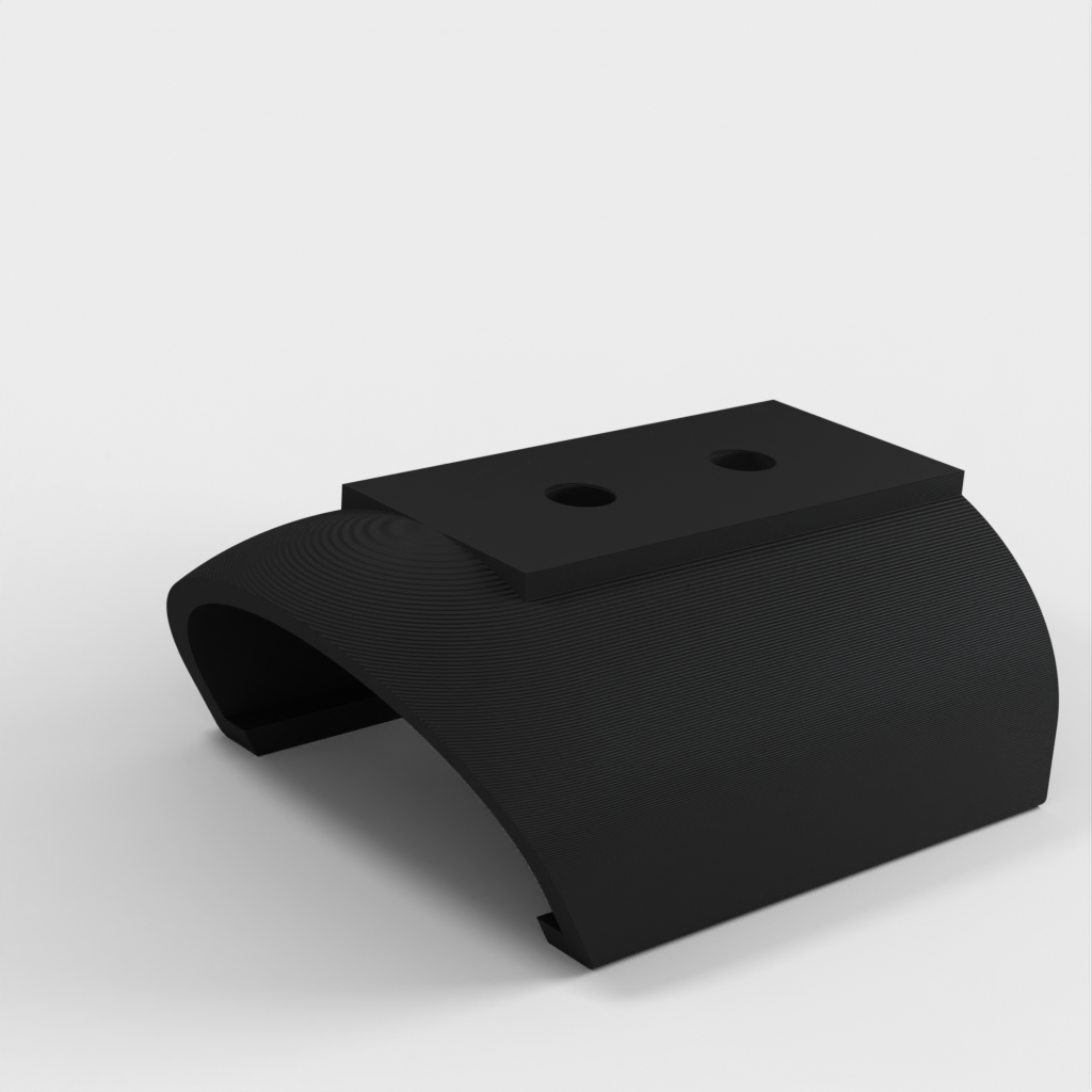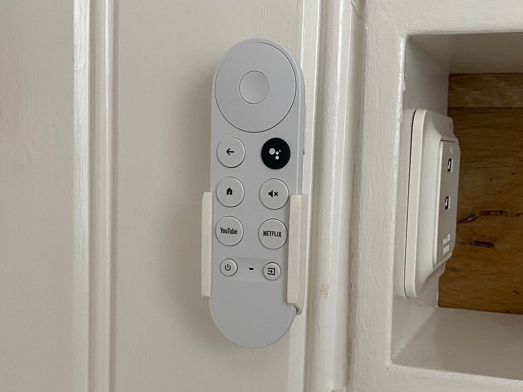 Holder til en Chromecast med Google TV fjernbetjening. Du indsætter fjernbetjeningen ved at skubbe den ind fra toppen. Den nederste del er bredere for at forhindre den i at glide igennem. Dette gør det nemt at indsætte og fjerne fjernbetjeningen. Holderen er designet til at blive monteret på væggen med skruer eller dobbeltklæbende 3M tape for en robust og sikker montering.