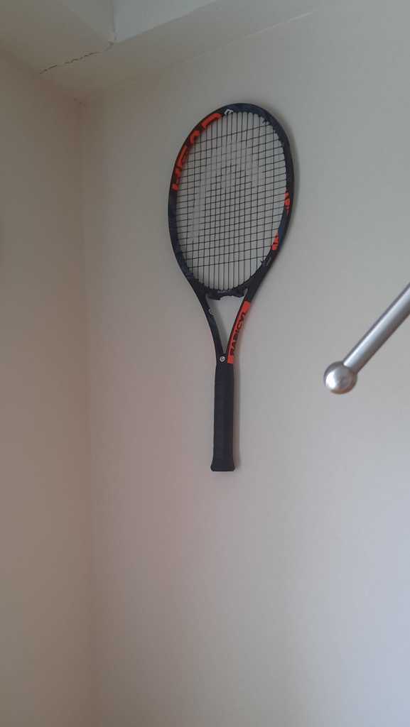 Dette er en lille holder beregnet til din tennisketsjer. Holderen kan monteres direkte på væggen ved hjælp af 4 skruer. Du kan let placere din tennisketsjer i holderen, hvilket gør dit rum mere ryddeligt og organiseret.