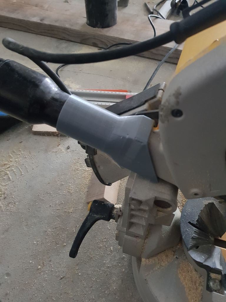 Dette er en 3d printet adapter til at forbinde din støvsuger slange til din Dewalt 707 geringssav. Tilslutningen til støvsugerslangen er baseret på et konisk rør med en diameter på 34 til 36 mm over en længde på 50 mm.