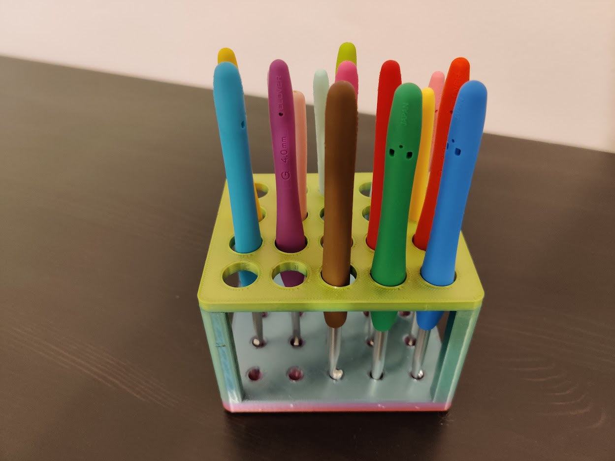 Organiser din arbejdsstation med denne smarte opbevaringsløsning til dine hæklenåle og penne. Dette praktiske holder er designet til at holde dine værktøjer sikkert på plads, så du nemt kan finde dem, når du har brug for dem. Det er den perfekte deskorganizer til både hobbystuderende og professionelle, der arbejder med garn og syting.
