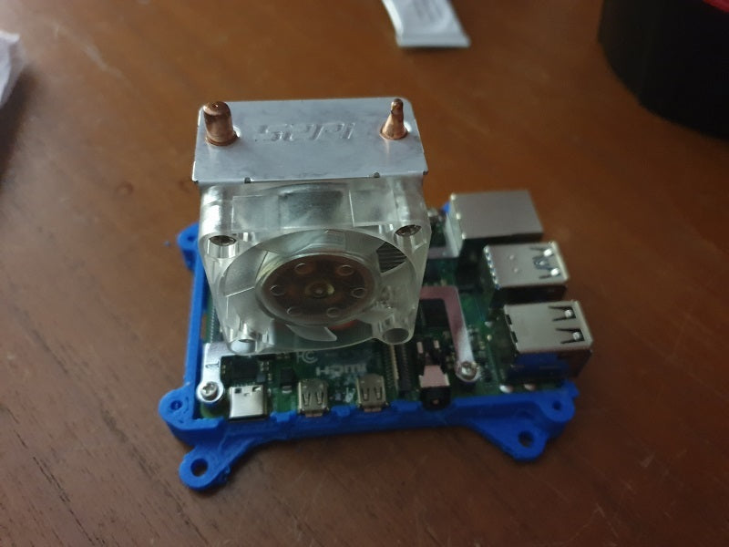 Dette er en modificeret version af Patrick Lammer's etui til Raspberry Pi 4, tilpasset for at rumme en Ice Tower-køler. Kølerens afstandsholdere er vendt og skruet fast til etuiet, nødderne bruges ikke længere. Oprettet ved at modificere den øverste del af etuiet, mens bunden er den originale udformning af Patrick.