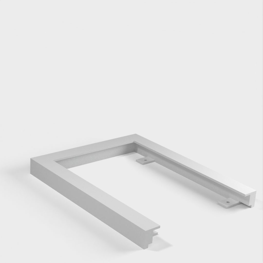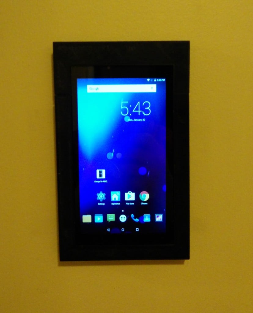 Dette er en vægmontering til en tablet. Den omslutter alle fire sider, og toppen glider af og på for adgang til USB, tænd-/sluk-knap osv. Jeg har en 7" Android tablet, der kører en app kaldet "Always On" til konstant at vise tiden, og alt jeg skal gøre er at dobbelttappe for at tænde den.