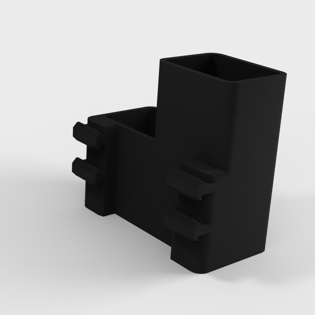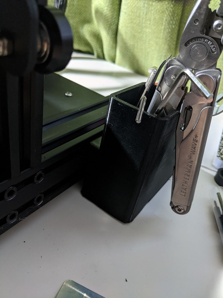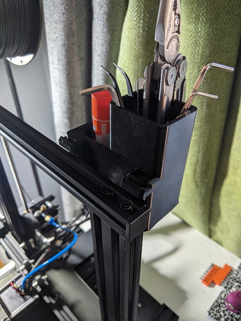 Forbedr din 3D-printer-opsætning med denne praktiske værktøjsboks, der er designet specifikt til Ender 3 V2. Denne smarte opbevaringsløsning passer perfekt til standard aluminiumsprofiler og kan nemt monteres på siden eller toppen af din printerramme. Den giver rigelig plads til at opbevare essentielle værktøjer som en Leatherman Wave+ og andet småt tilbehør, så du altid har det lige ved hånden. Værktøjsboksen hjælper med at holde dit arbejdsområde organiseret og effektivt, hvilket optimerer din arbejdsgang. For optimal holdbarhed kan den med fordel fremstilles i PETG.
