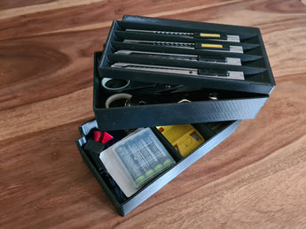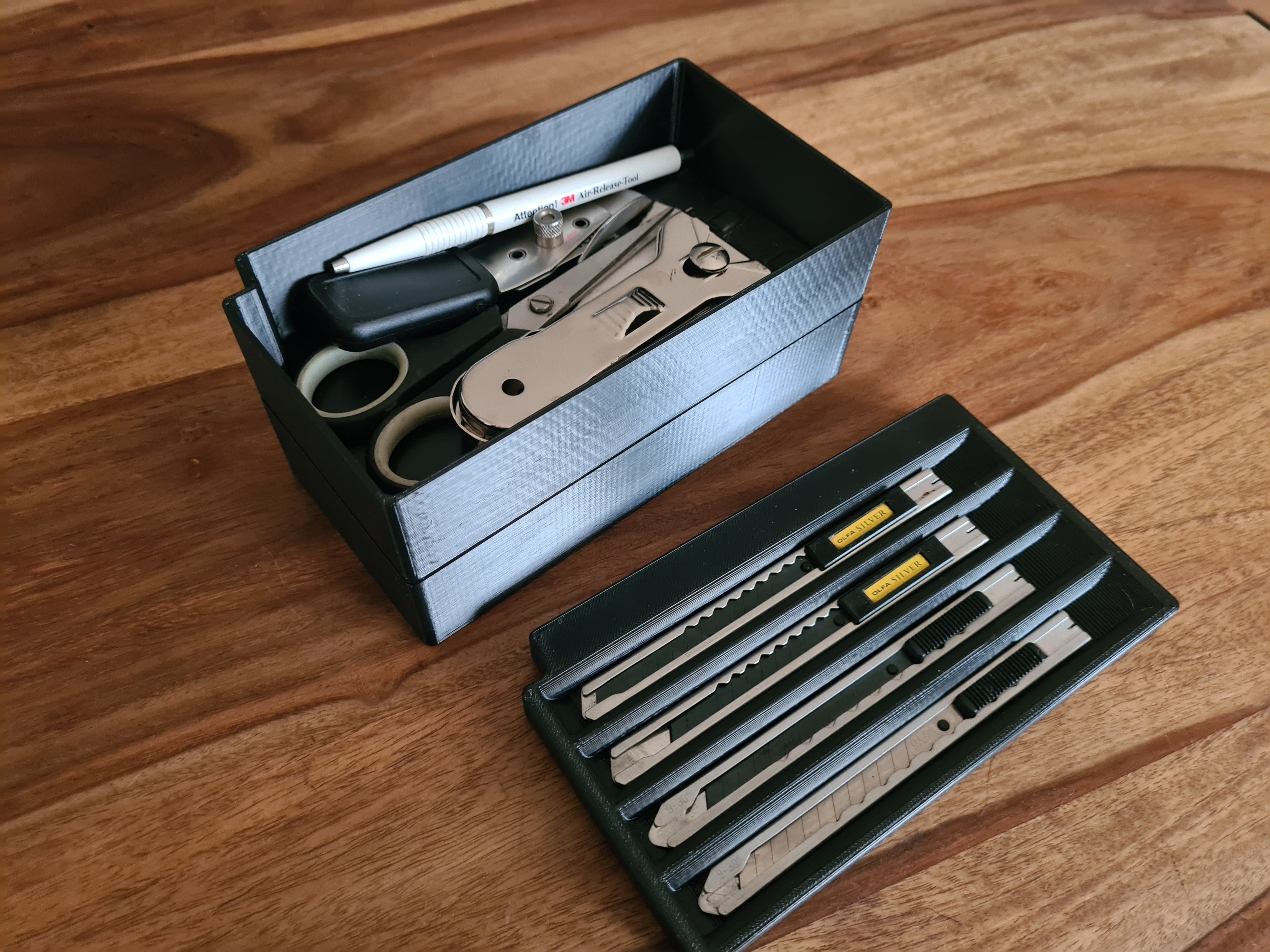 Kassen er opdelt i praktiske rum, hvoraf et er dedikeret til din cutterkniv for hurtig og sikker adgang. Derudover indeholder den to yderligere opbevaringsrum, der er ideelle til organisering af reservelade, barberblade, små batterier eller andre lignende forbrugsvarer. De nederste modulære bokse kan rumme yderligere specialværktøjer, hvilket bidrager til et ryddeligt og effektivt arbejdsområde.