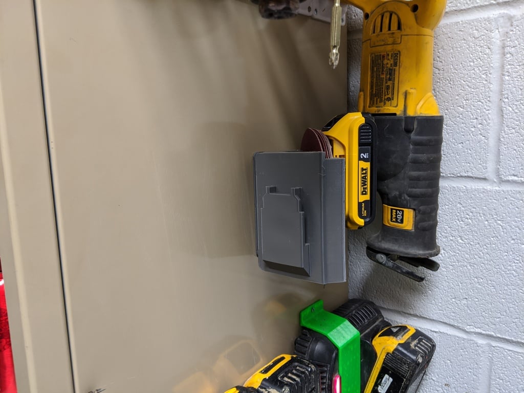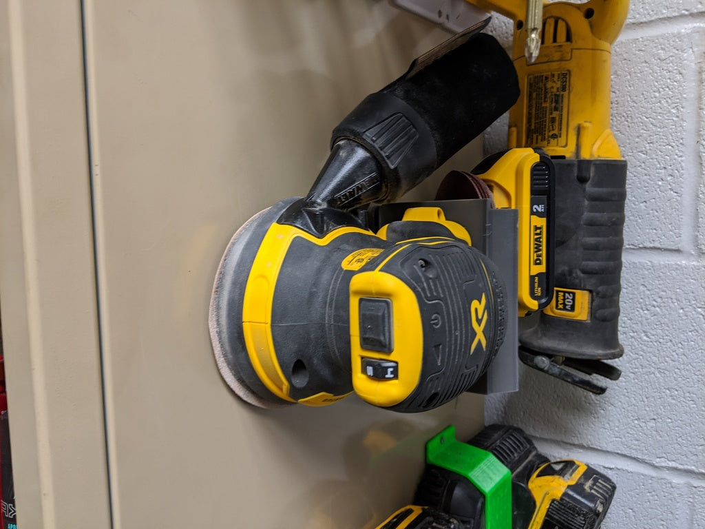 Det er en 90° monteringsstøtte til Dewalt Orbital Sander. Dette produkt er designet med en bagmonteret Dewalt 20v batteriholder og mellemrum til opbevaring af sandpapir.
