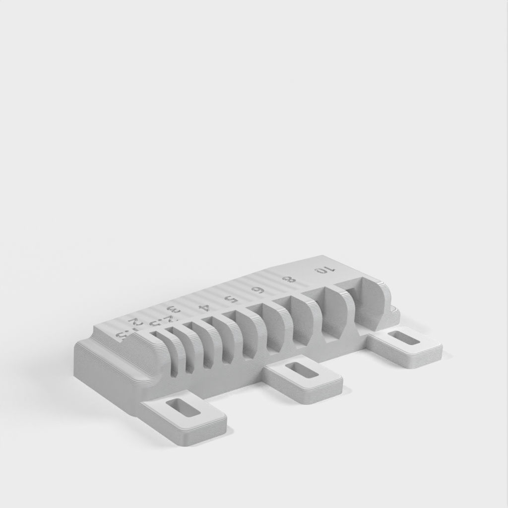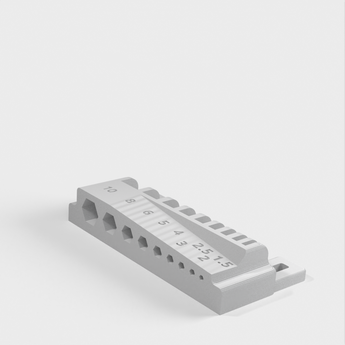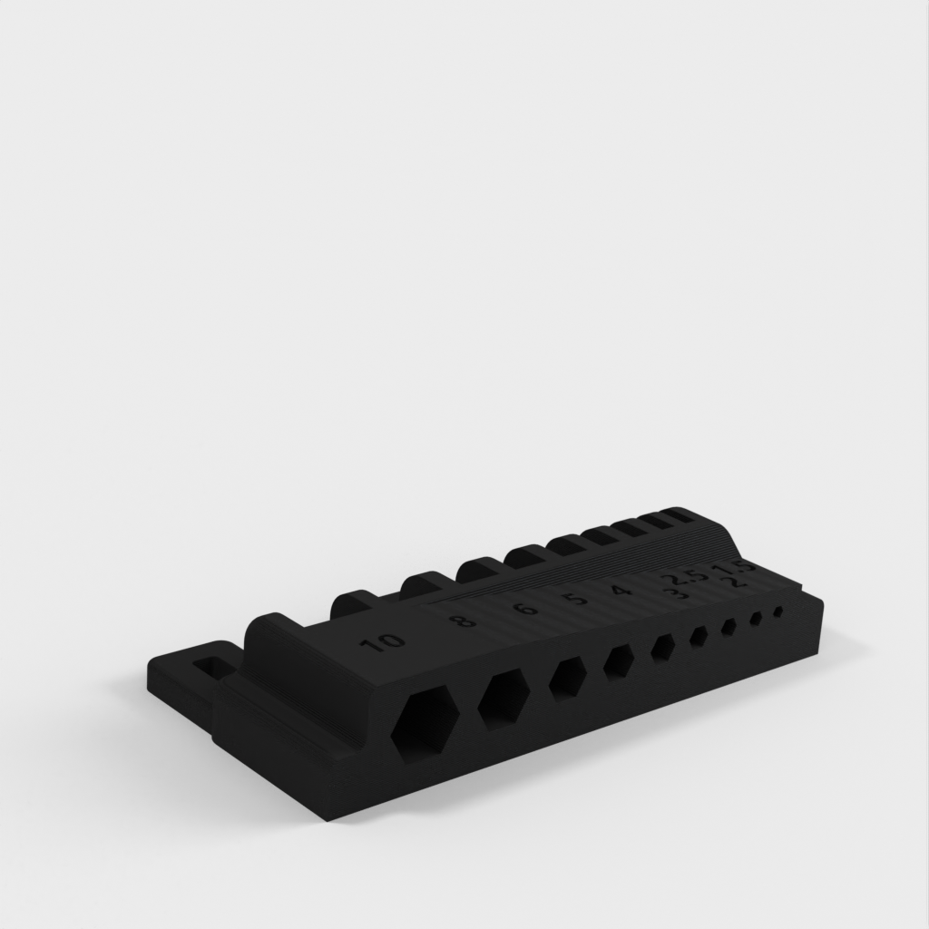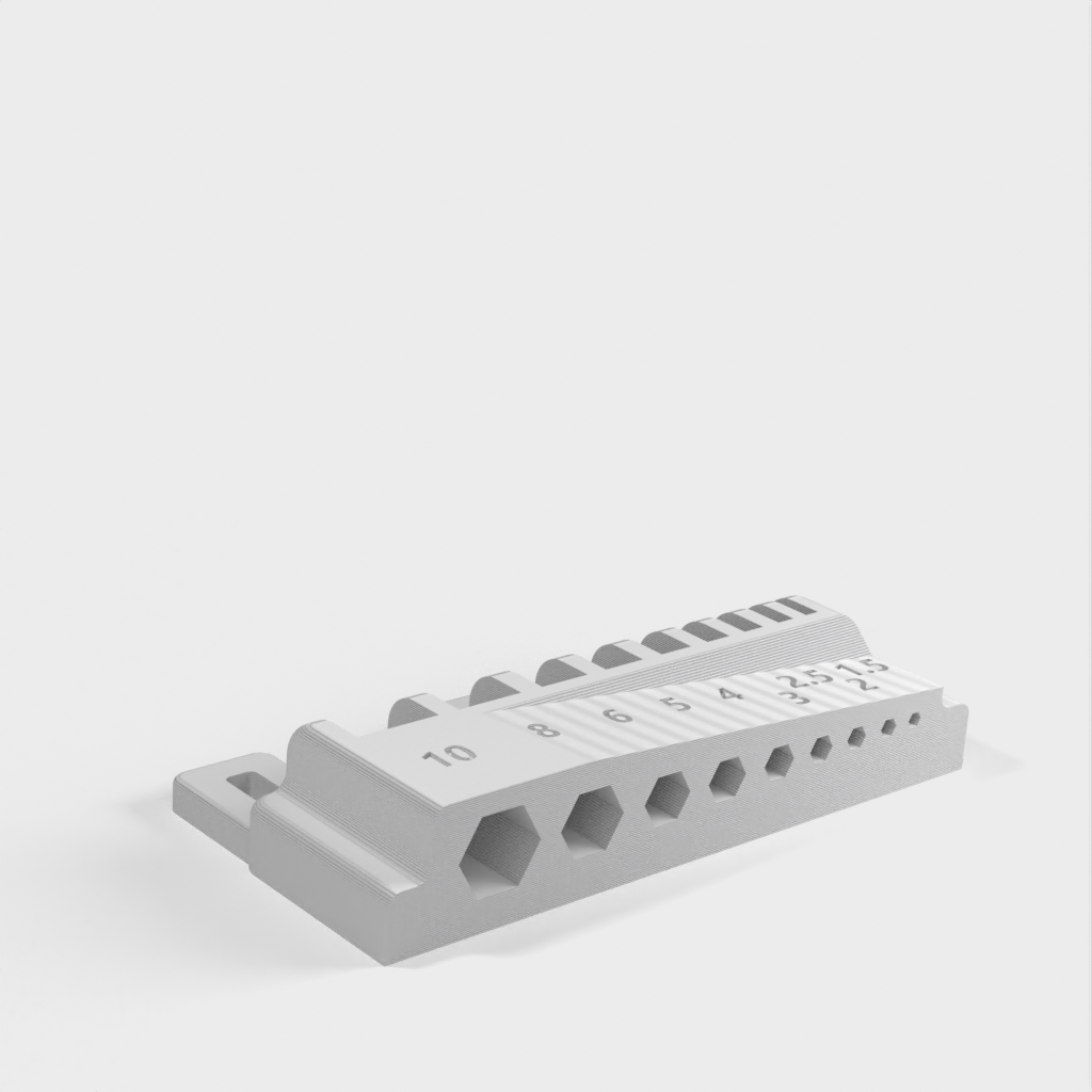 Hex key holder Skadis er et sæt nøgleholder designet til at klare hex nøgler. Det har numre til at angive størrelserne for nem identifikation og lægges nemt på ethvert IKEA Skådis/Skadis panel. Dette design er lidt mere fancy, da nogle af forsiden er skåret af i en vinkel for at spare noget materiale.