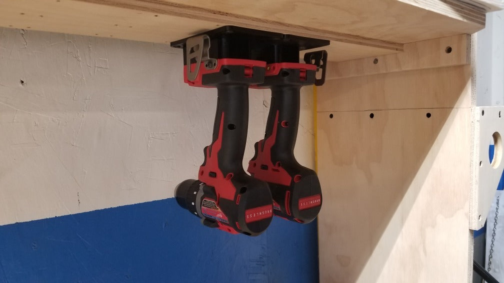 Simpelt væg- og loftophæng til et Milwaukee M18 værktøj. Ophænget benytter hullet til batteriet og værktøjet sættes derfor nemt op på ophænget.