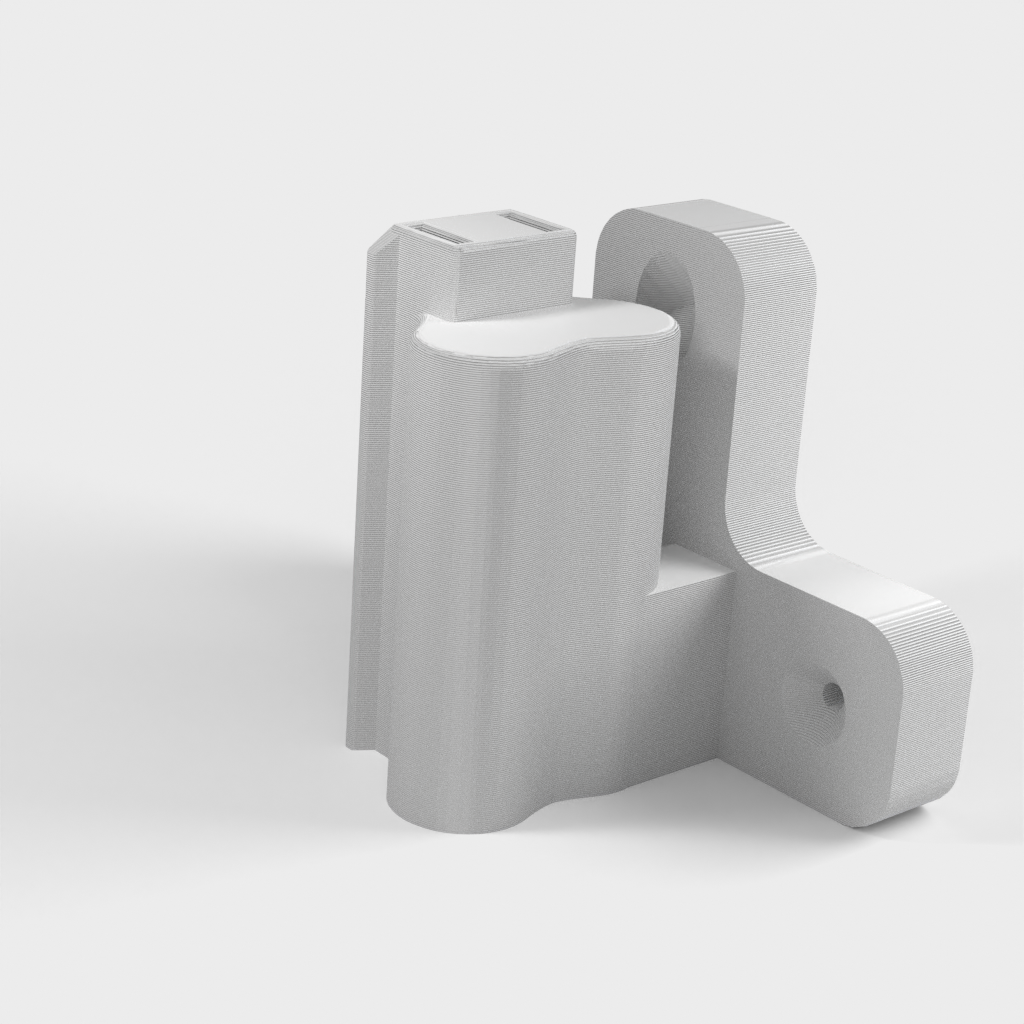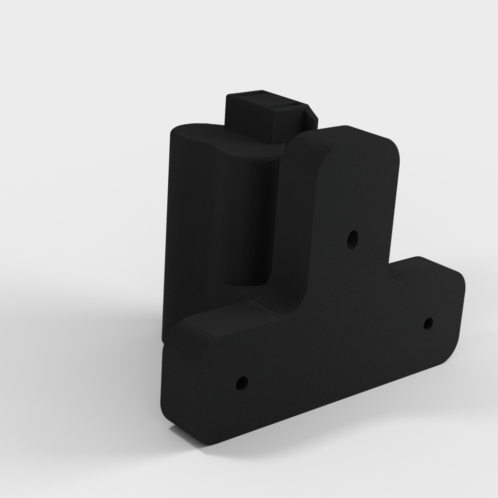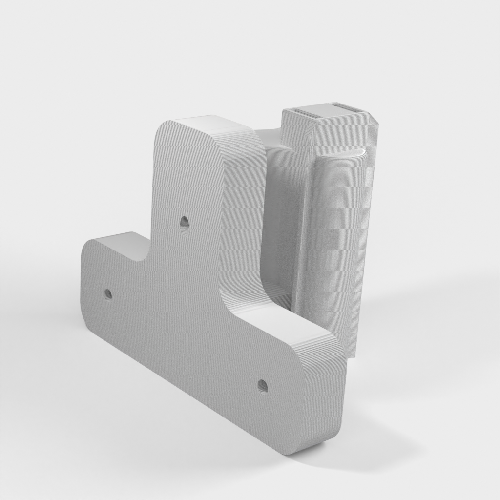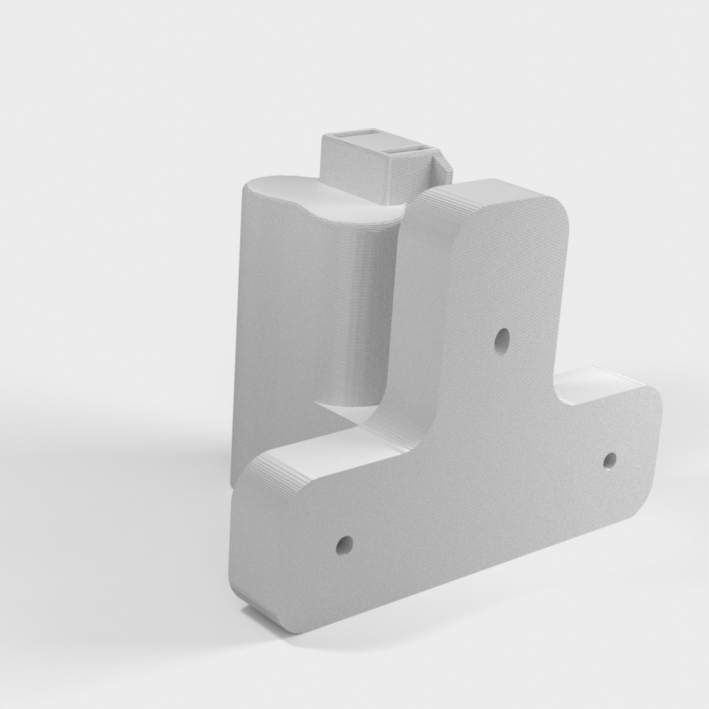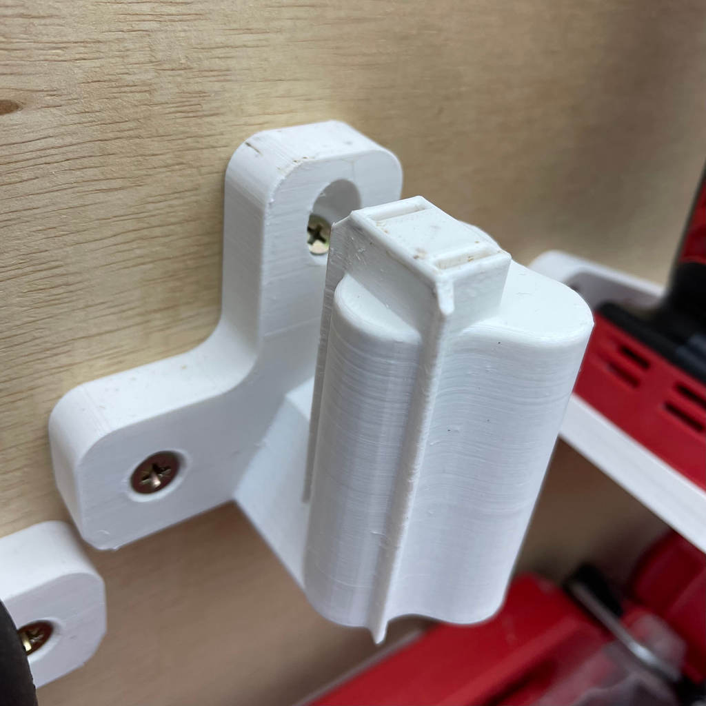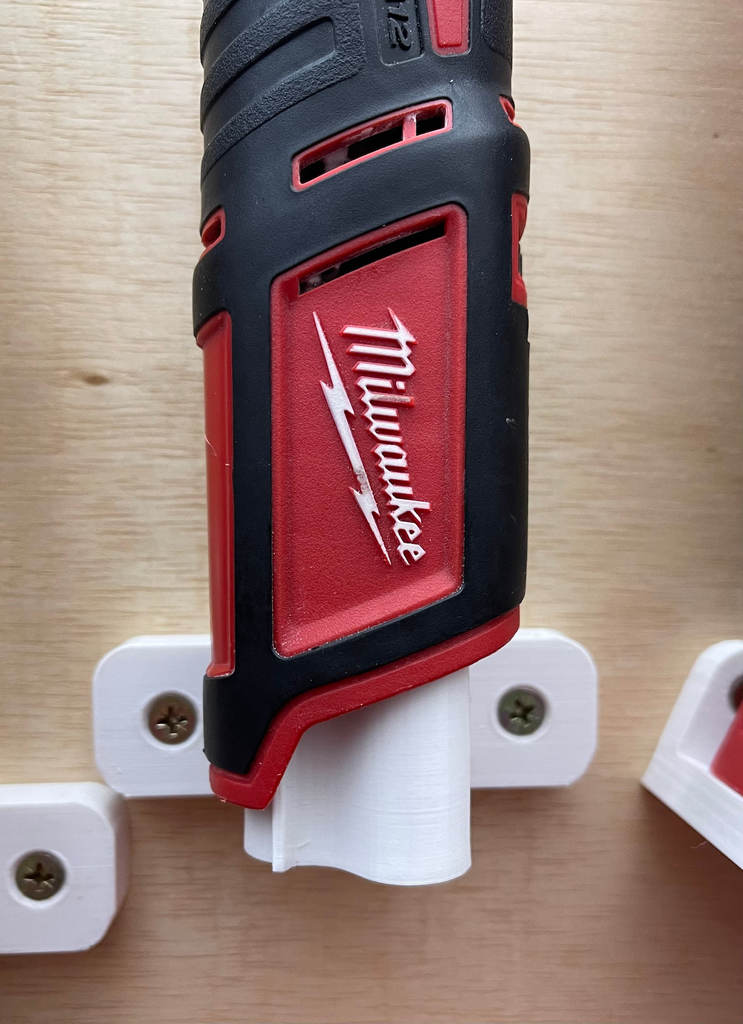 Dette er en vægmontering til Milwaukee M12 værktøjer. Hovedforbedringerne inkluderer roteret holder med 90 grader, så værktøjet nu er parallelt med væggen, det er monteret på. Dette tillader større værktøjer at blive monteret. Derudover er væghøjden øget for mere støtte og nemmere adgang til topskruen. Endelig er diameteren på topskruen forøget, og skruen synker nu helt ind.