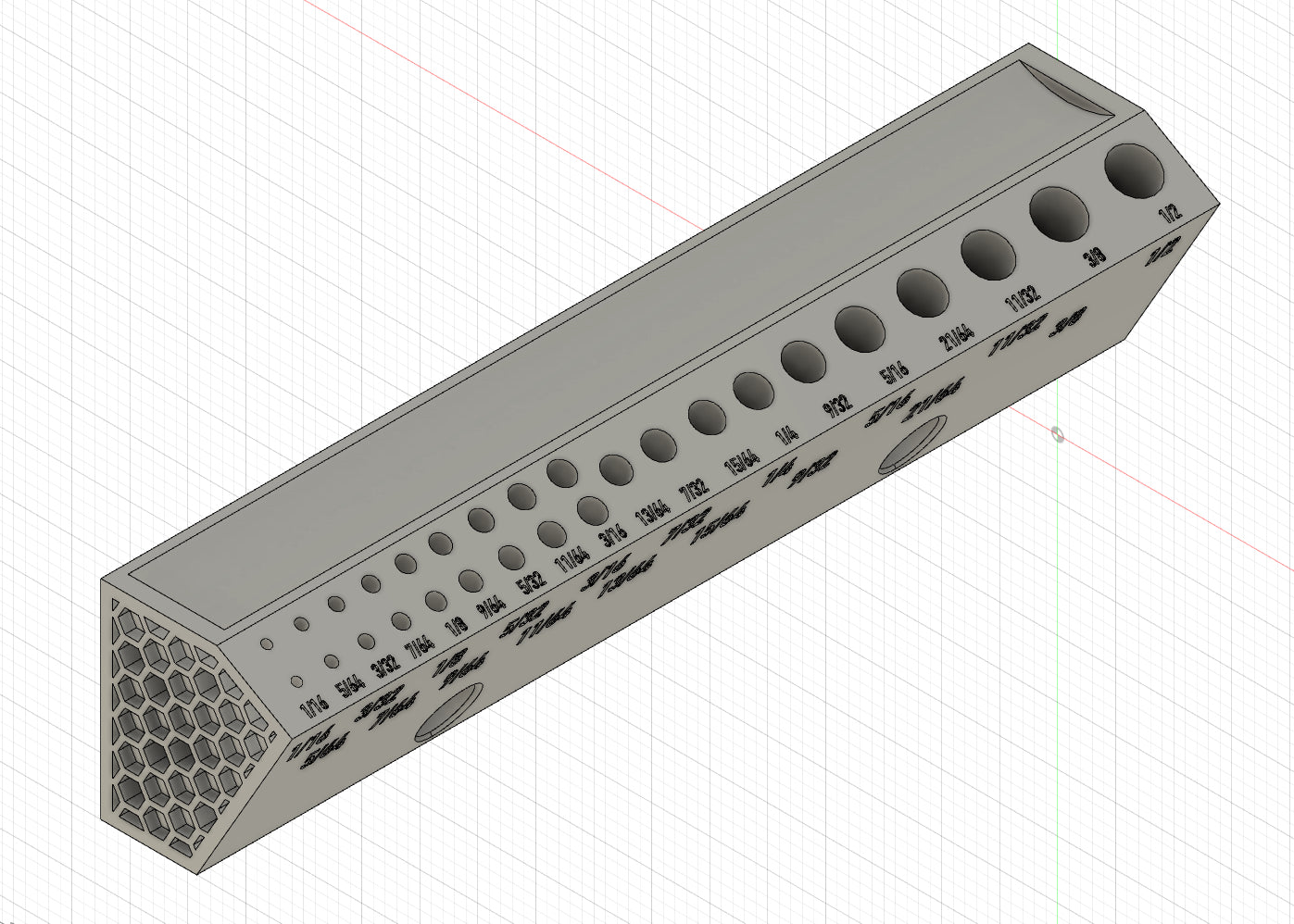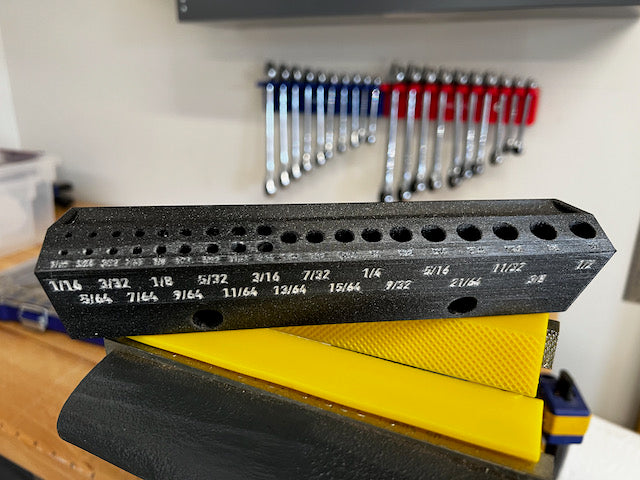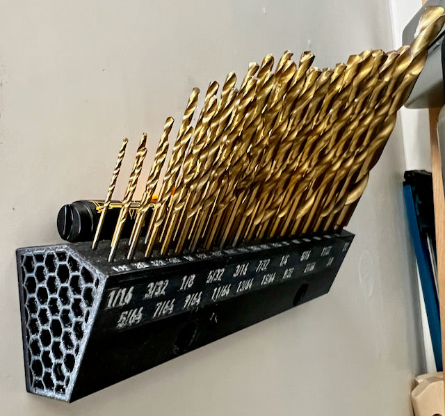 Dette er en kompakt, vægmonteret borebitsholder til bits i størrelserne 1/16" til 1/2" i 1/64" stigninger. Holderen måler 8" i længden og holder bits i en 30º vinkel for hurtig og nem adgang. For mindre bitstørrelser (1/16" til 3/16") er der to spor, så du kan have en ekstra bit i nærheden, hvis en går i stykker. Bag bitsene er der en nedsænket bakke til opbevaring af penne, blyanter eller endda yderligere bits, som du bruger under et projekt.