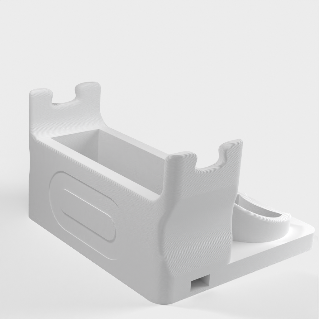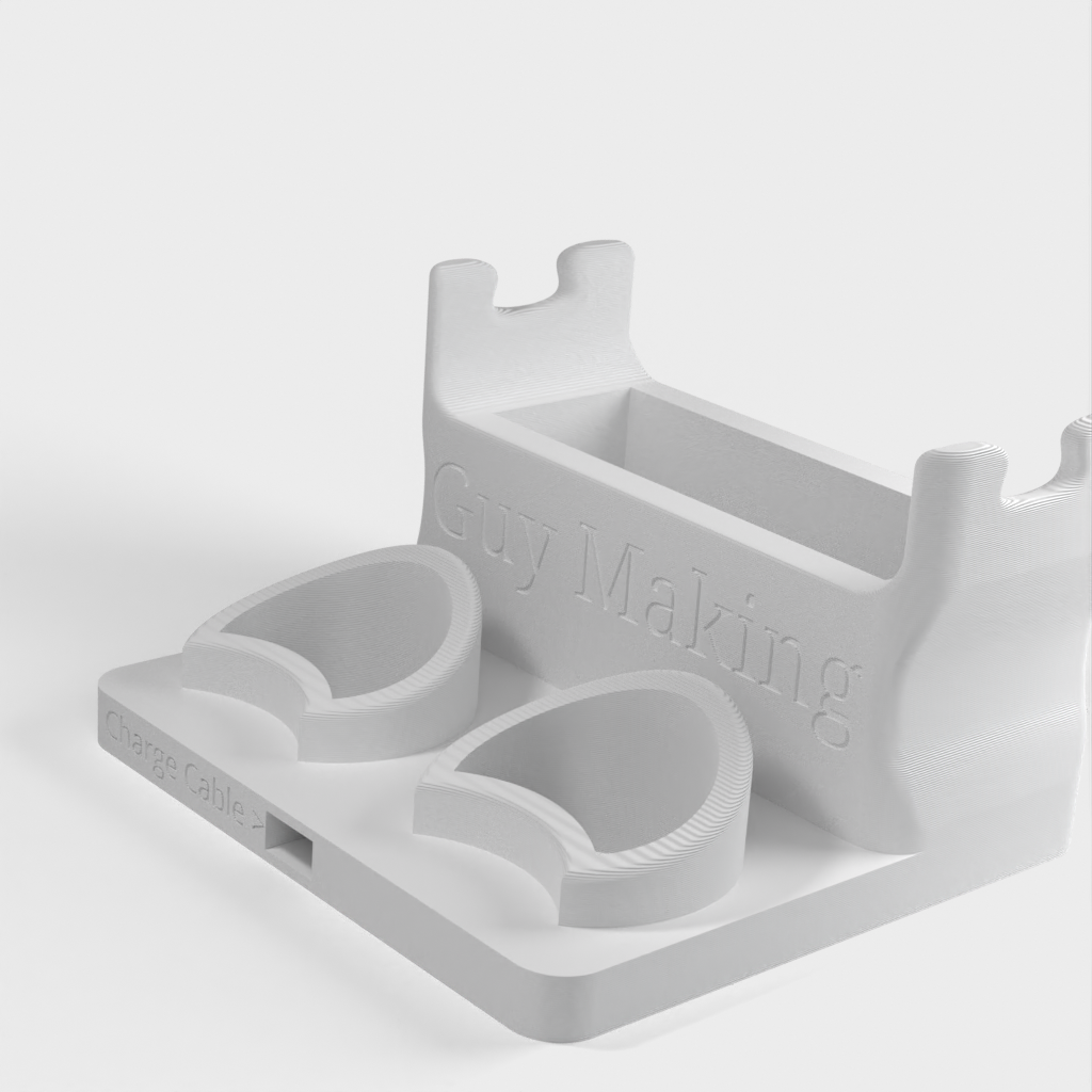 Dette er en stand til en Oculus Quest, der giver et hjem til dit headset samt controllere. Den har et hul til dit ladekabel og en åbning i toppen til opbevaring af diverse tilbehør.