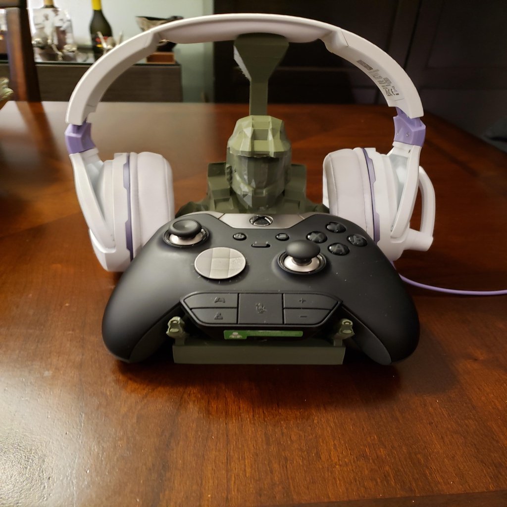 The stand depicts the legendary Master Chief, adding a unique and thematic touch to any gamer setup. It is made from ESun PLA+ in a subtle olive green colour that complements the military aesthetic of the Halo universe. In addition to being a functional piece of gaming accessory, it also serves as a decorative element that clearly shows your passion for the Halo series. The holder ensures that both your controller and your headphones are securely placed, ready for your next adventure.