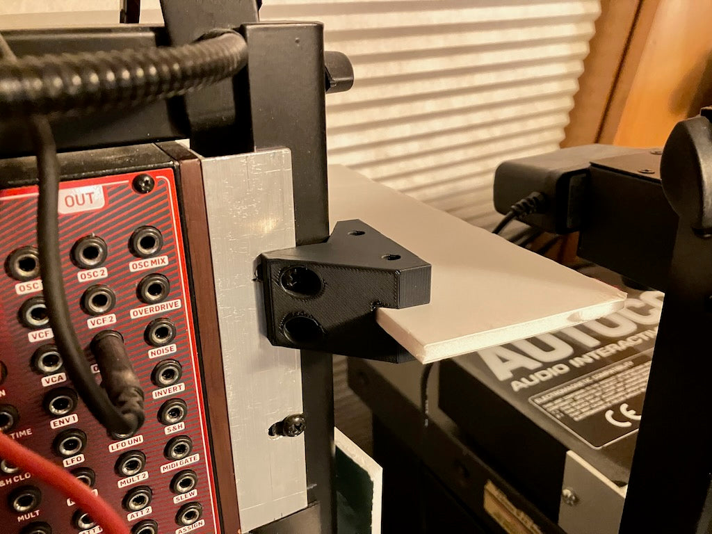 To attach your flat material shelf, you can use glue, screws, or simply drill holes in the material according to the pattern on the bracket and insert approx. 5mm dowels as pins. The width of your shelf material should be around 428mm for a 19" rack, but racks are notoriously variable, so measure after you have installed the brackets or cut longer and trim down as necessary.