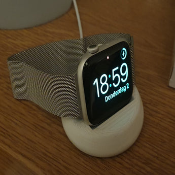 This simple charging stand is designed to provide a firm and secure place for your Apple Watch while charging. The stand holds your watch at an optimal angle, allowing you to easily see the screen while it charges. With its minimalist design, the charging dock discreetly fits into any room, whether on a nightstand or a desk. It is a practical and stylish solution for keeping your Apple Watch organized and ready for use.