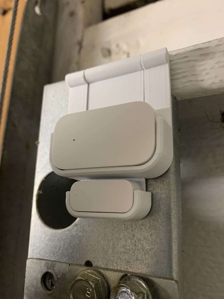 This is an Aqara contact sensor bracket for your garage door. This simple solution helps monitor the status of your garage door. Everything fits together with pressure and the Aqara contact sensor stays in place. You just need a command strip to attach it to your garage door.