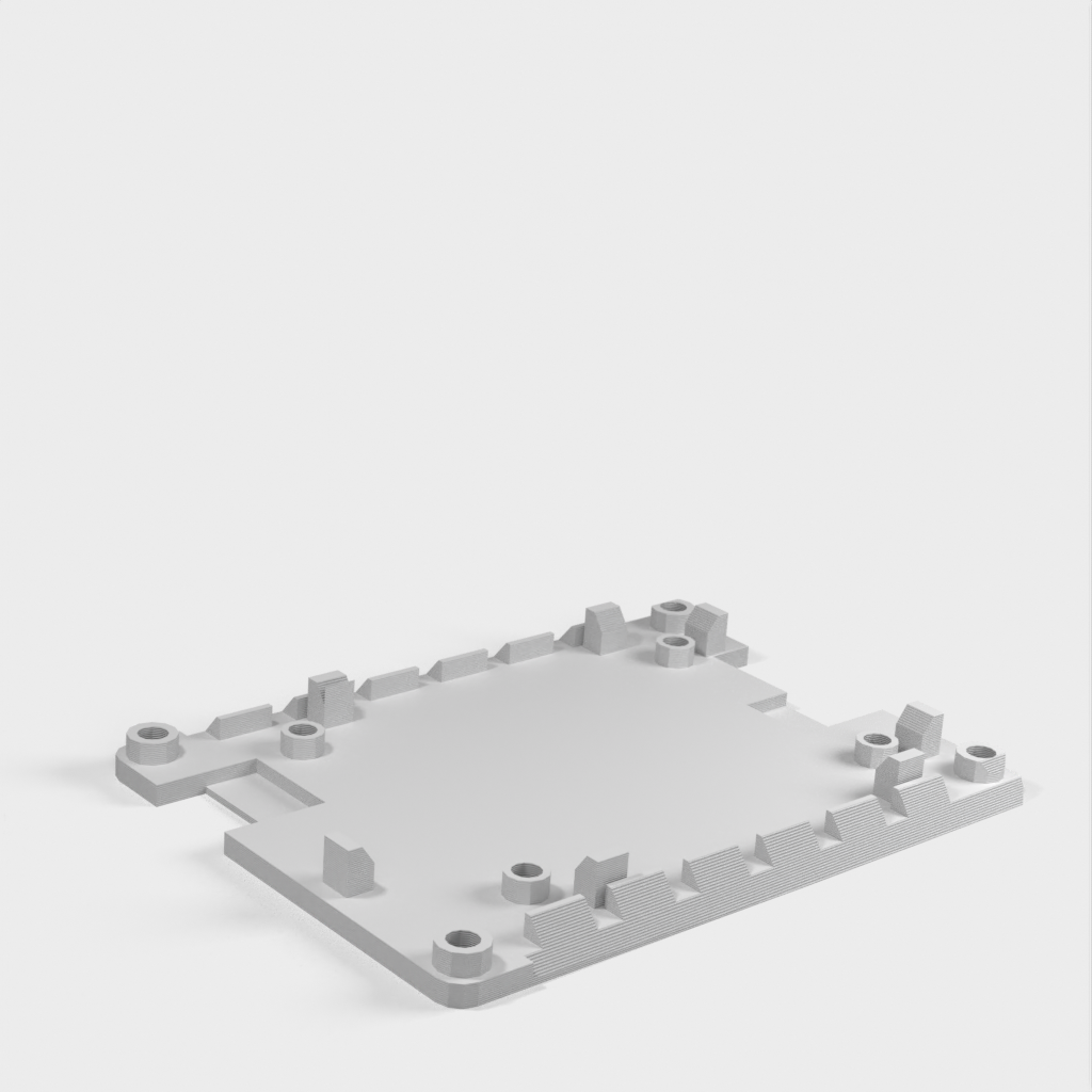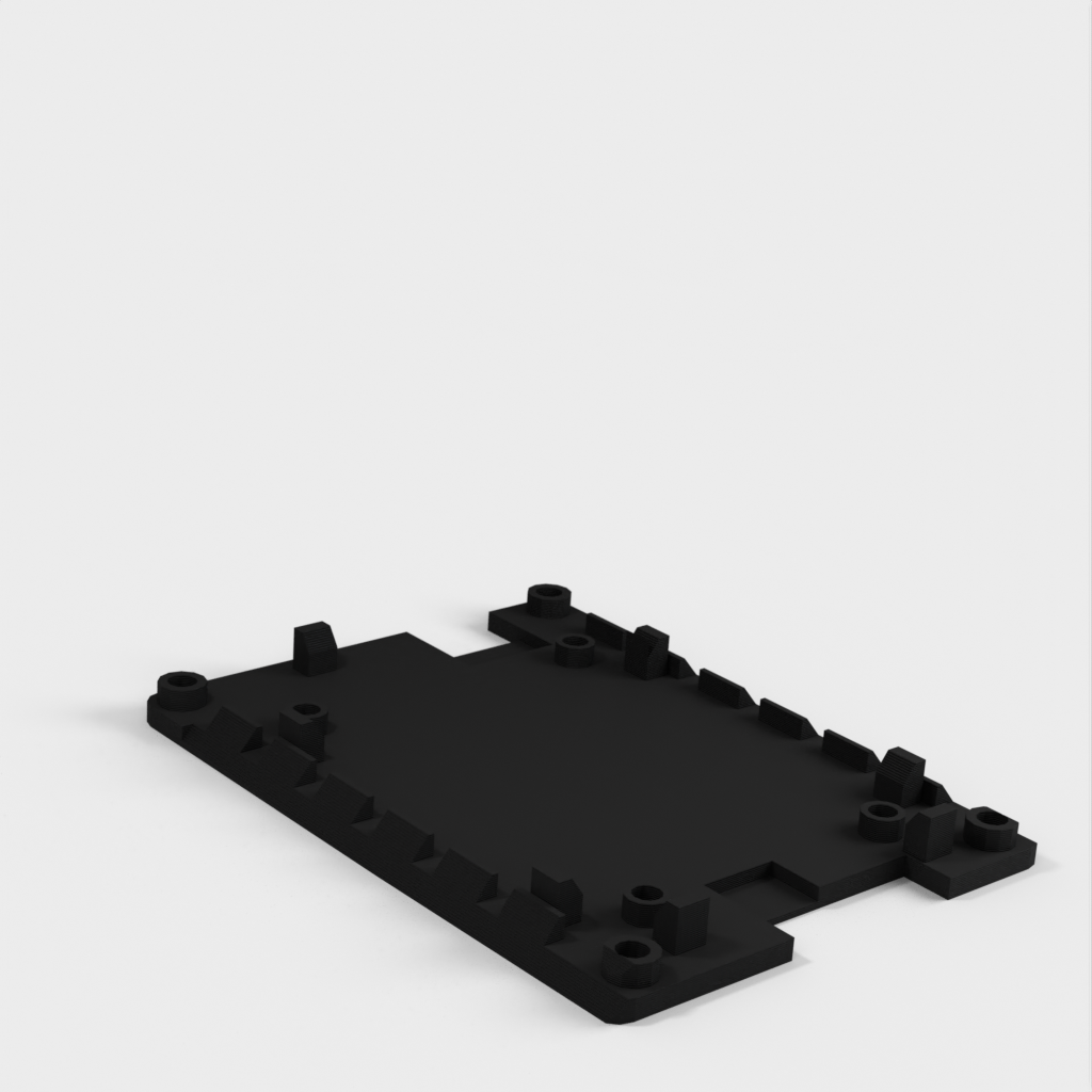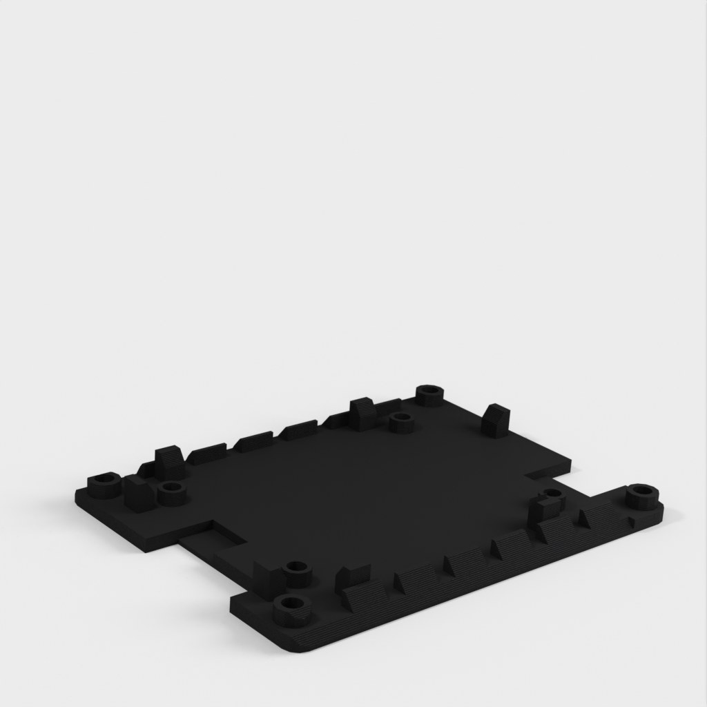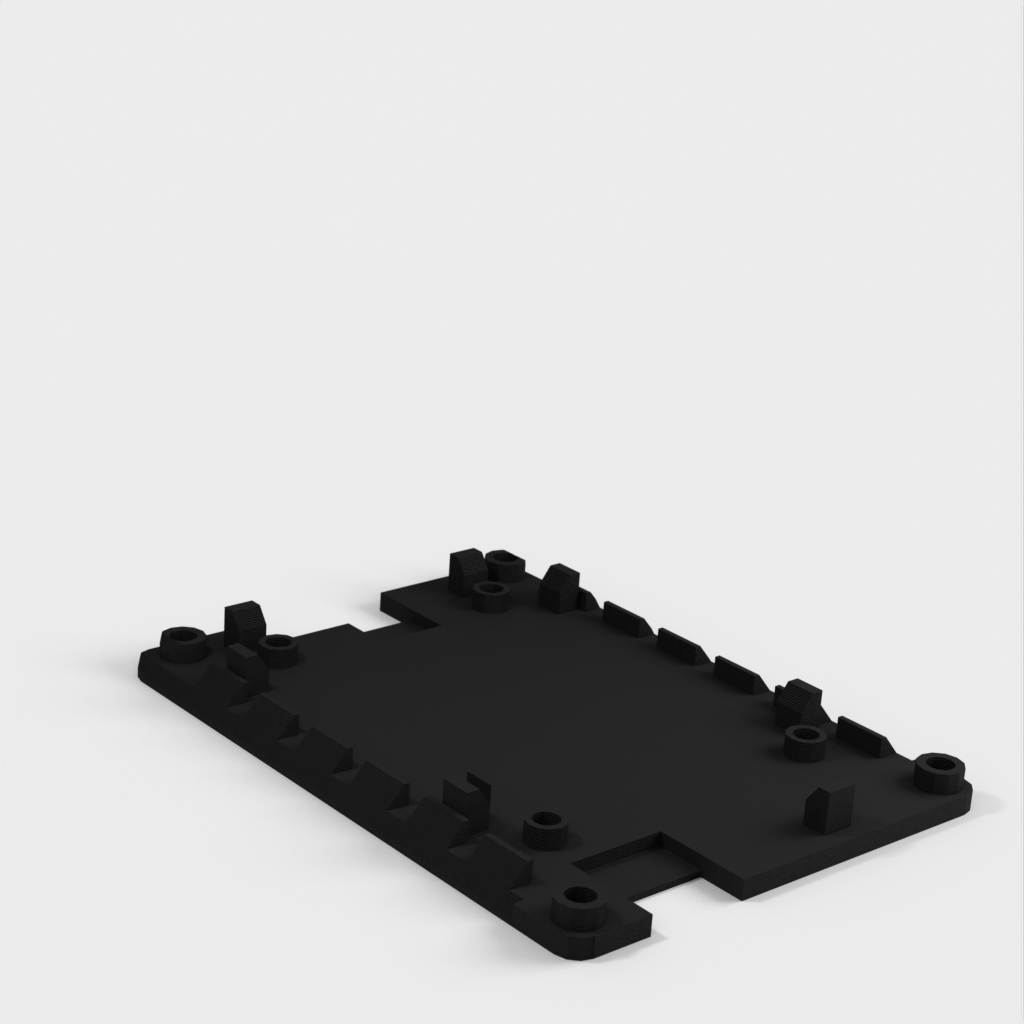 The holder can be mounted on a ClamShelf laptop. It has slanted edges that slide into the ClamShelf. The ventilation openings on the slanted edges allow air circulation under the circuit board both horizontally and vertically through the open top and bottom. Positioning guides help to place the circuit board, and the screw holes in the corners allow for stacking multiple holders using #4-40 screws, standoffs, and nuts.