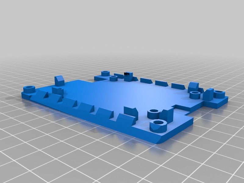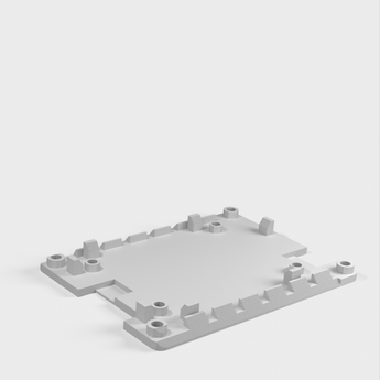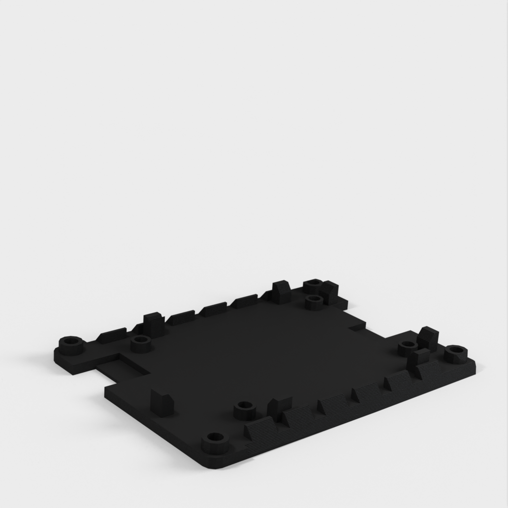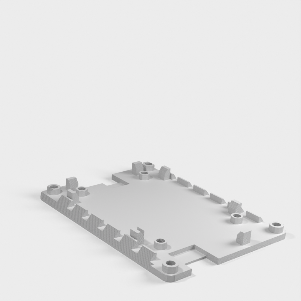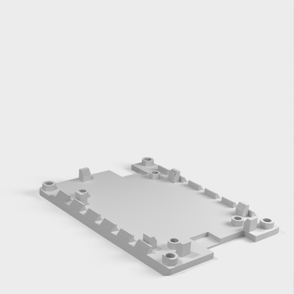 The holder can be mounted on a ClamShelf laptop. It has slanted edges that slide into the ClamShelf. The ventilation openings on the slanted edges allow air circulation under the circuit board both horizontally and vertically through the open top and bottom. Positioning guides help to place the circuit board, and the screw holes in the corners allow for stacking multiple holders using #4-40 screws, standoffs, and nuts.