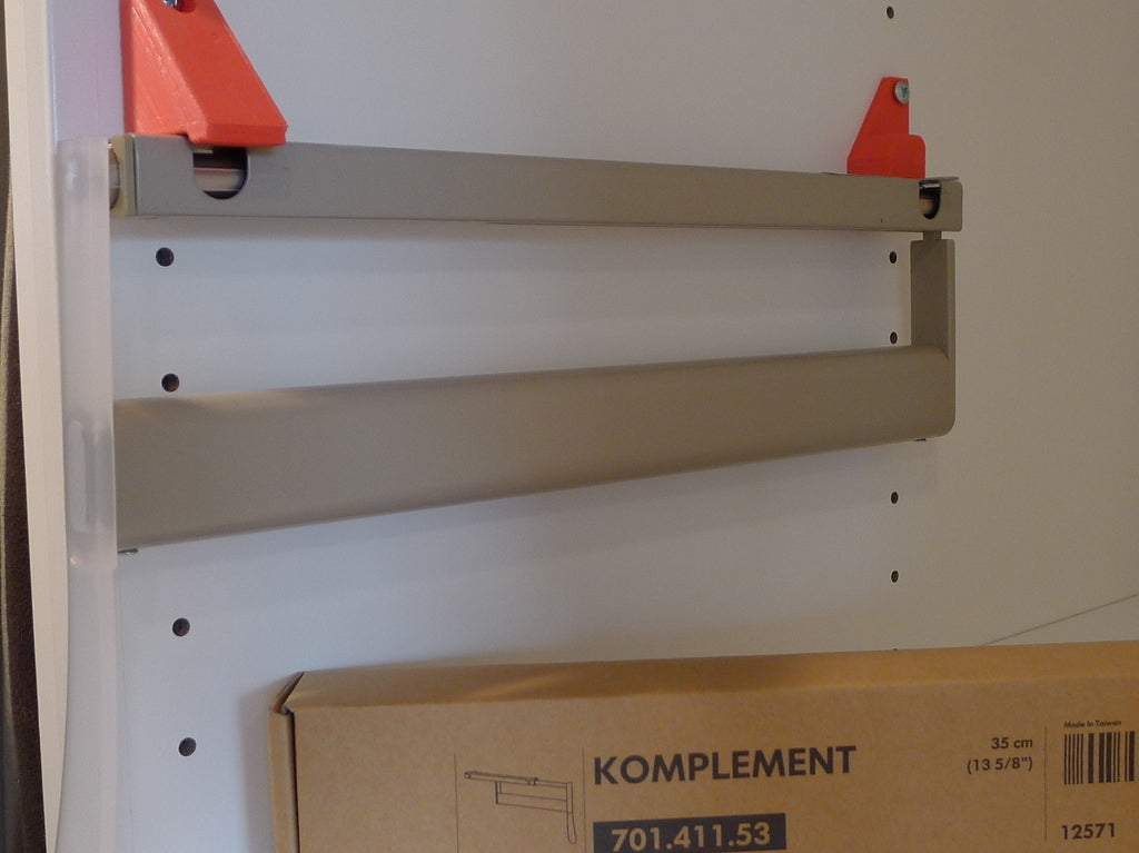 Braketter til IKEA PAX KOMPLEMENT pull-out tøjstativ. Disse braketter er designet til at tilpasse KOMPLEMENT-toget til 32mm hyldepindene på skabet. De bruges til at montere skinnerne på siden af kabinettet frem for bunden af en hylde. Dette giver en mere praktisk måde at organisere tøj på i dit PAX-system.