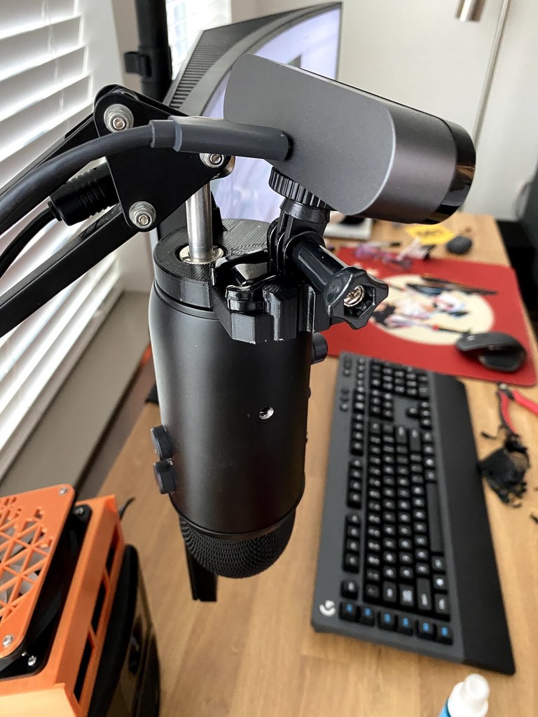 This is a mount for a Blue Yeti microphone that allows you to mount a GoPro or webcam on top of (or actually below) the microphone. An ideal solution for those with a vertical, stacked screen setup as it keeps the webcam elevated and facing the user from the side.