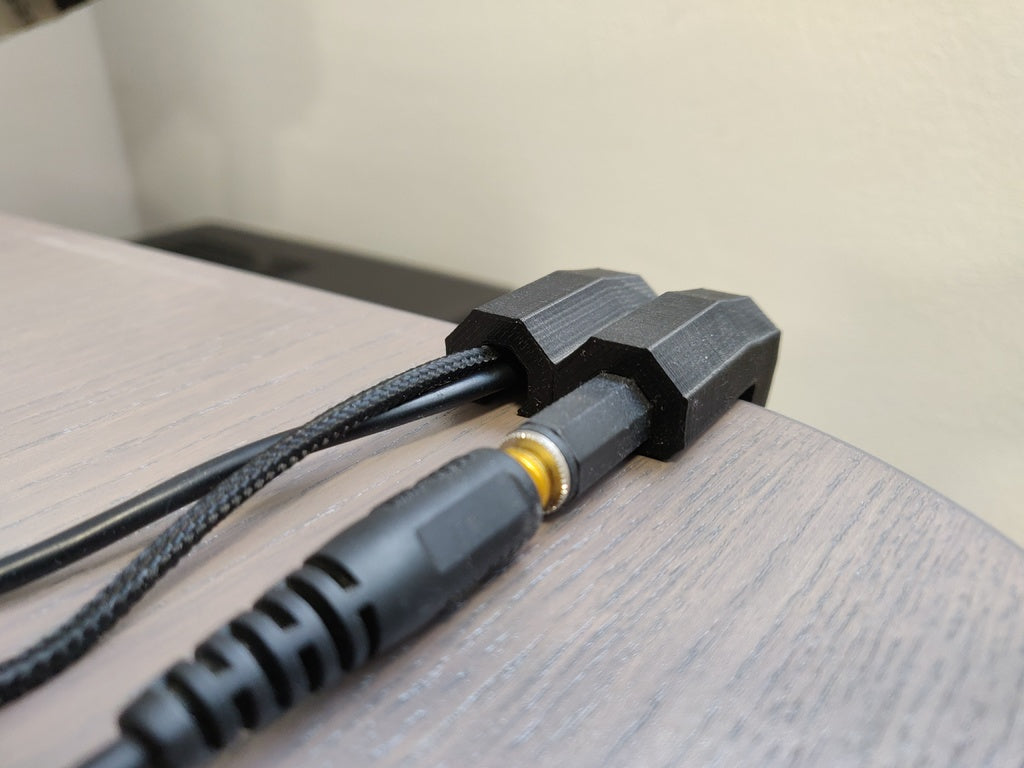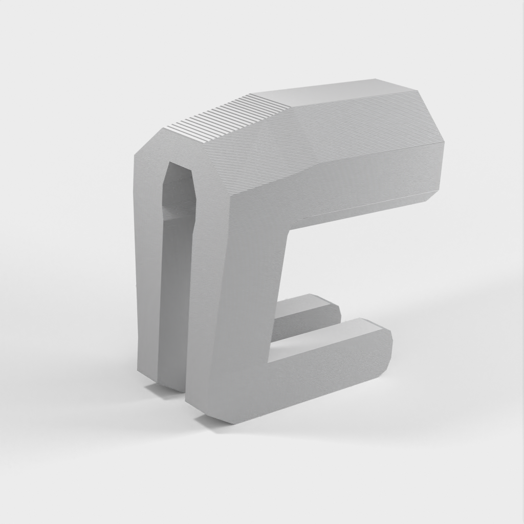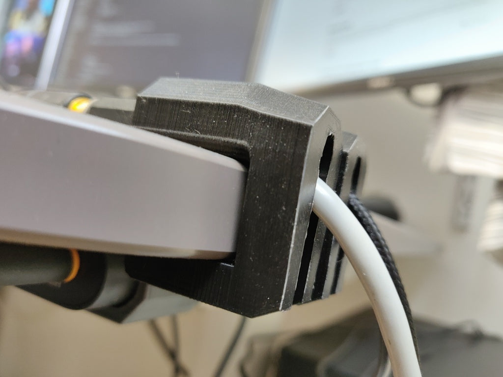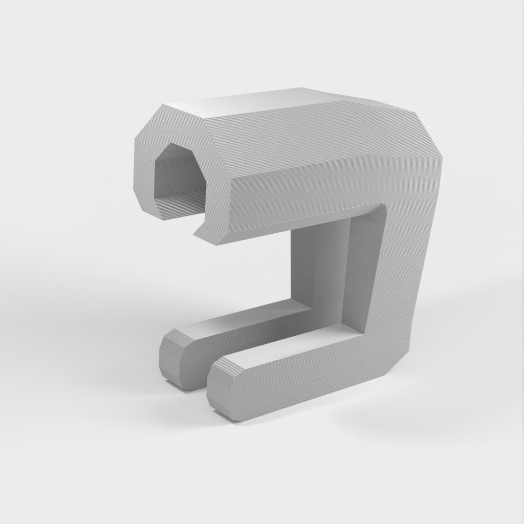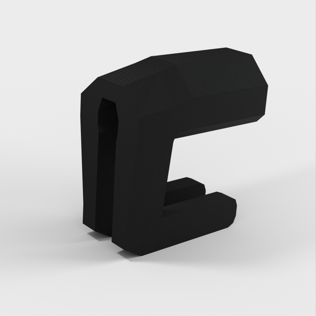 A simple cable holder, designed to fit the IKEA BEKANT desk. This holder helps manage the cables from your headset, mouse, and keyboard, keeping them secure and organized. Perfect for any home or office environment where cables can become messy or fall to the floor. This product is intended for desks with a thickness of 1.6cm.