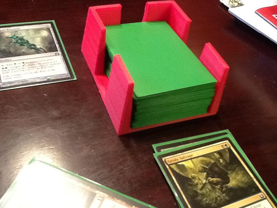 Card holder ideal for playing collectible card games. Designed to fit standard size cards in sleeves, and can handle a deck of around 60 cards. It is perfect for those who want to make their gaming experience more organized and clutter-free.