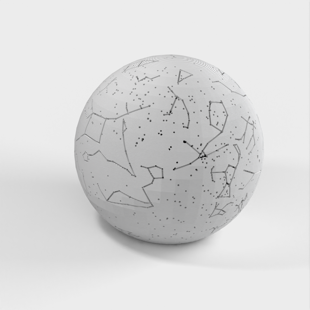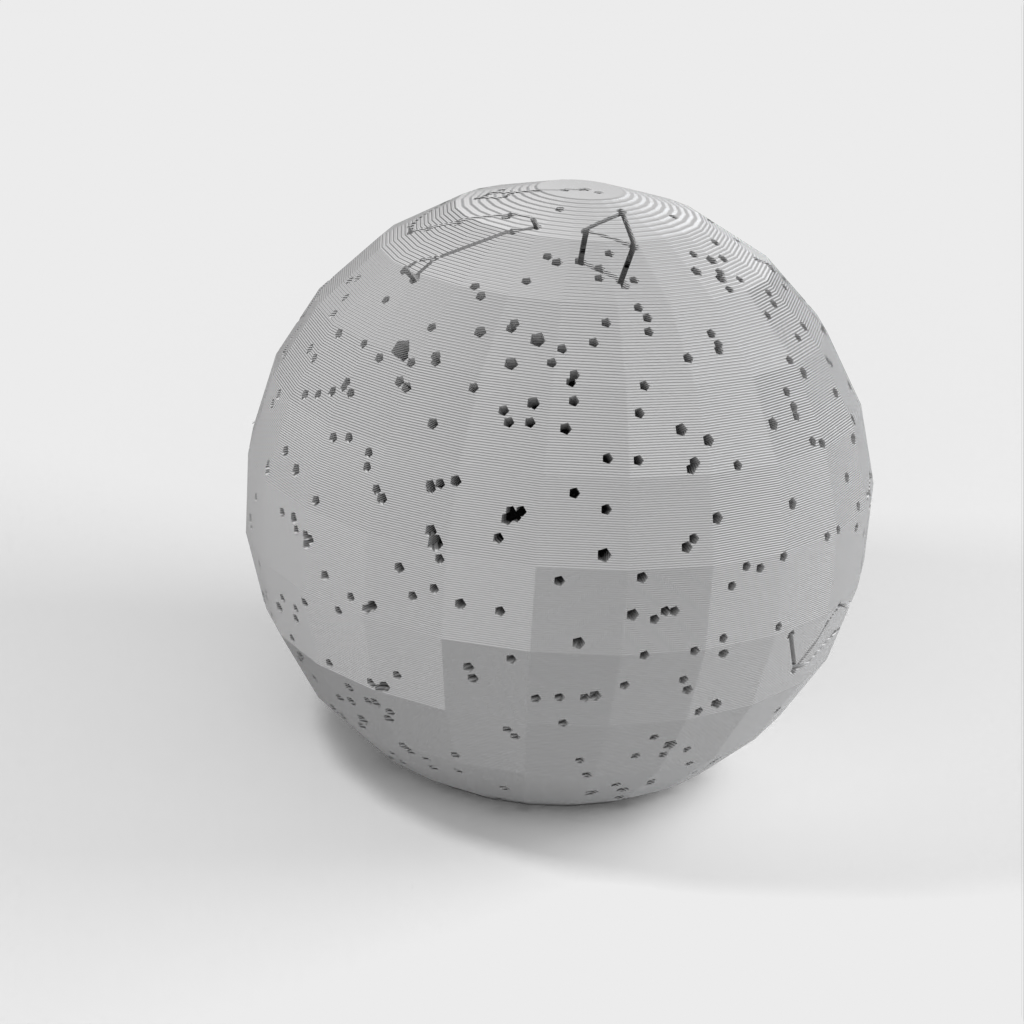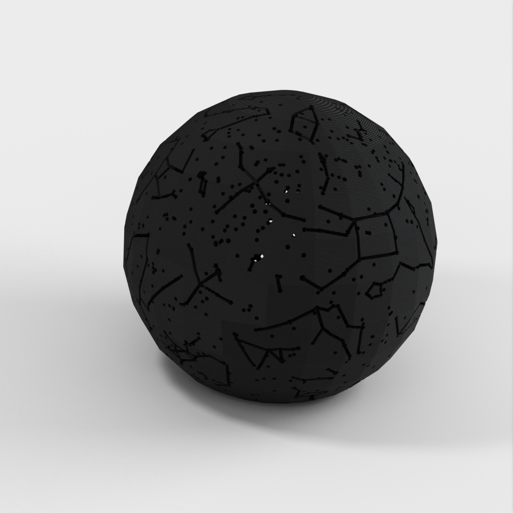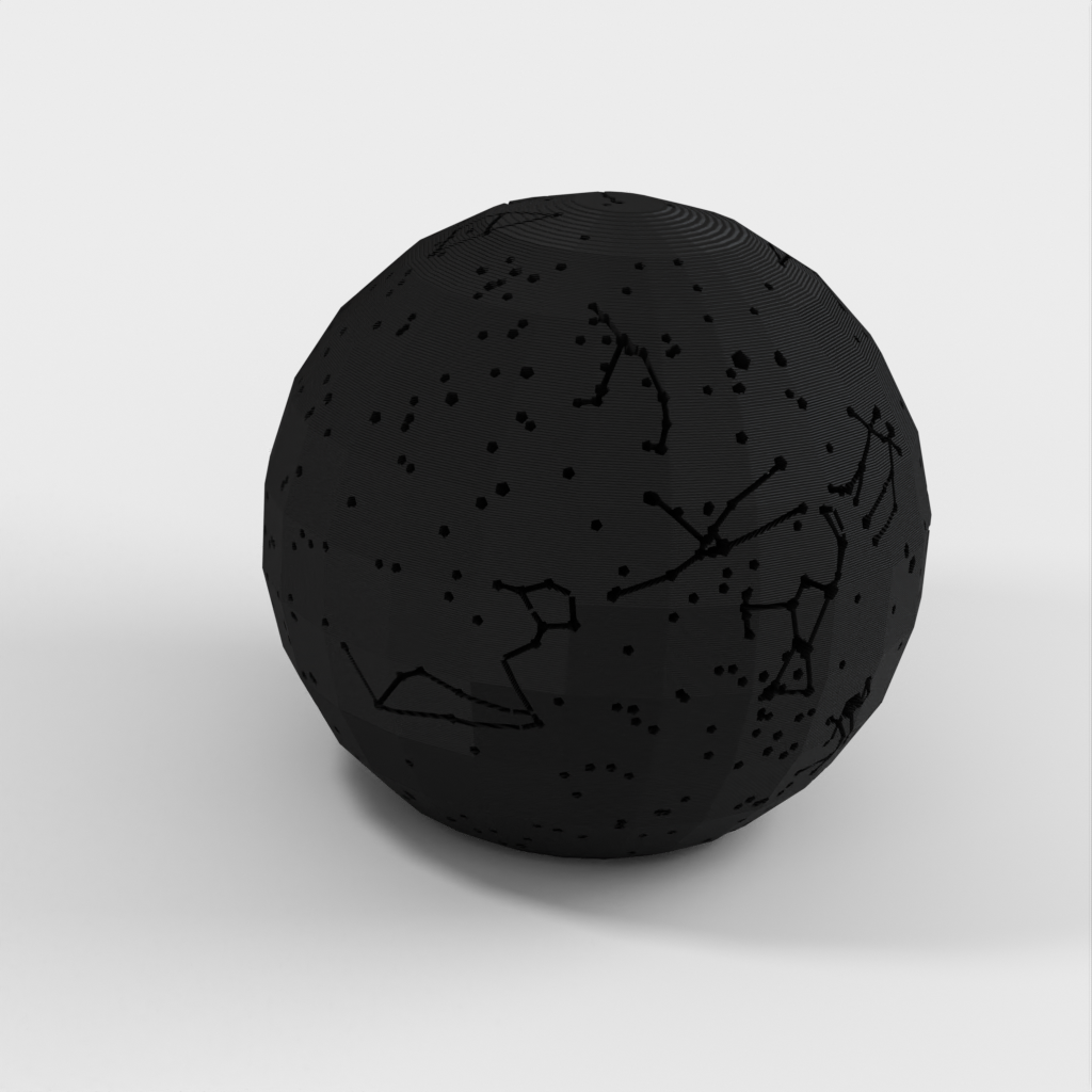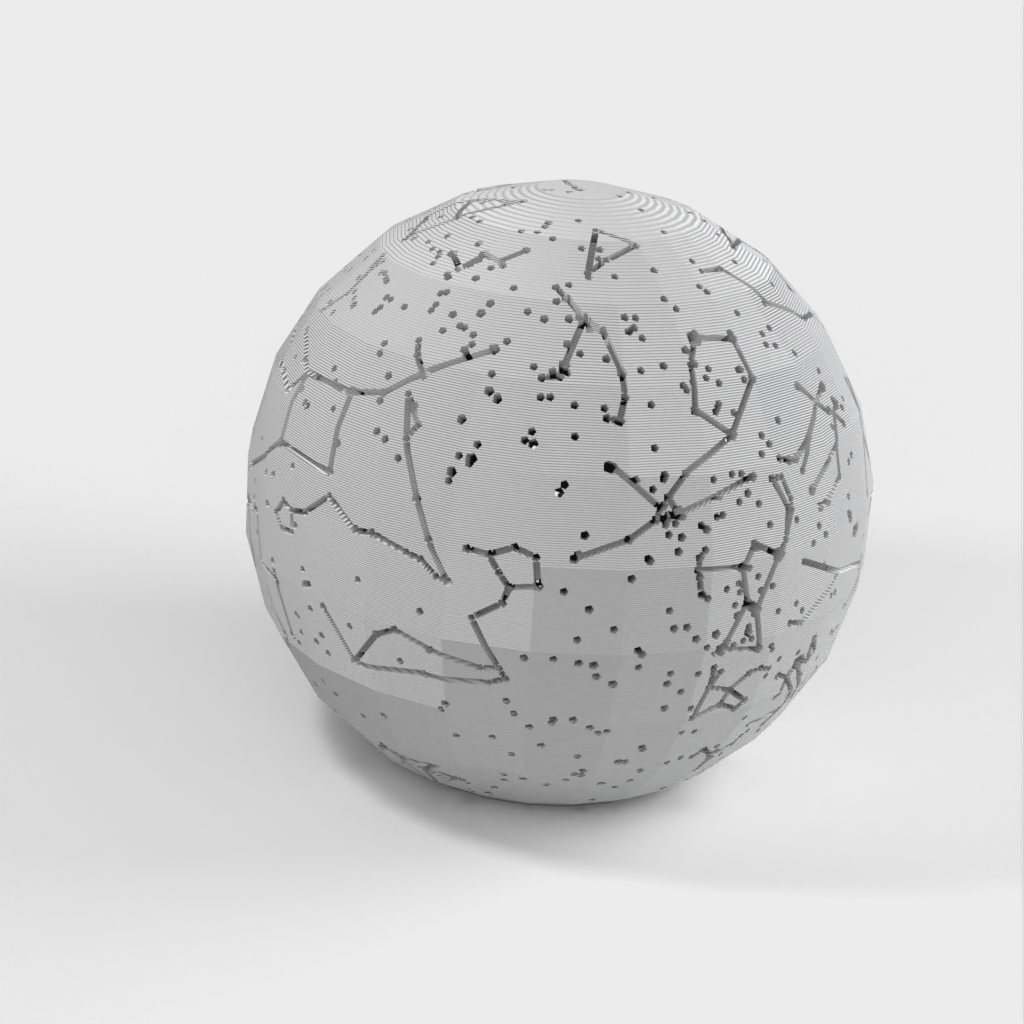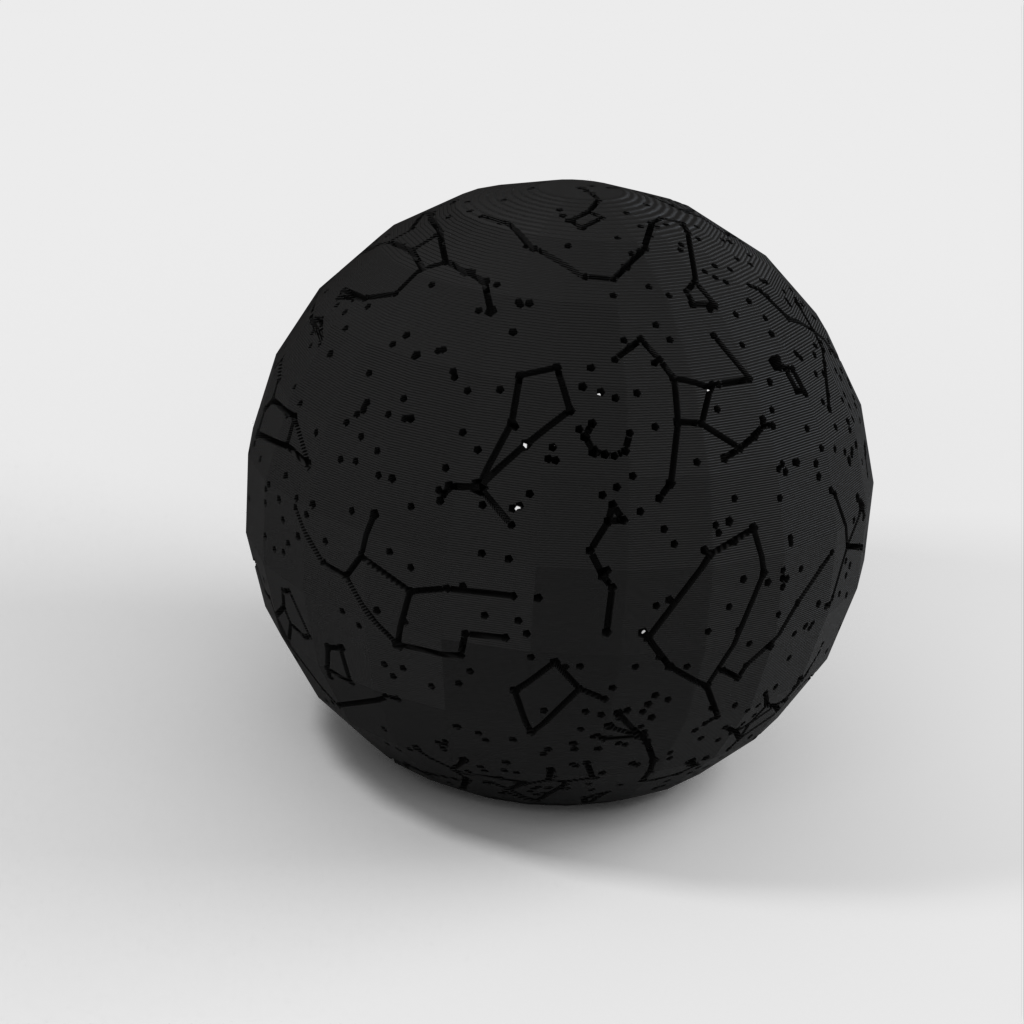 This product is an extension of the Celestial Sphere models and can generate STL files for a celestial sphere. Using Openscad, you can change many parameters and produce a 3D model of the celestial sphere, which can include more than 1700 of the brightest stars and up to 50 constellations. The model also involves plans for an equatorial type mount, complete with provisions for LED lighting inside the sphere.