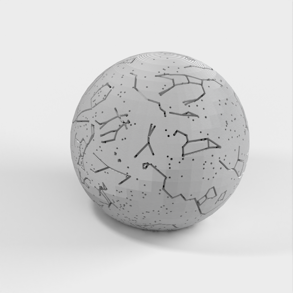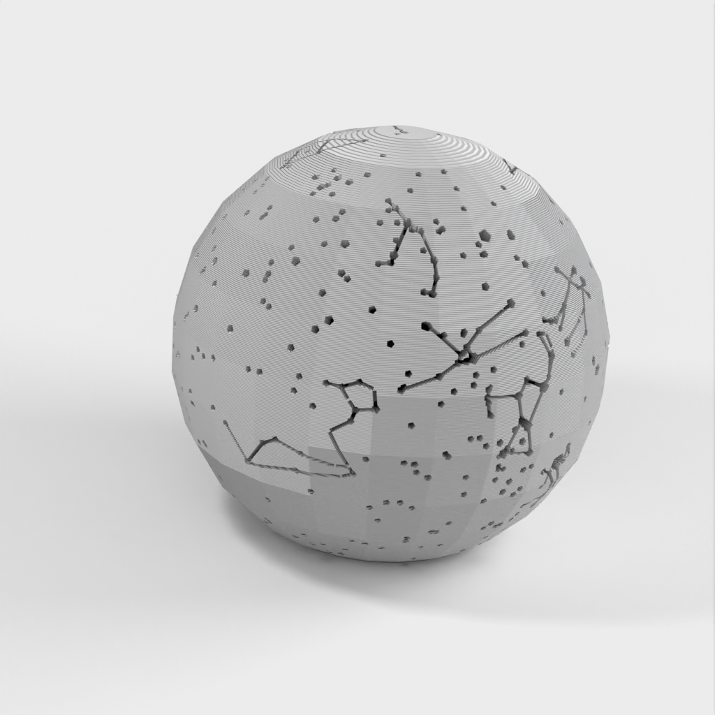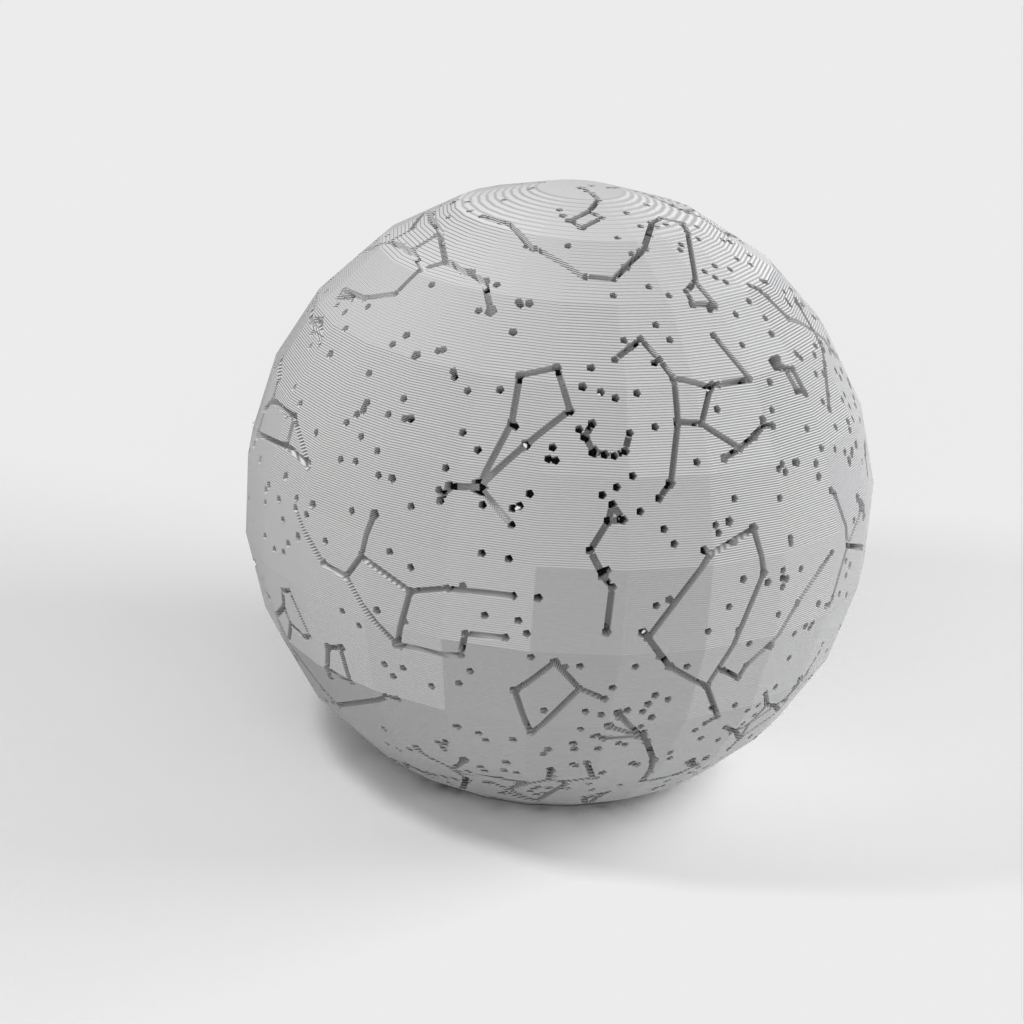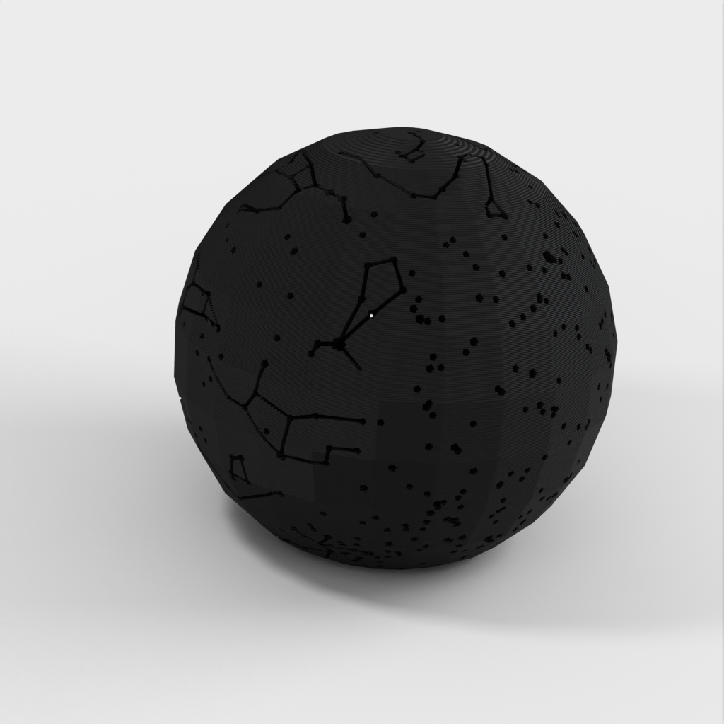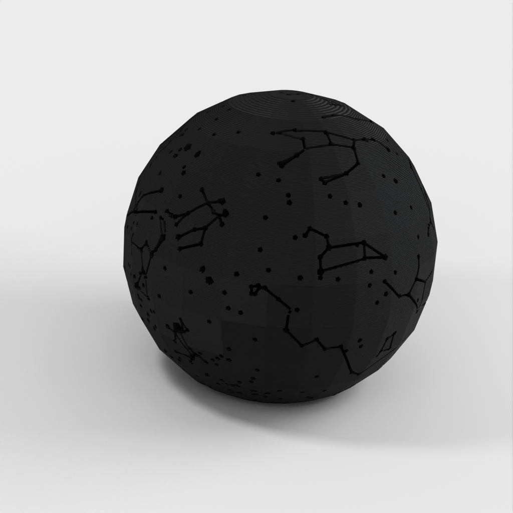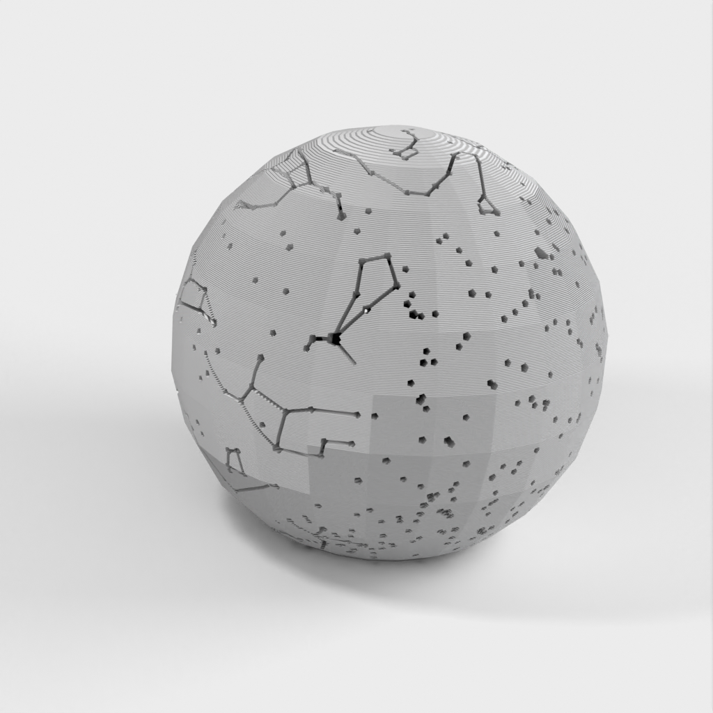 This product is an extension of the Celestial Sphere models and can generate STL files for a celestial sphere. Using Openscad, you can change many parameters and produce a 3D model of the celestial sphere, which can include more than 1700 of the brightest stars and up to 50 constellations. The model also involves plans for an equatorial type mount, complete with provisions for LED lighting inside the sphere.
