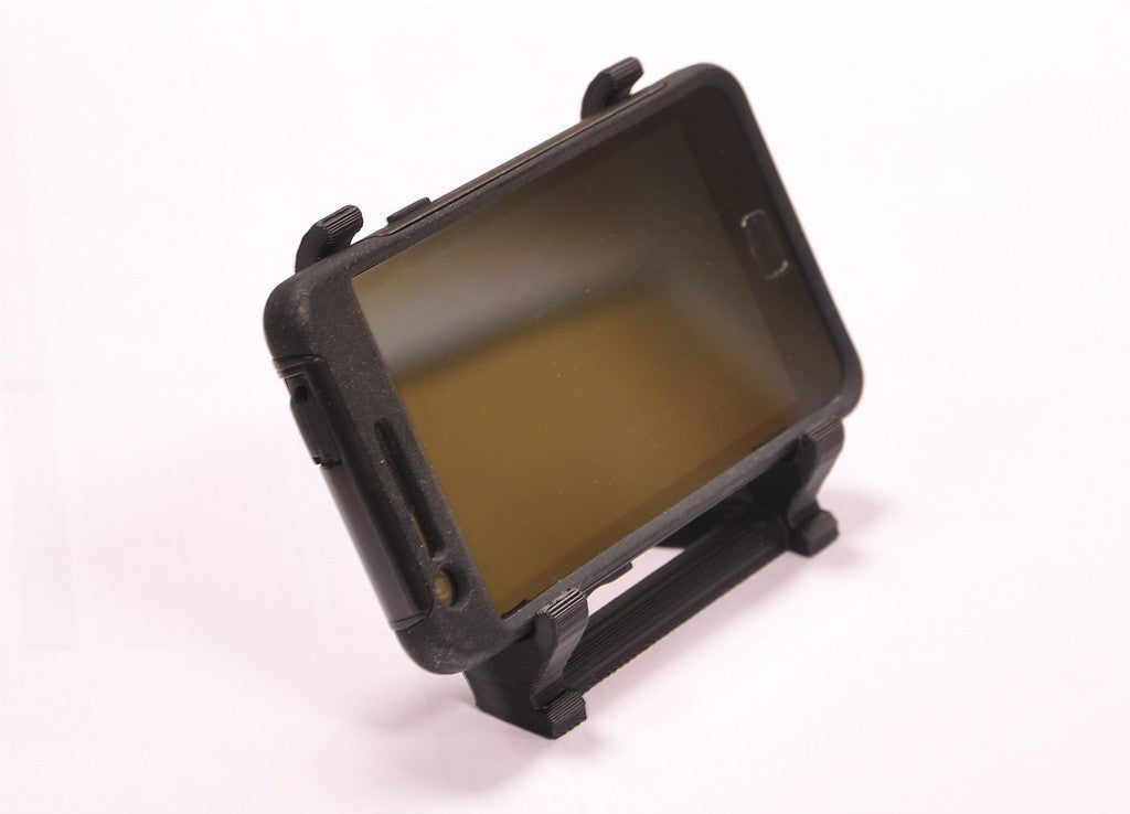 A robust phone holder that fits perfectly with Galaxy S2 equipped with an Otter case. This holder is designed to accommodate the phone in its larger, more protective case – hence the name 'fat case phone-stand'. The holder ensures that your phone is securely placed, even with the thicker case on.