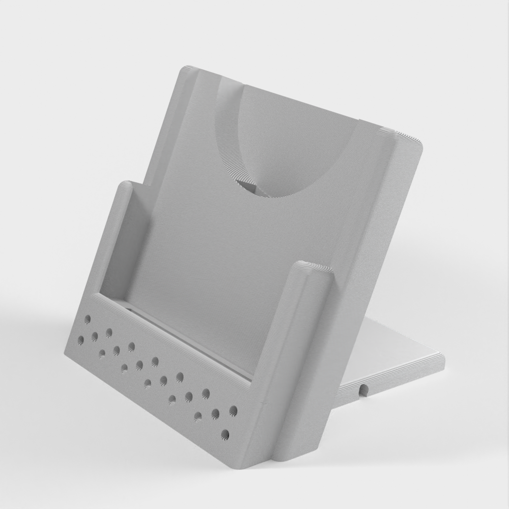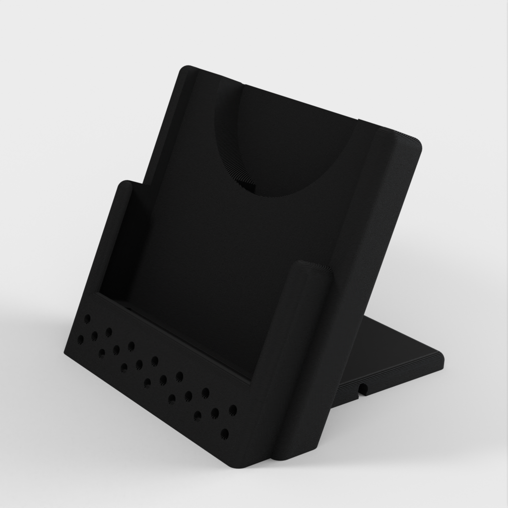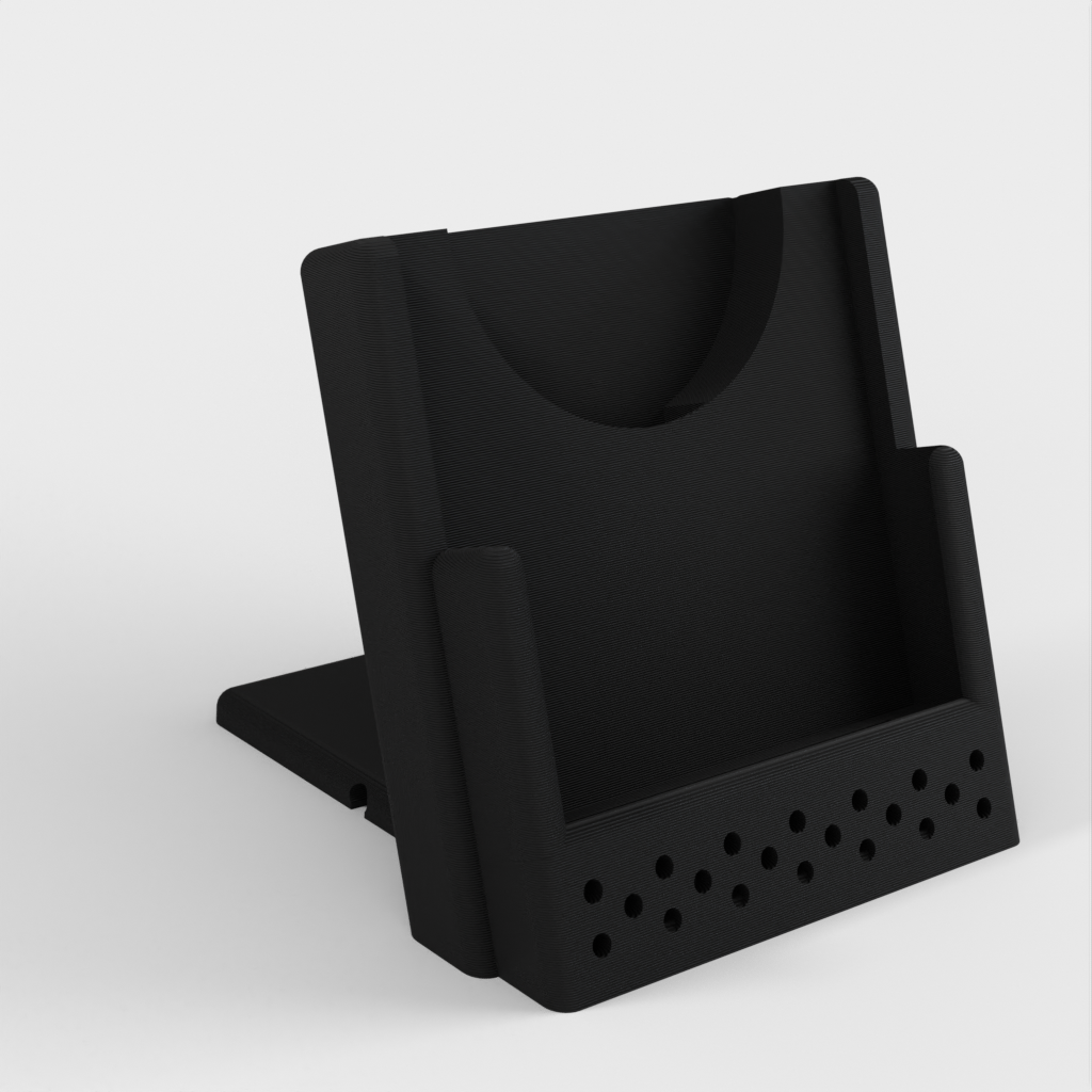 Here is a customizable wireless phone charging stand. It features an adjustable cable routing design that lets you choose whether the cable exits the charger to the left, right, or back. It can be customized to fit an iPhone XS with a third-party charger, but can also be easily modified to fit any other phone and charger combination.