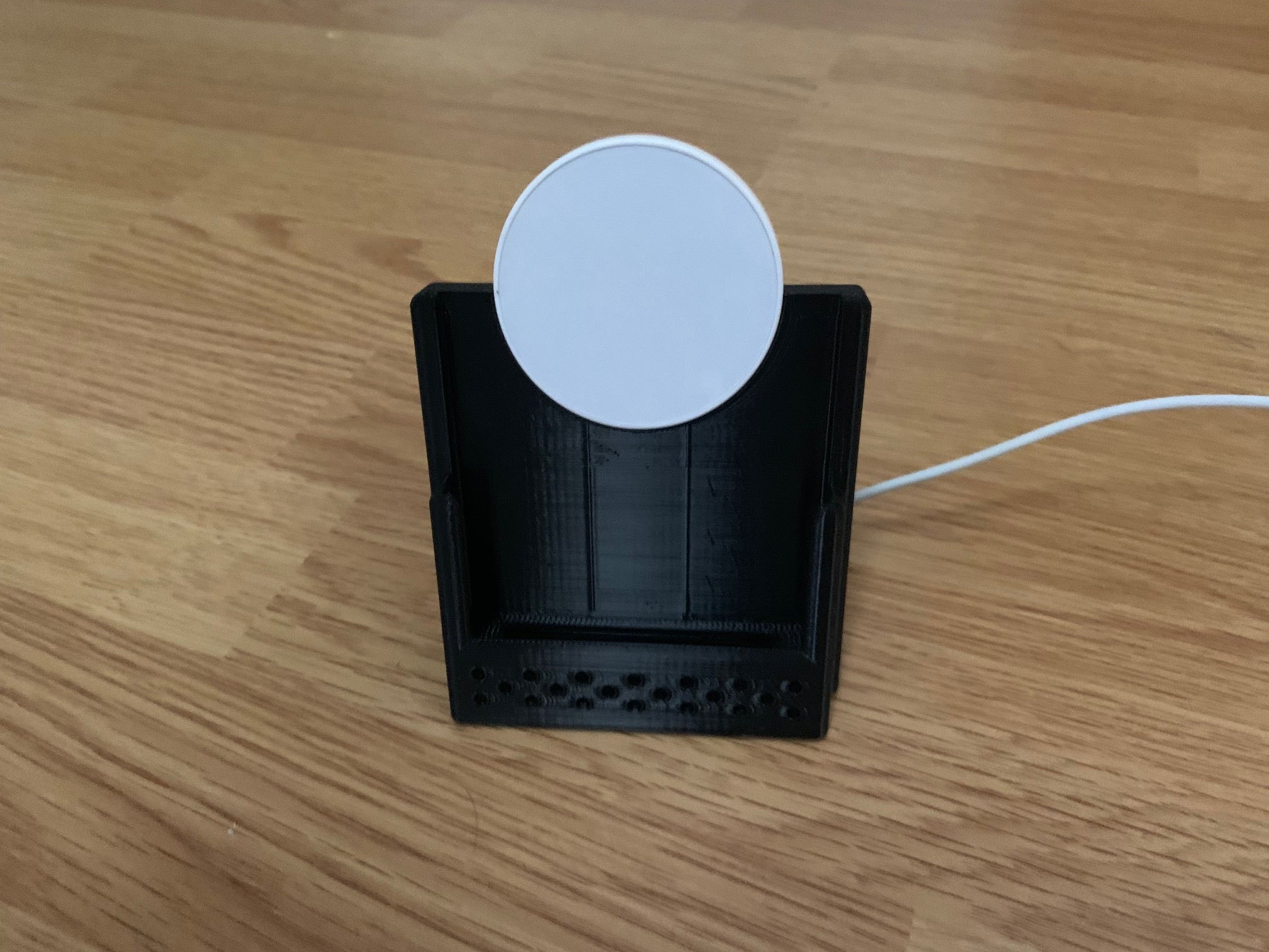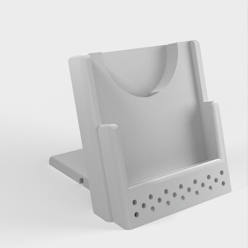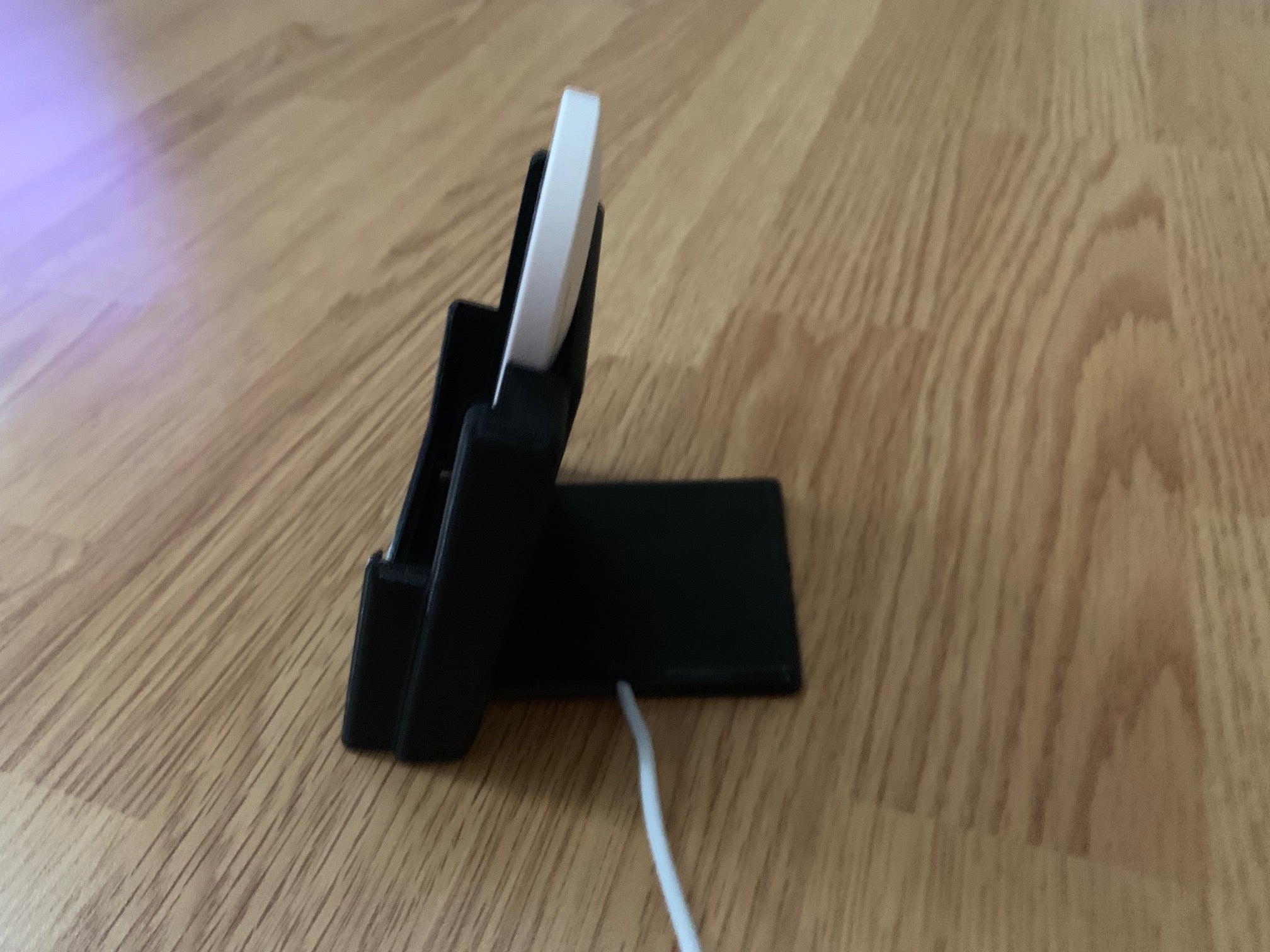 Here is a customizable wireless phone charging stand. It features an adjustable cable routing design that lets you choose whether the cable exits the charger to the left, right, or back. It can be customized to fit an iPhone XS with a third-party charger, but can also be easily modified to fit any other phone and charger combination.