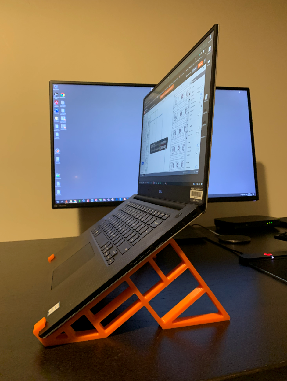 Laptopstand til Dell XPS 15. Standen hæver skærmen til omkring 170mm og stiller den i den perfekte vinkel til en flad skærmposition, når den er fuldt hængt op. Standen passer perfekt til MK3-seng og printes med SUNLU PETG. Det tager omkring 9 timer at printe og bruger 3 omkreds med en fyldningsvinkel på 55 grader og Gyroid Infill på 15%.