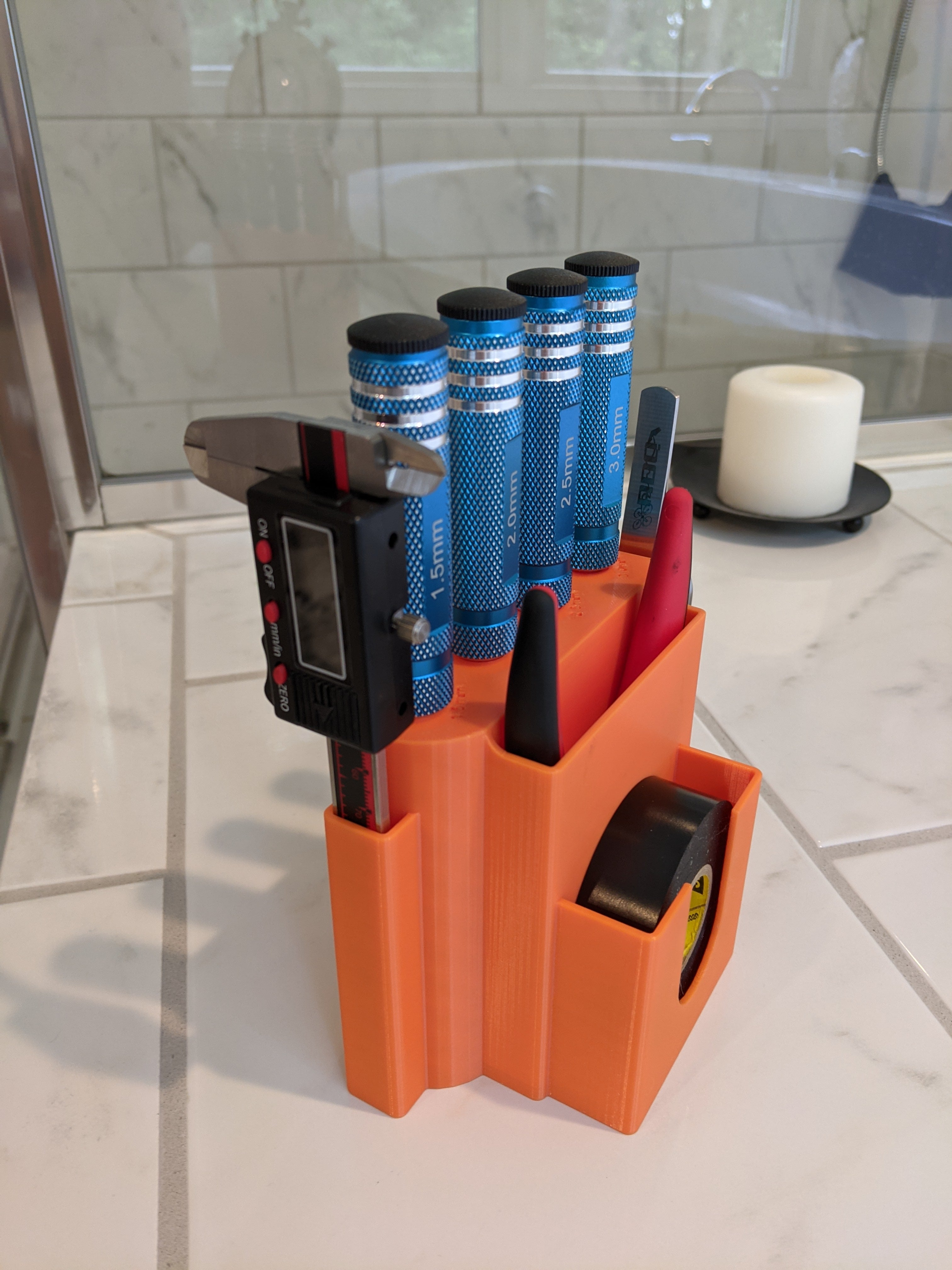 A practical desktop tool organizer designed to hold all your daily tools for building and repairing FPV drones and 3D printing. This organizer significantly reduces your building and repair time by keeping your most necessary tools close at hand. It is made with orange Hatchbox PLA to ensure durability and consistency.