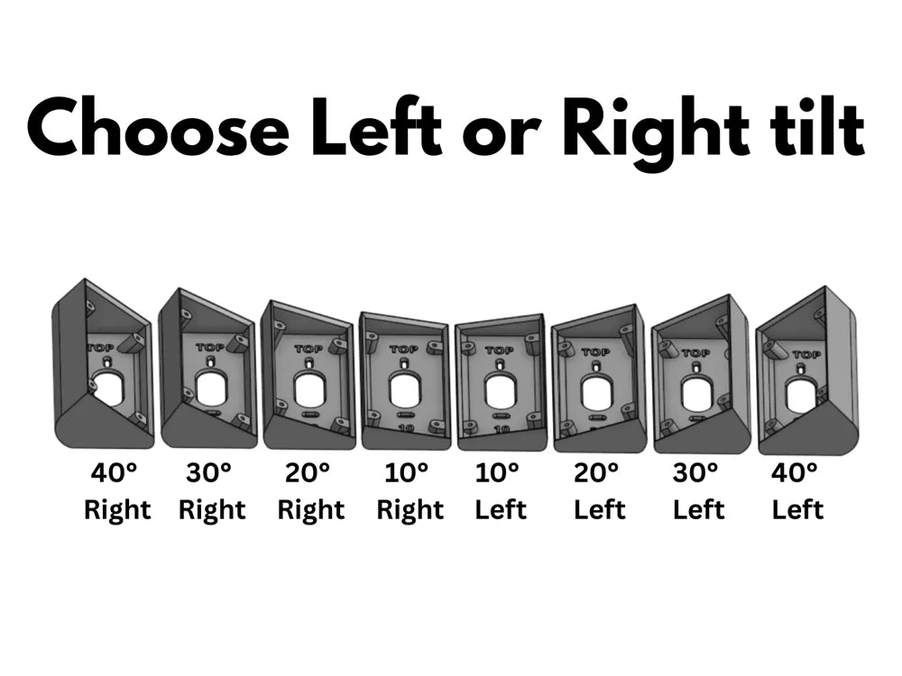 The angles of 10°, 20°, 30°, and 40° provide flexibility for customisation, which is particularly useful for installations in tight spaces or near windows. With a well-considered design, this mount can seamlessly fit the Ring model that features a built-in battery with a slanted back and an asymmetrical arrangement of mounting holes.