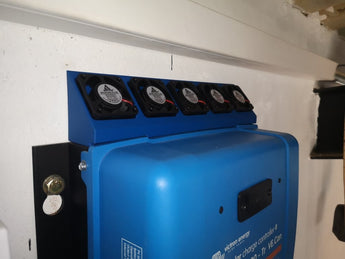 An extractor cowl designed to fit 5x 40mm fans on a Victron 250/100 MPPT. This cowl significantly improves cooling on the heat sink behind the charger.