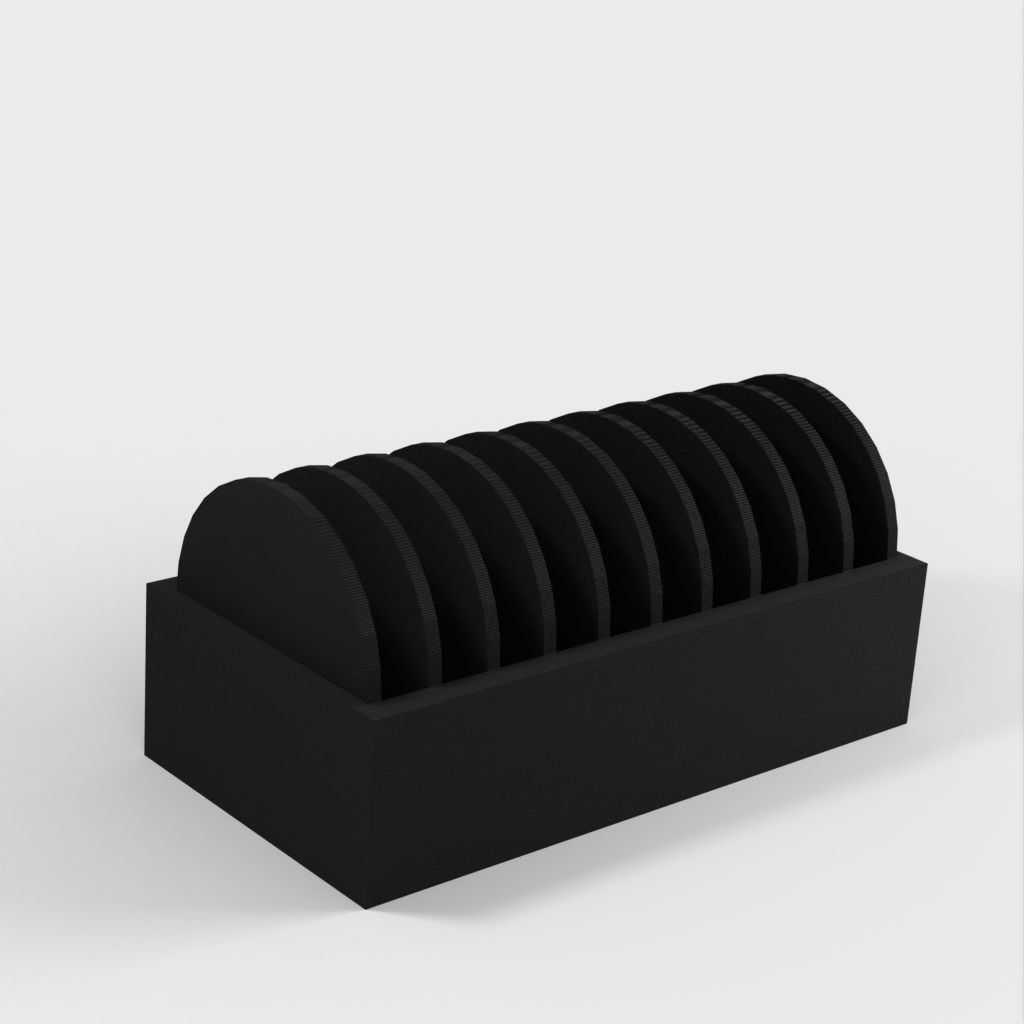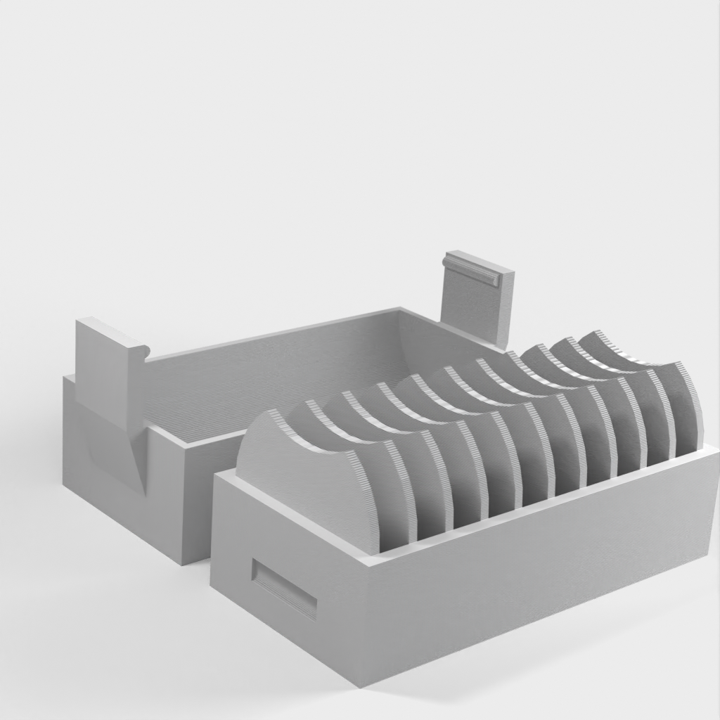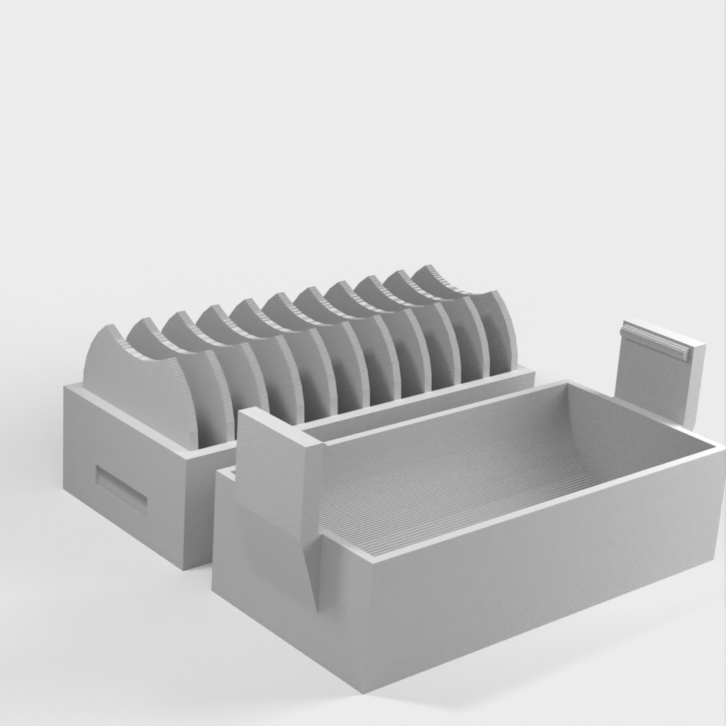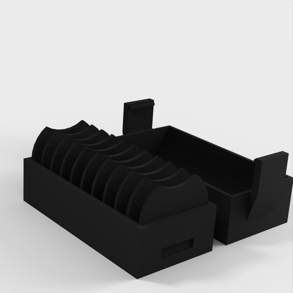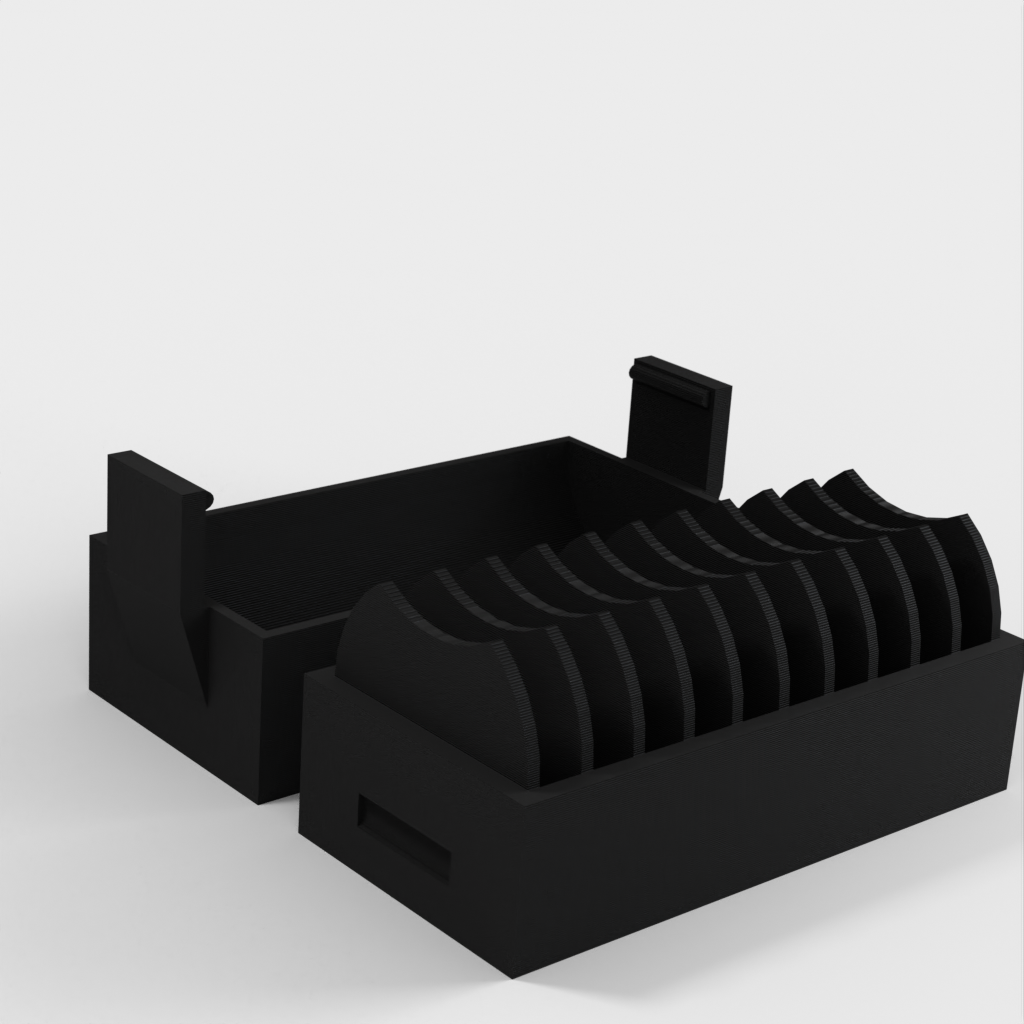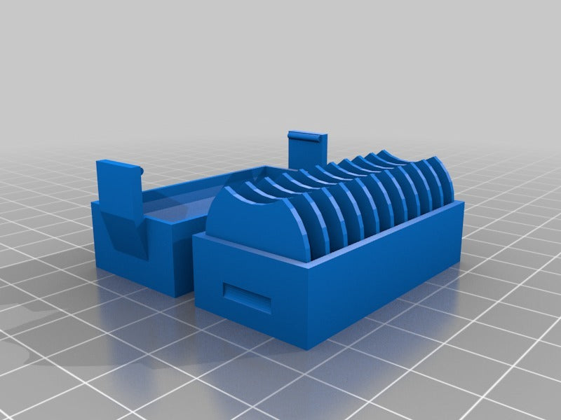 A small holder for 10 pcs. CR2032 coin batteries. A new version has been added with a lid that makes it easier to insert and remove the batteries. The lid has a clip to hold the batteries in place if it falls over.