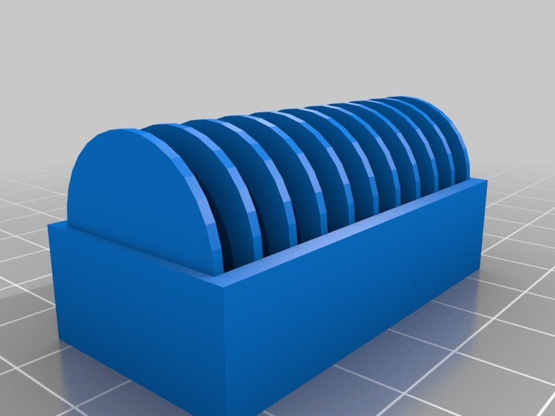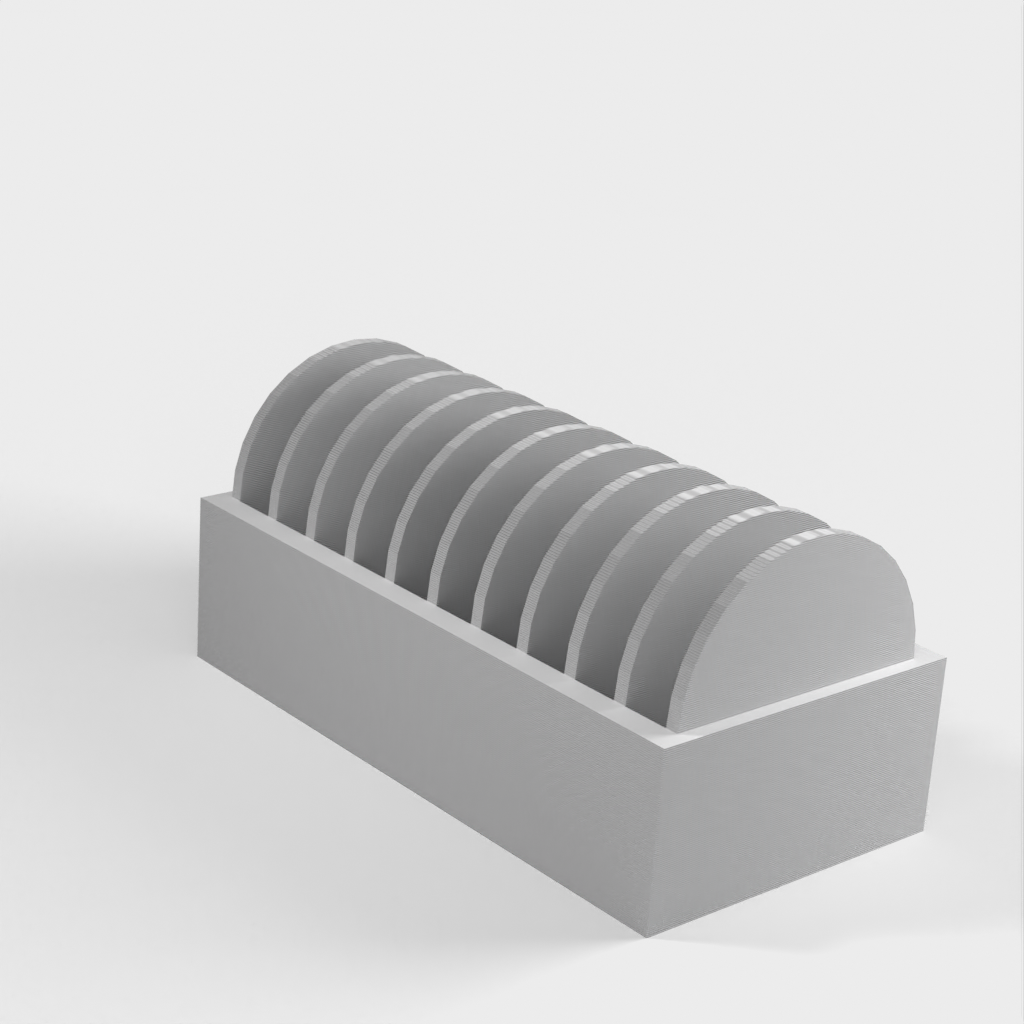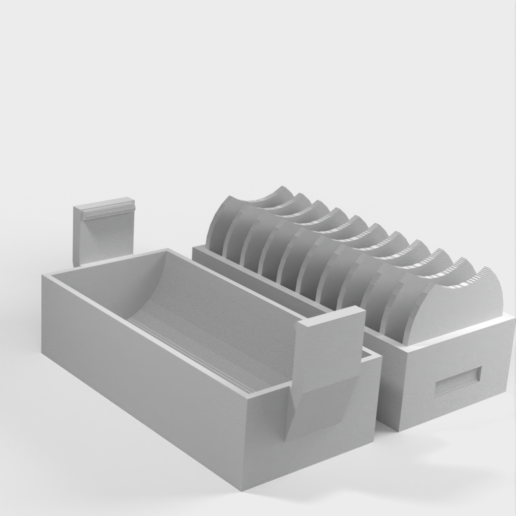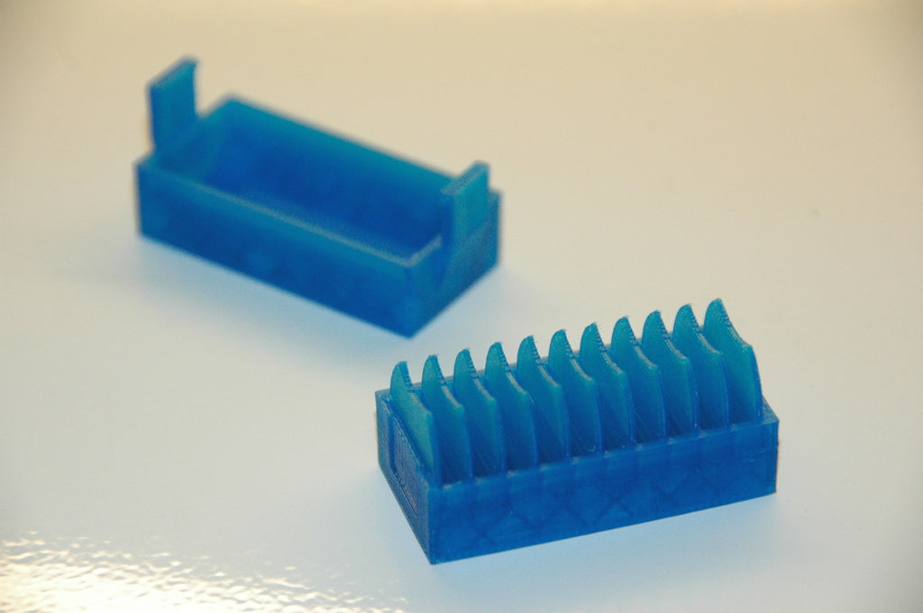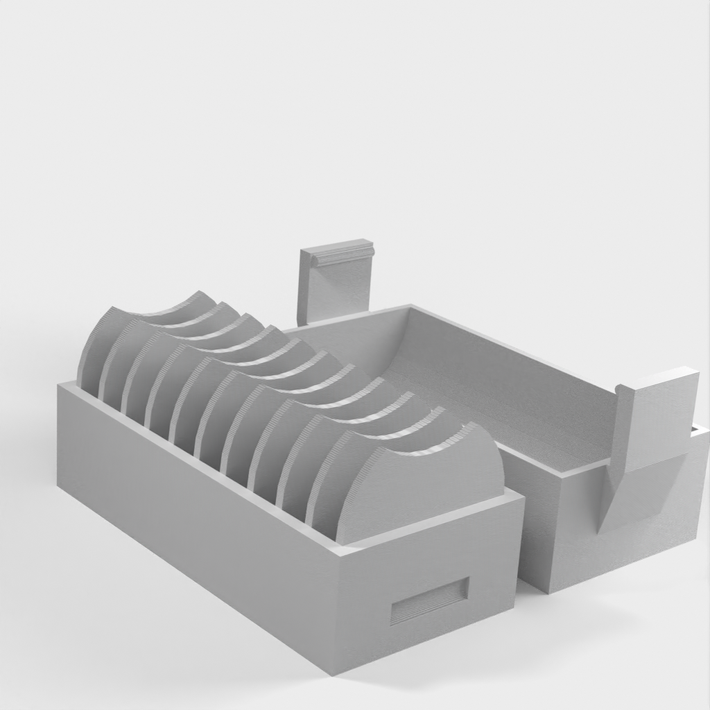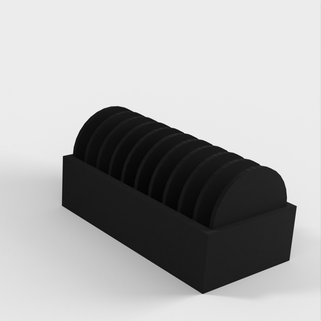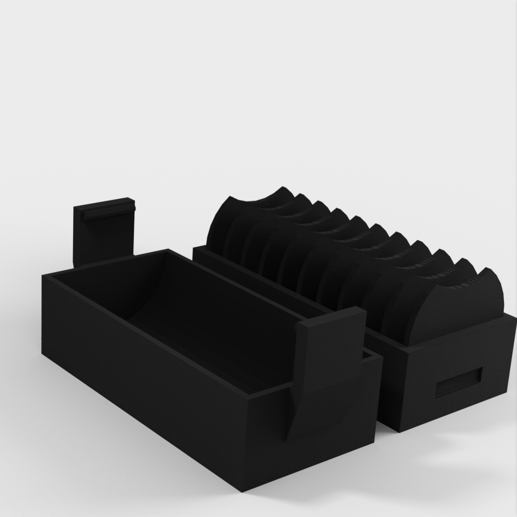 A small holder for 10 pcs. CR2032 coin batteries. A new version has been added with a lid that makes it easier to insert and remove the batteries. The lid has a clip to hold the batteries in place if it falls over.