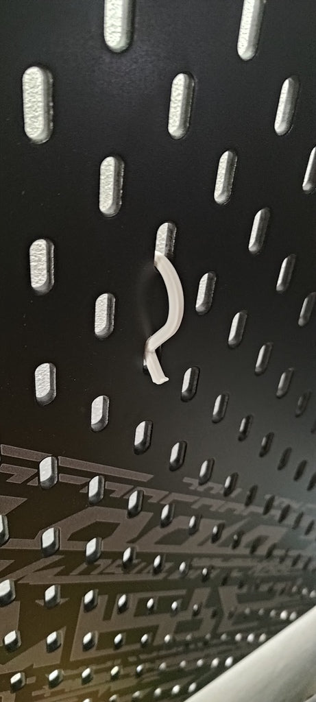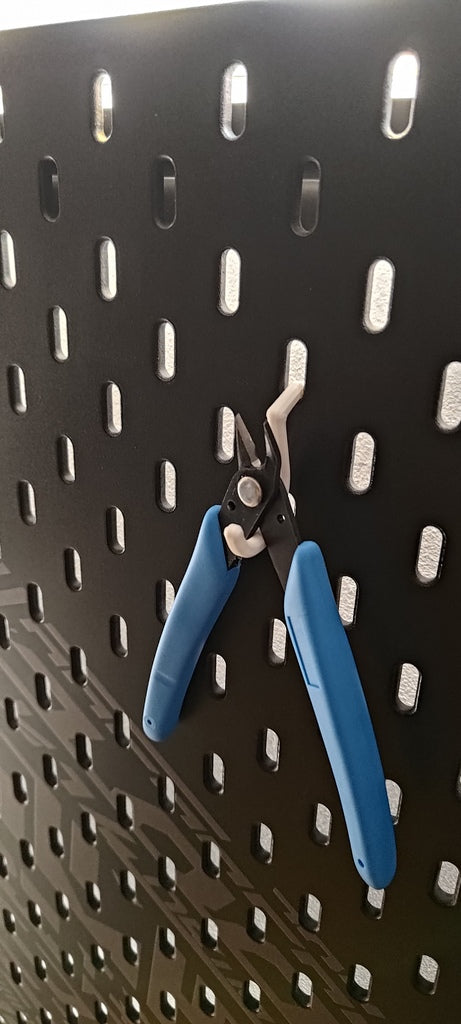 A hook for the IKEA Uppspel pegboard. The Uppspel / Skådis hook can be easily attached to the board, allowing you to hang various items to keep your workspace neat and organized.