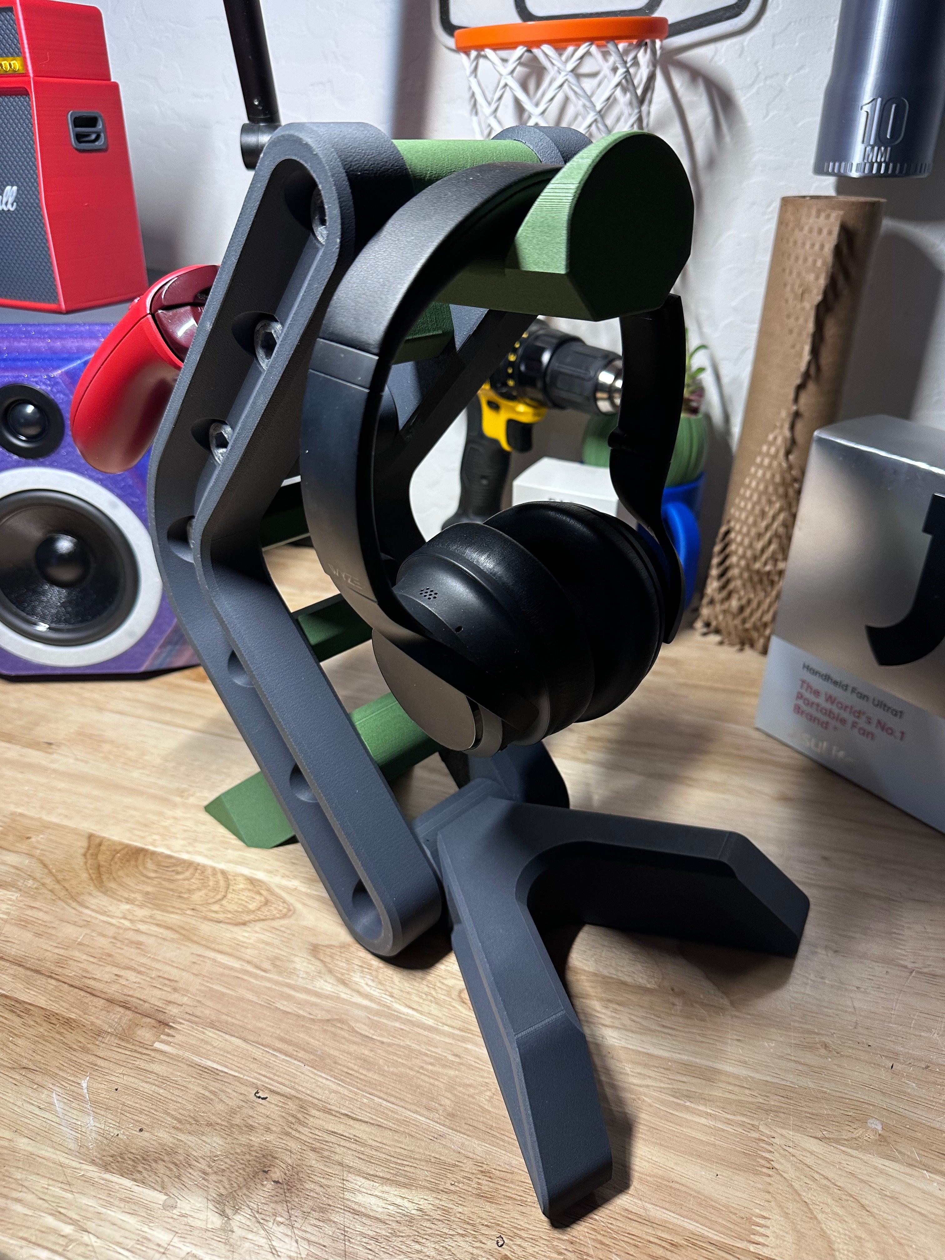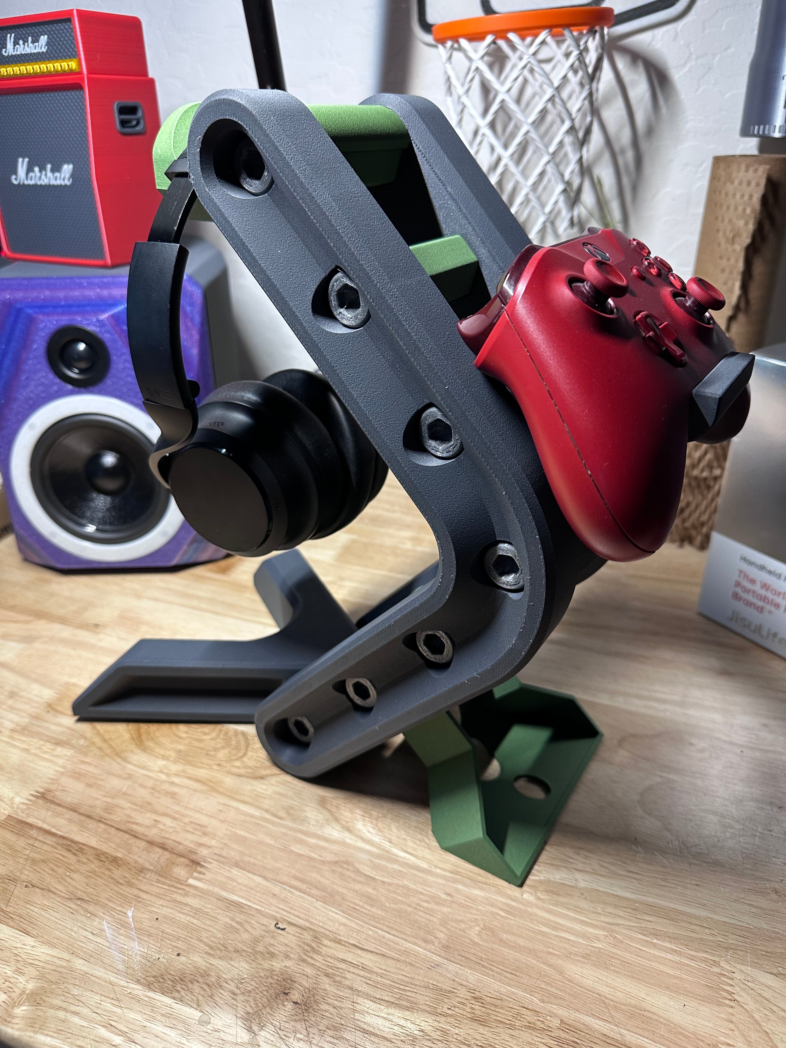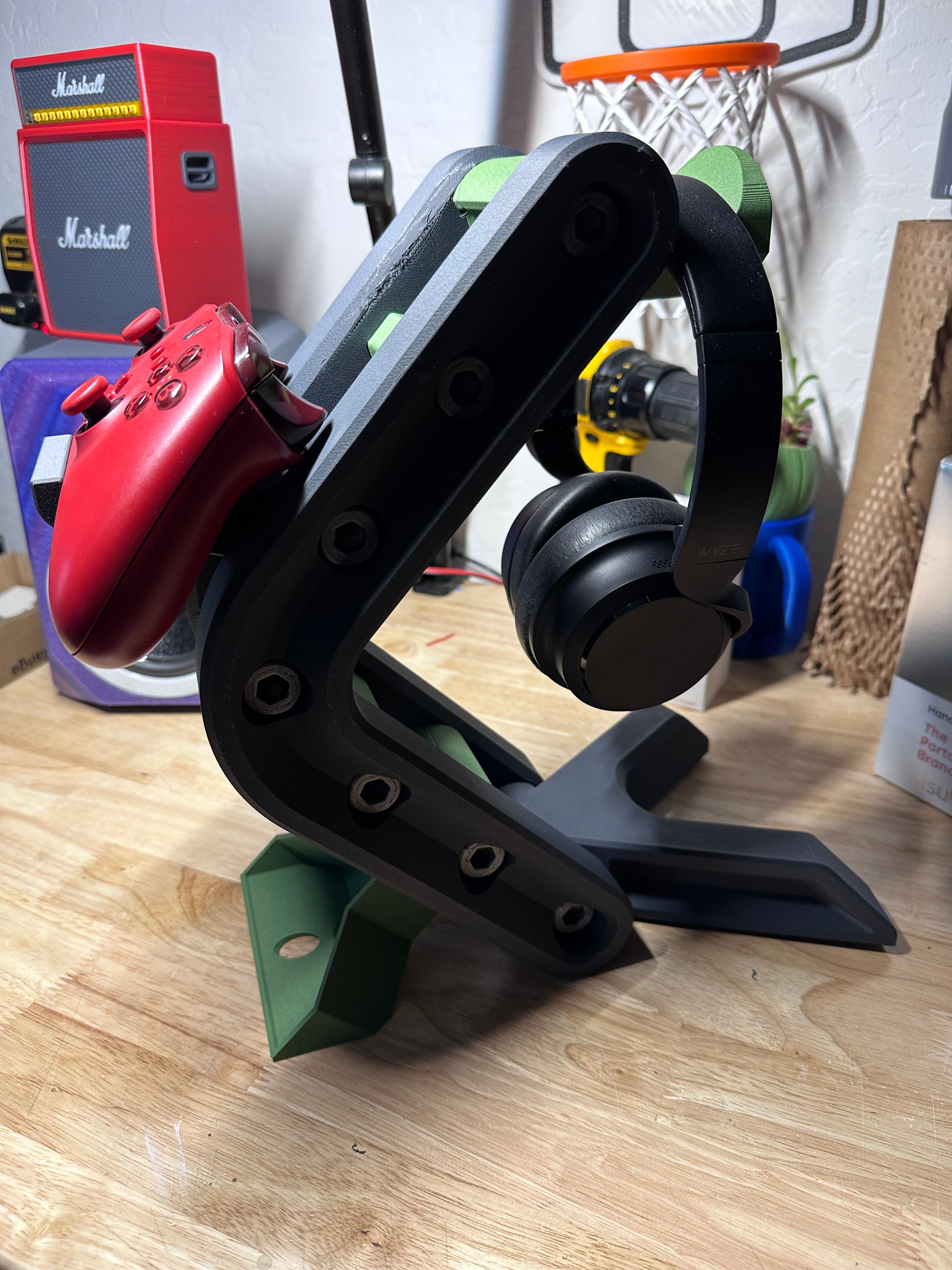 The headphone stand is designed to accommodate multiple headsets, allowing you to easily hang your entire collection. Additionally, the design includes a practical controller holder, which can be expanded by adding more units as needed. This makes it a versatile solution that can be adapted to your specific setup and keep your area tidy.