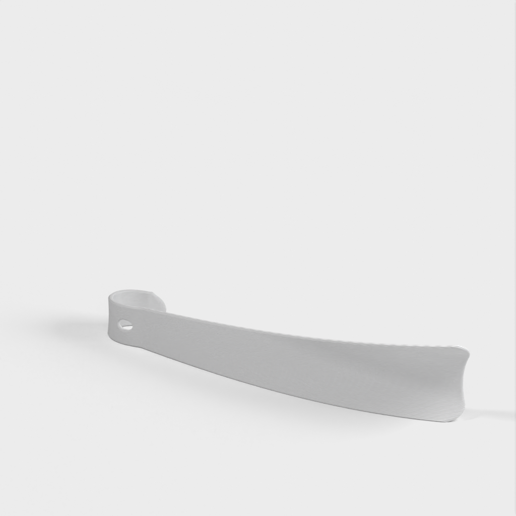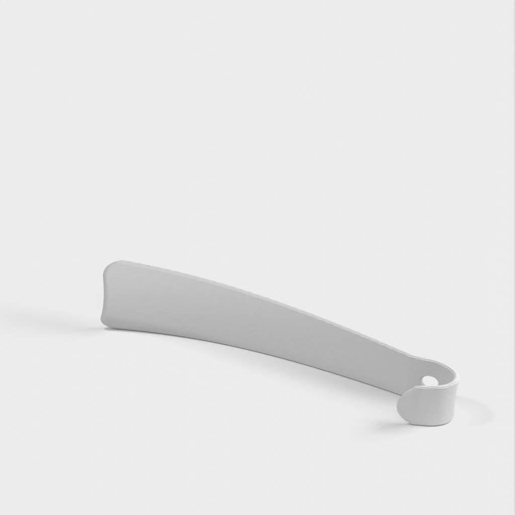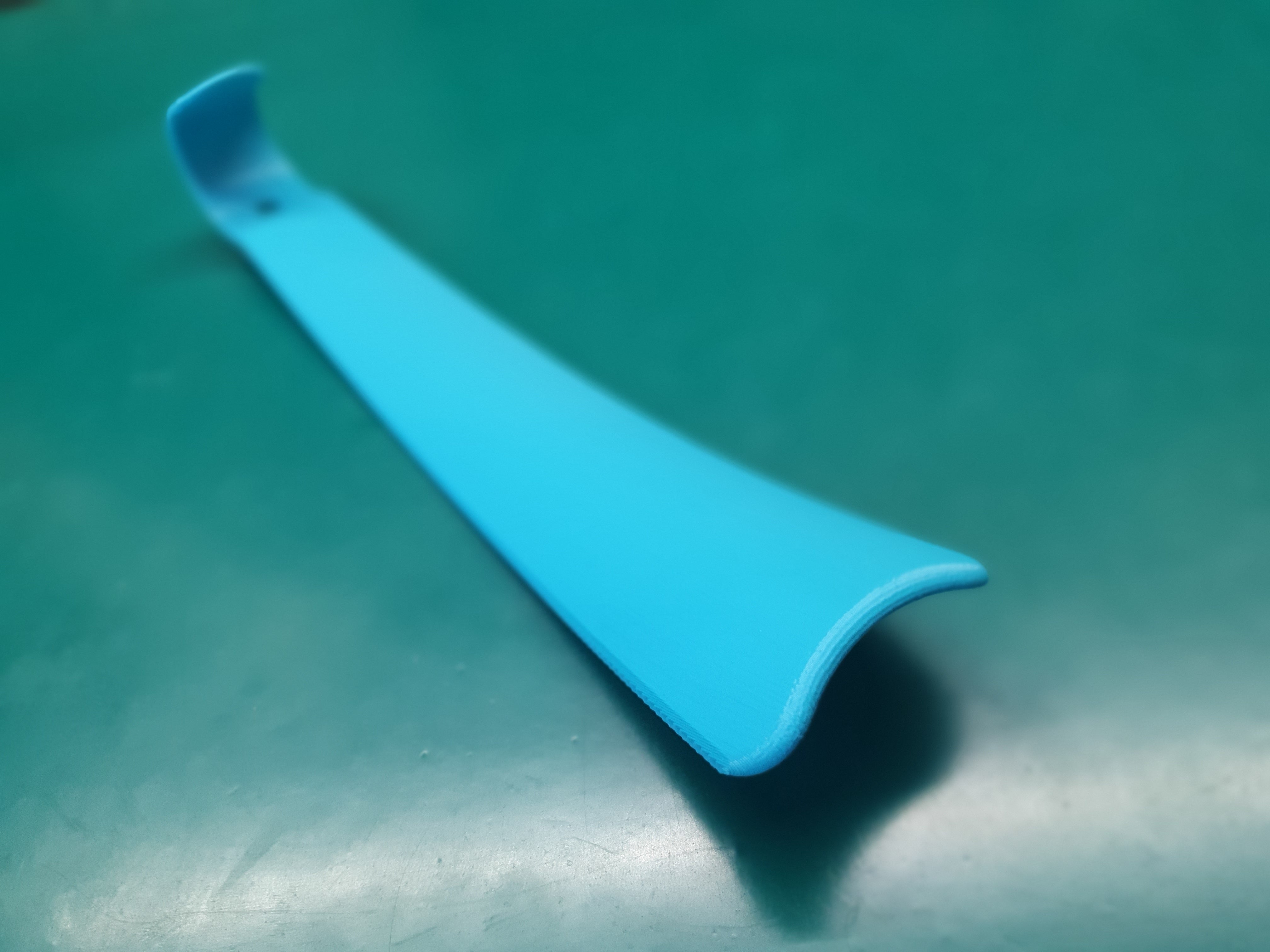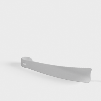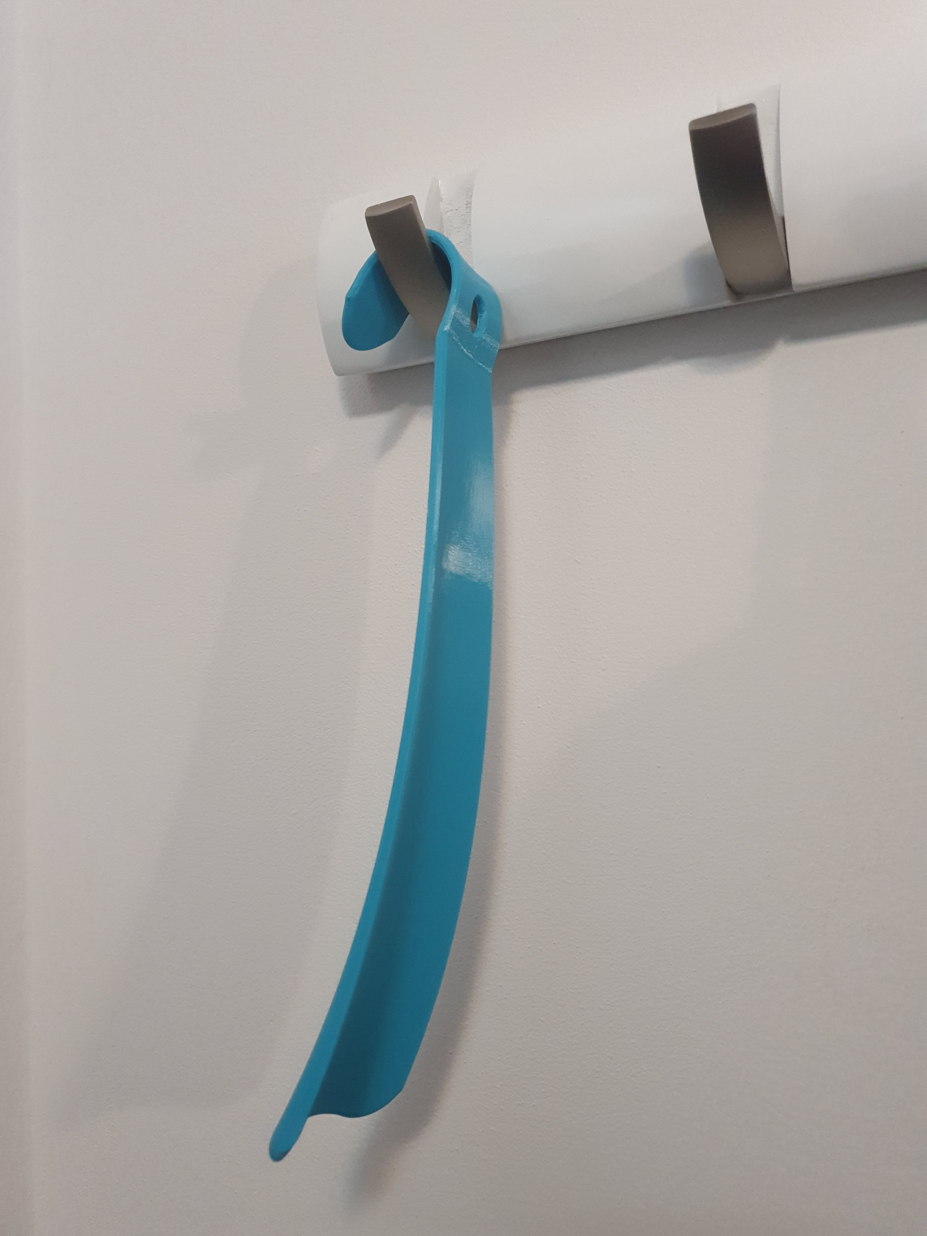 Large shoehorn with an angled end that allows it to be hung on any hanger. Its long shape (27.8 cm) is ideal for those who have difficulty reaching their feet. No support is required for this product. Important to note, it is crucial to nail the paint on the inside of the round part to prevent unwanted artifacts.