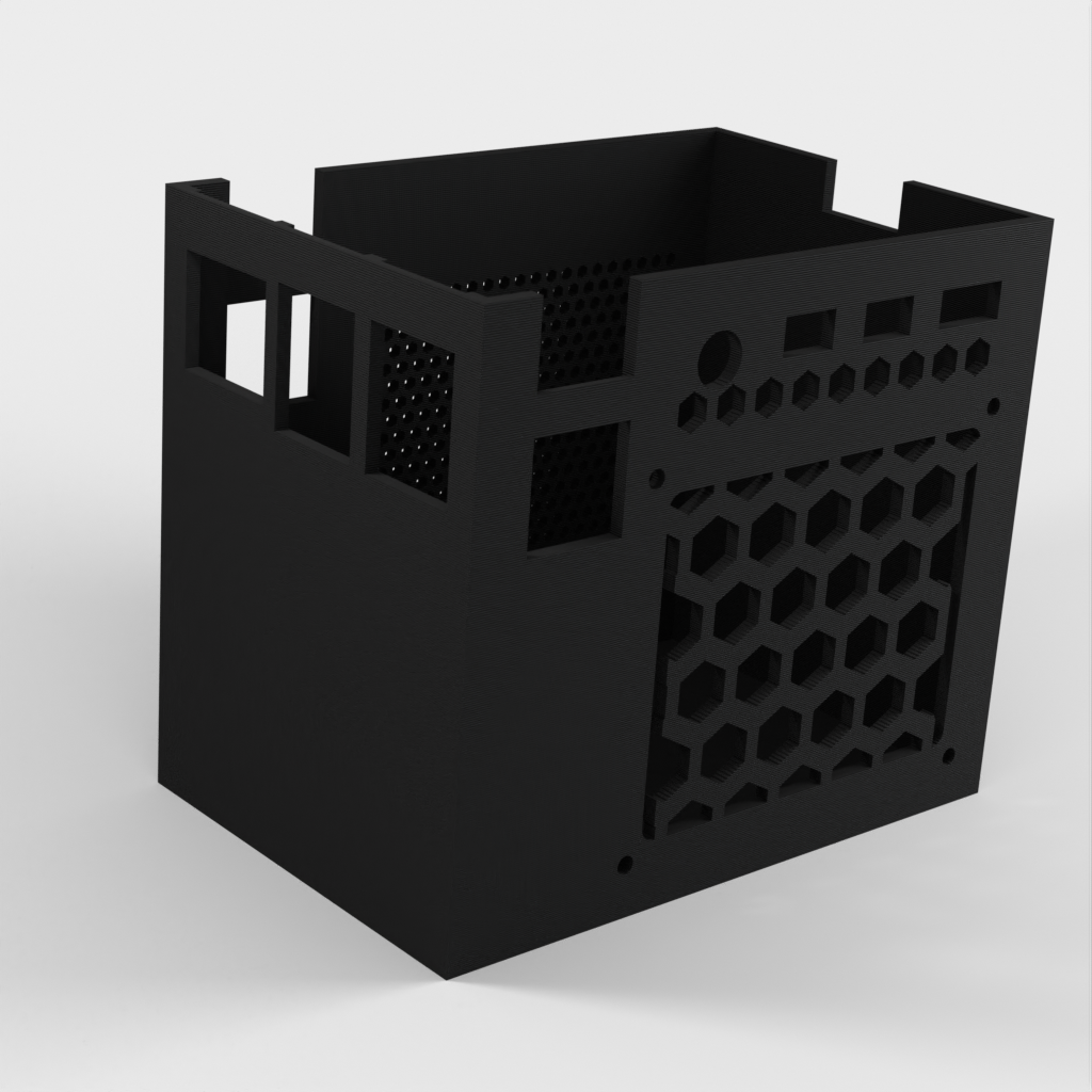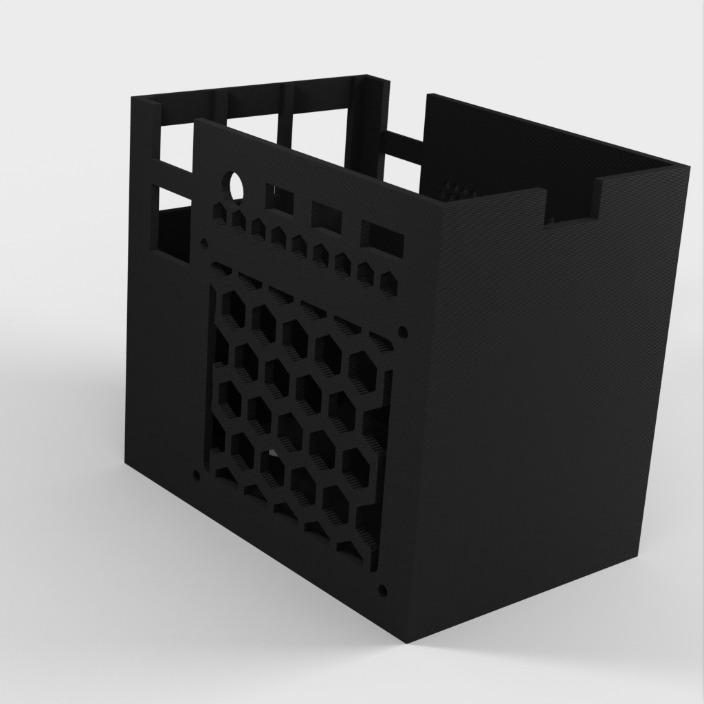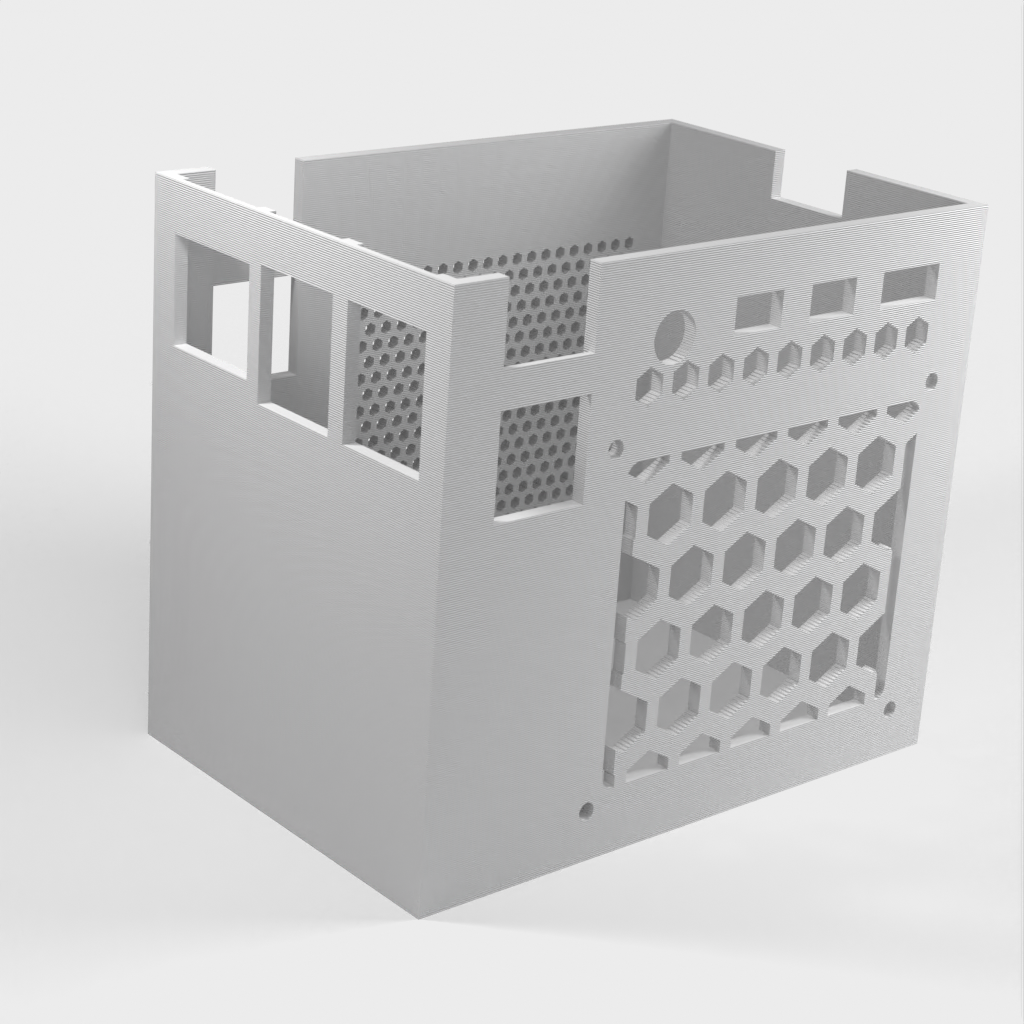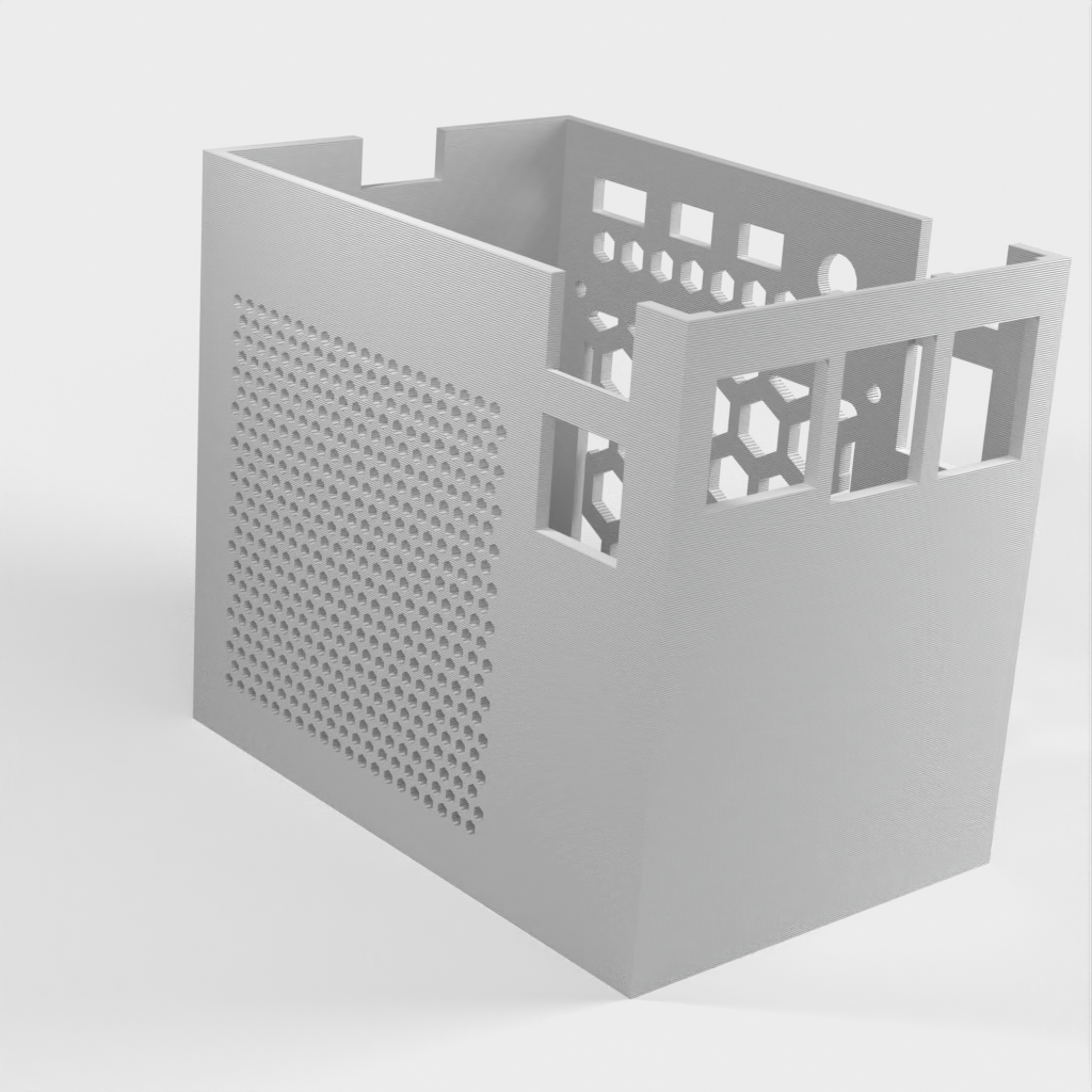 Dette er en minimalistisk kasse til Raspberry Pi 4, som passer til en Ice Tower-køler. Det øverste design af kassen har større hexagoner på bagsiden, hvilket gør det nemmere at printe. Efter print kan disse hexagoner fjernes for at give kassen et pænere udseende med den akrylplade, der følger med Ice Tower-køleren, monteret på siden af kassen. Klipsene og bunddelen af kassen er justeret for at passe bedre sammen og understøtte flere diametre af gummifødder.