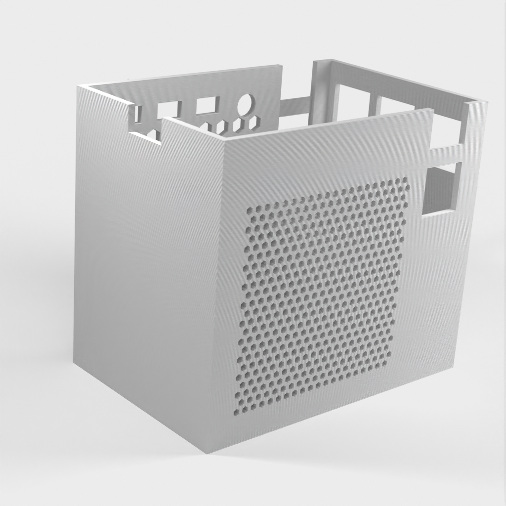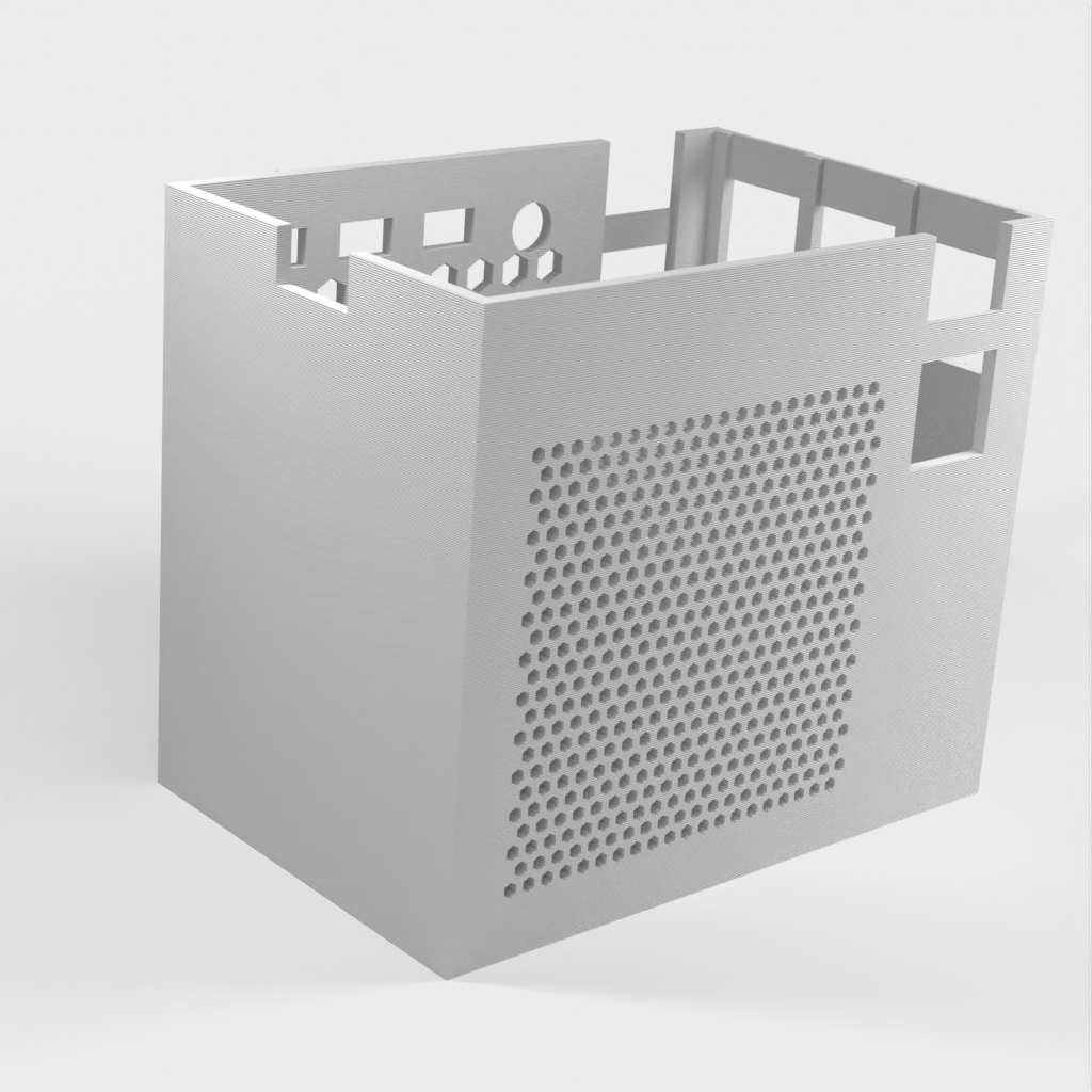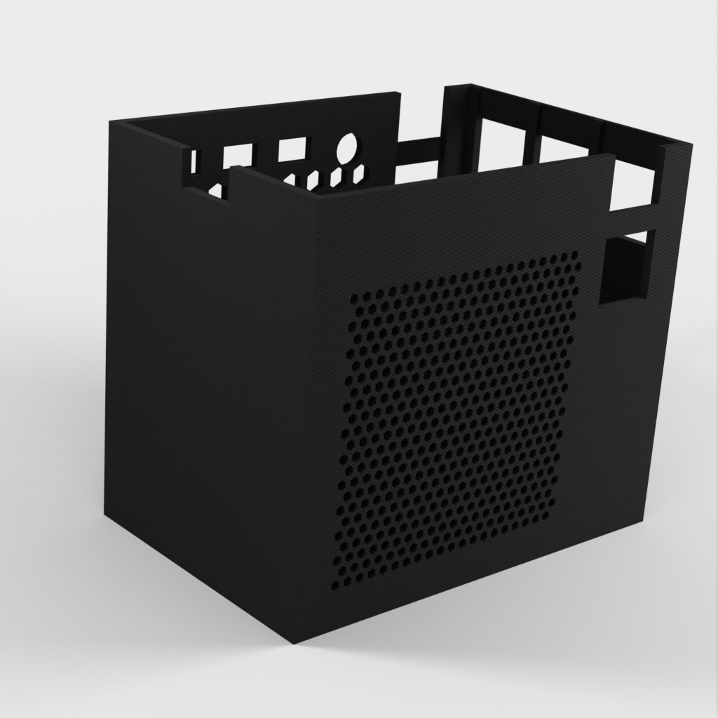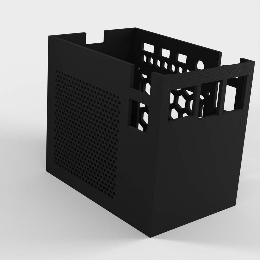Dette er en minimalistisk kasse til Raspberry Pi 4, som passer til en Ice Tower-køler. Det øverste design af kassen har større hexagoner på bagsiden, hvilket gør det nemmere at printe. Efter print kan disse hexagoner fjernes for at give kassen et pænere udseende med den akrylplade, der følger med Ice Tower-køleren, monteret på siden af kassen. Klipsene og bunddelen af kassen er justeret for at passe bedre sammen og understøtte flere diametre af gummifødder.