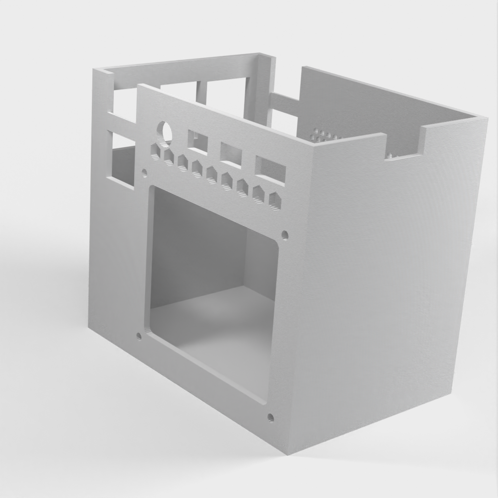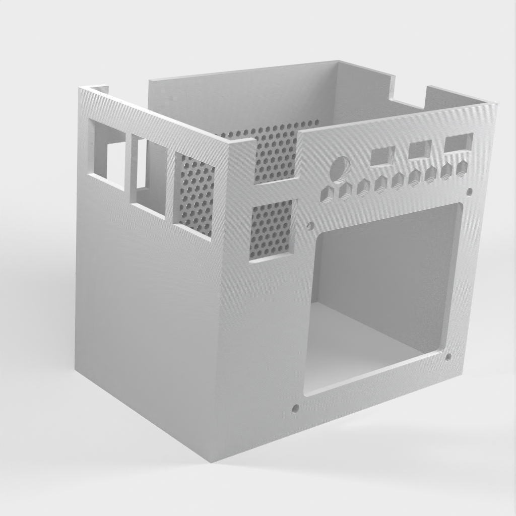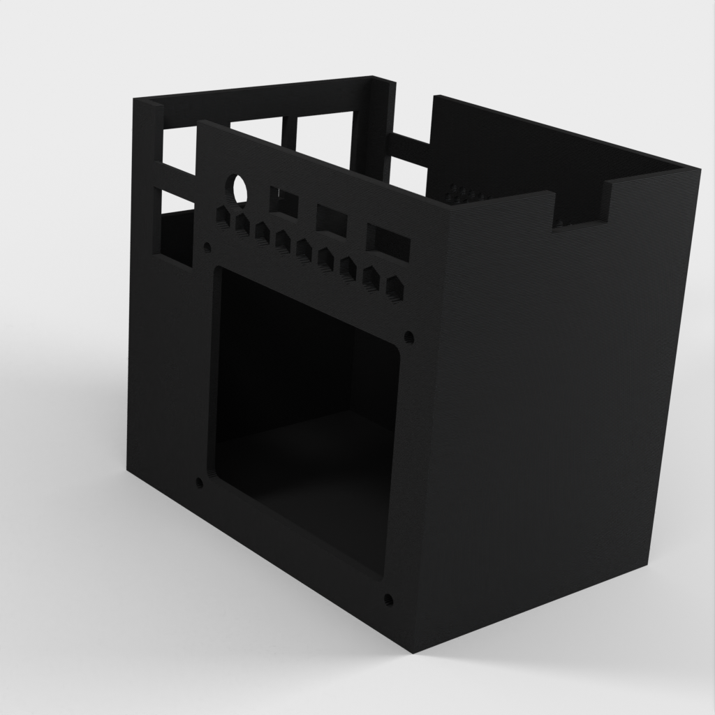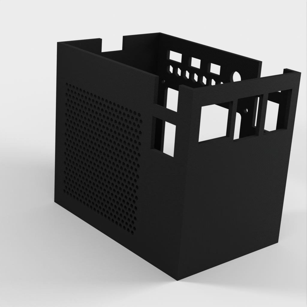 Dette er en minimalistisk kasse til Raspberry Pi 4, som passer til en Ice Tower-køler. Det øverste design af kassen har større hexagoner på bagsiden, hvilket gør det nemmere at printe. Efter print kan disse hexagoner fjernes for at give kassen et pænere udseende med den akrylplade, der følger med Ice Tower-køleren, monteret på siden af kassen. Klipsene og bunddelen af kassen er justeret for at passe bedre sammen og understøtte flere diametre af gummifødder.