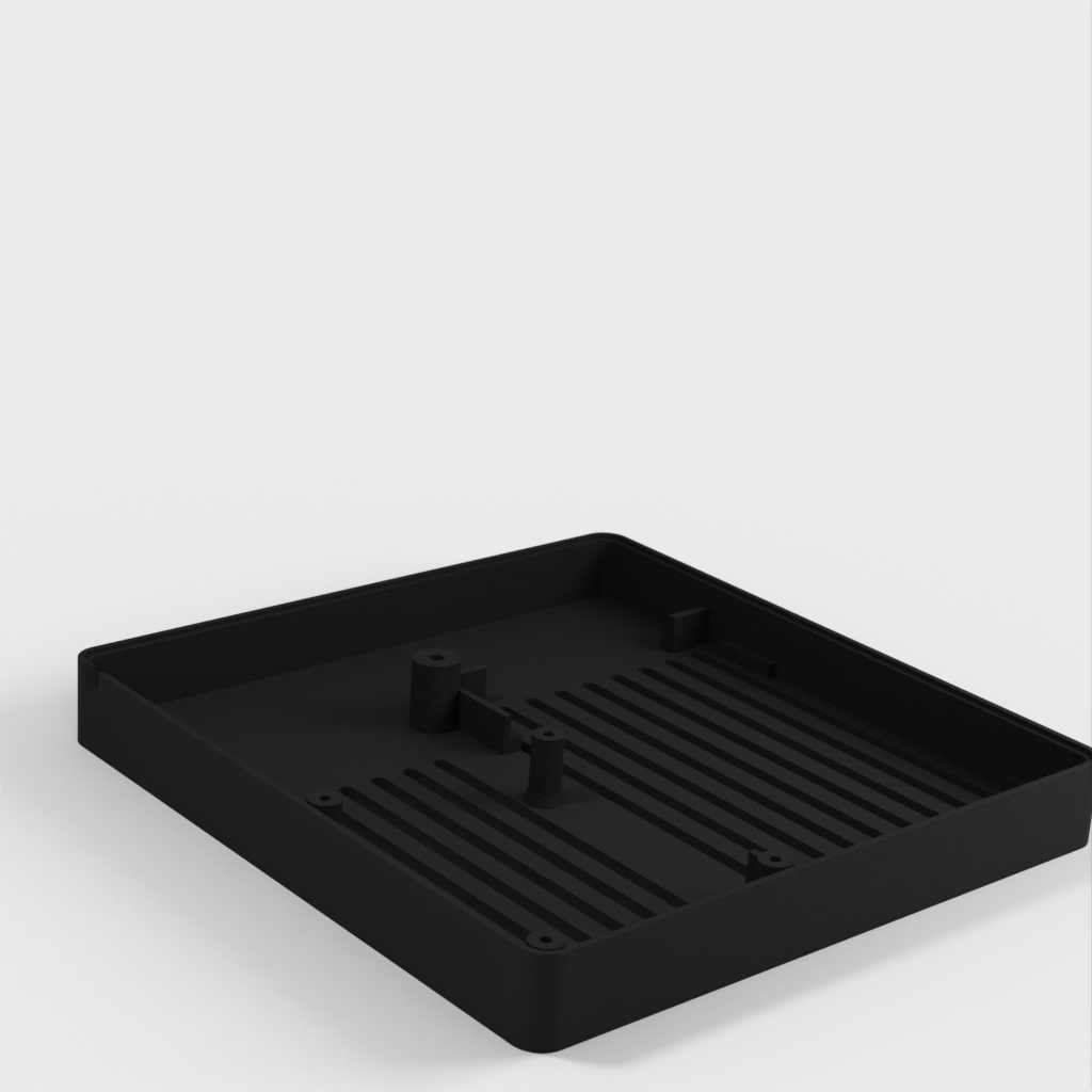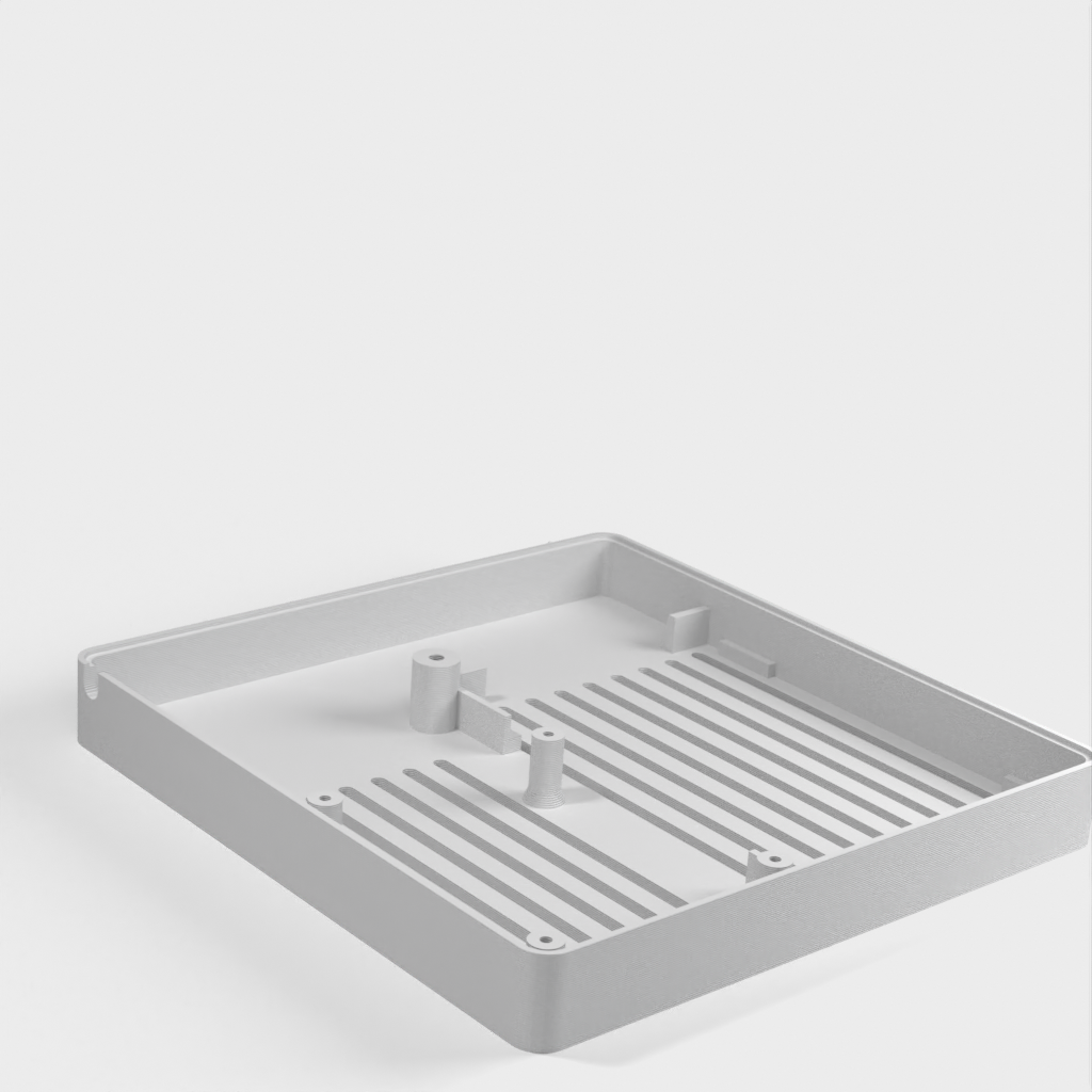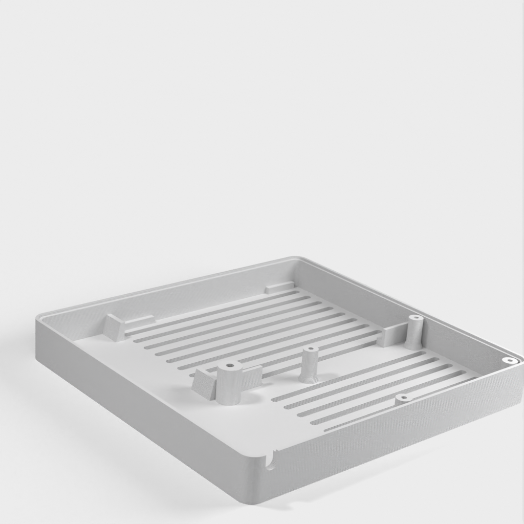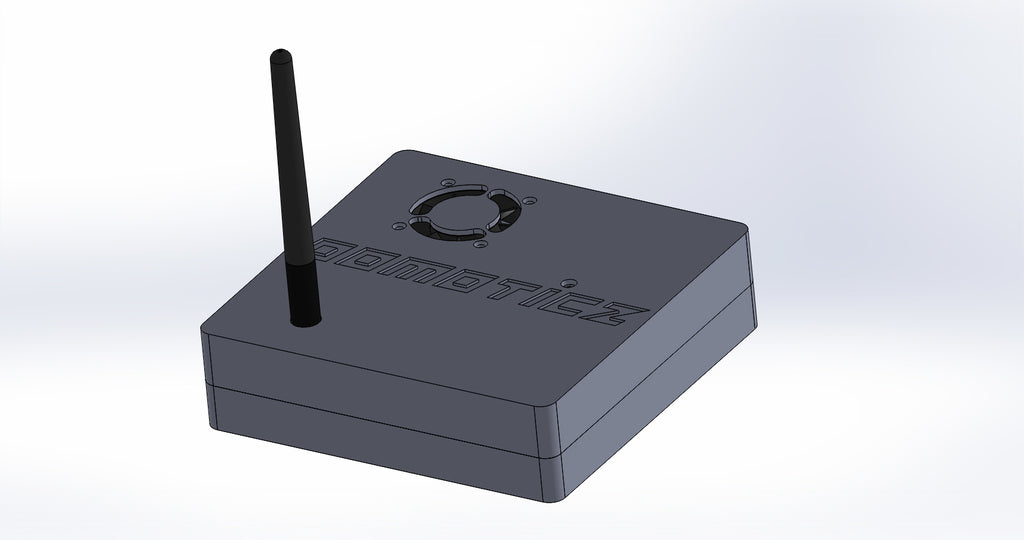 Personlig kasse til Domoticz, der indeholder Raspberry Pi, Pi Drive, RFX.com, Aeon stick z wave. En 40 mm ventilator skal monteres på topdækslet. Husk at tilføje puder under kassen for at sikre optimal køling. Der er foretaget ændringer i henhold til tekniske tegninger, herunder ændring af placeringen af Raspberry's huller og hævning af Raspberry-bordet. En del af topdækslet er blevet gjort tyndere for at tillade visualisering af LED-status gennem transparent materiale.